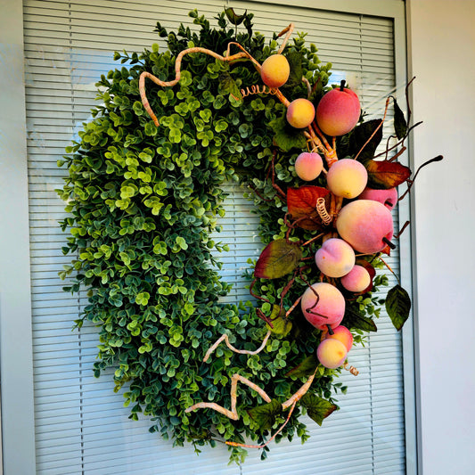 Front Door Wreath, Outdoor Double Door Decor, Spring Summer Oval Greenery Swag, Peaches Decoration, Fruit Eucalyptus & Boxwood Home Gift