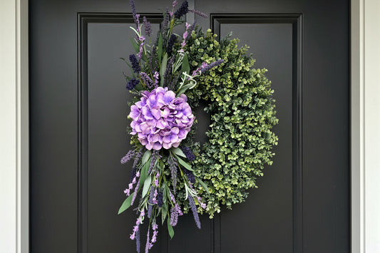 Spring Summer Fall Front Door Wreath, Double Door Decor, Purple Hydrangea Greenery Swag, Outdoor Porch Decoration, Unique Floral Home Gift