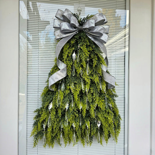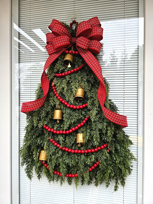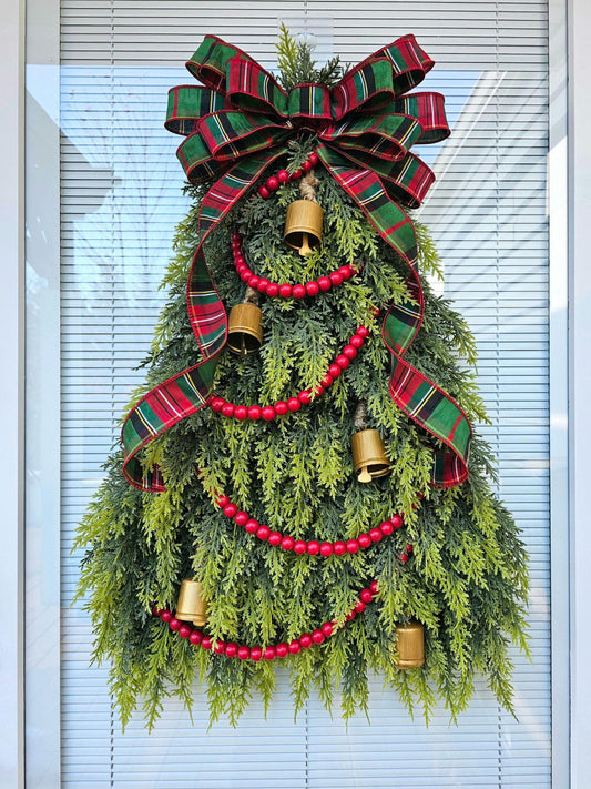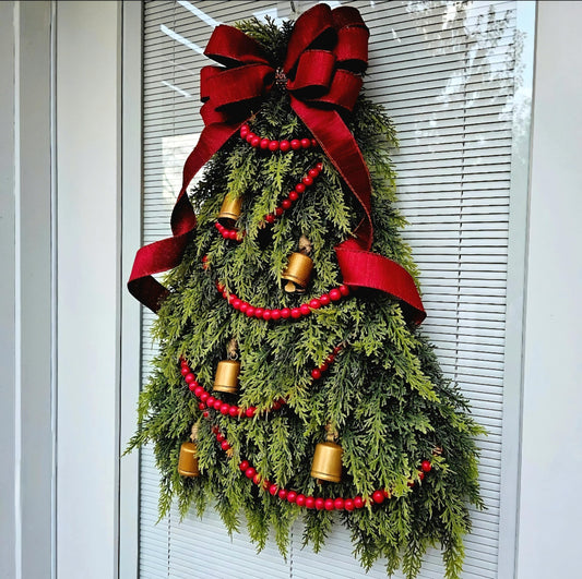 Christmas Tree Wreath For Front Door, Double Door, Winter Home Decor, Xmas Teardrop Holiday Swag & Bells, Gate Fence Decoration, House Gifts