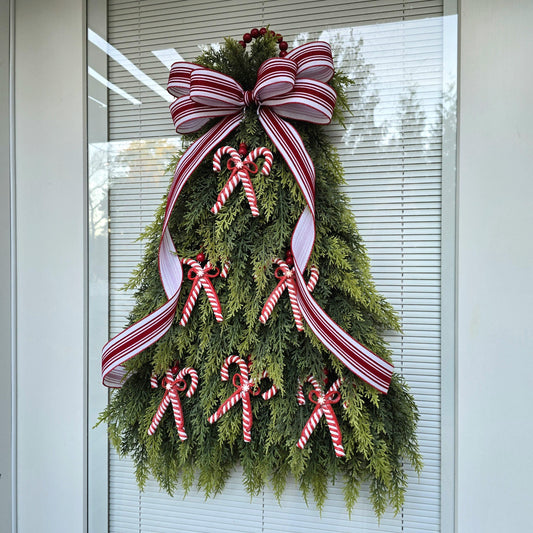 Christmas Wreath For Front Door, Double Door Decor, Outdoor Large Holiday Candy Cane Decoration, Xmas Tree Swag With Red & White Candycanes