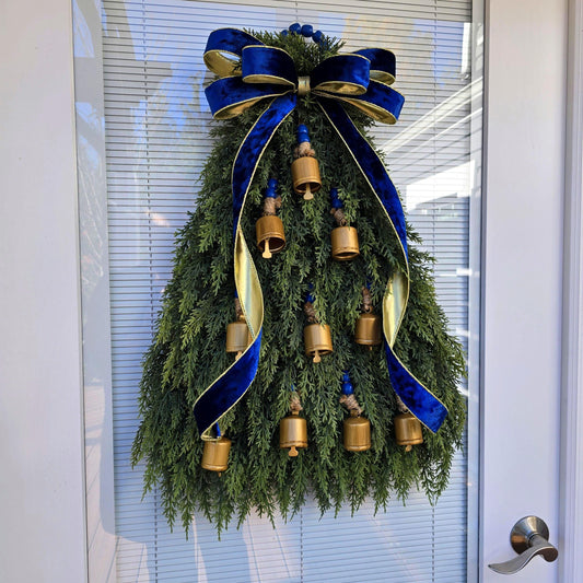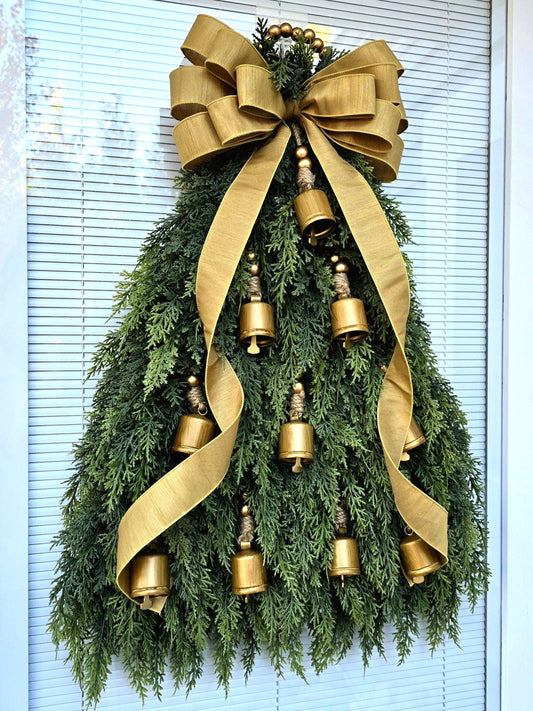 Christmas Tree Wreath For Front Door, Double Door Wreaths, Indoor Outdoor Xmas Swag - Cedar & Gold Bells, Holiday Teardrop, Home Gifts