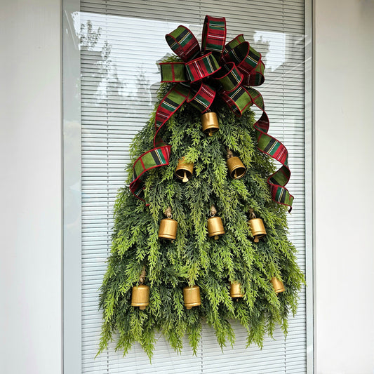 Christmas Tree Wreath For Front Door Double Doors Wreaths Holiday Porch Decor Winter Artificial Cedar & Bells Teardrop Swag Xmas Home Gift