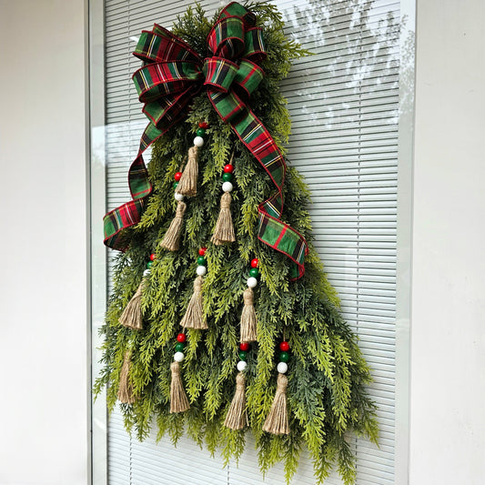 Christmas Tree Wreath For Front Door, Double Doors Wreaths, Xmas Tree Shaped Swag With Cedar, Bells, Traditional Plaid Bow, Unique Home Gift