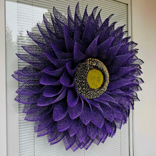 Sunflower Wreath For Front Door, Double Door, Outdoor Spring Summer Fall Porch Decor, Seasonal Decoration, Purple Burlap Flower, Home Gift