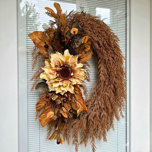 Fall Wreath For Front Door, Double Door Wreaths, Outdoor Porch Decor, Autumn, Thanksgiving, Neutral Sunflower Decoration, Home Gift