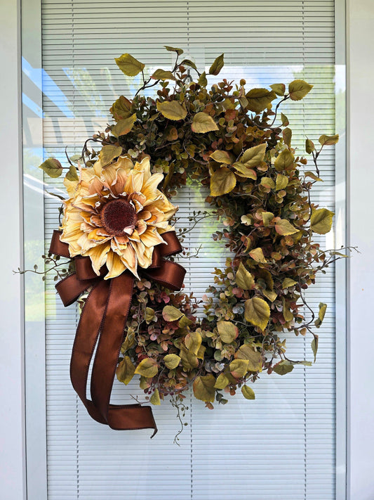 FALL WREATH For Front Door, Double Doors, Outdoor Autumn Harvest Porch Decor, Thanksgiving Oval Decoration, Sunflower & Eucalyptus Home Gift
