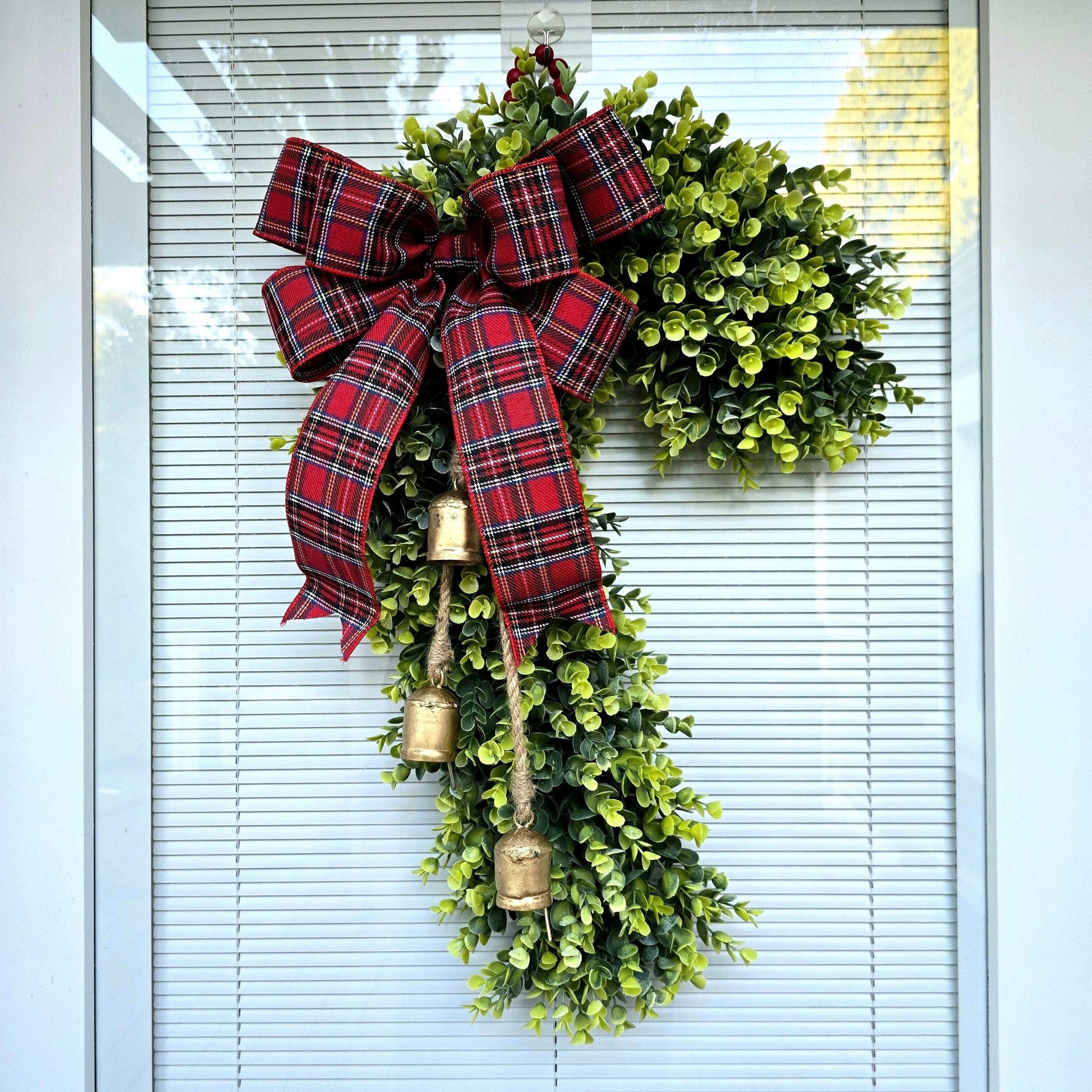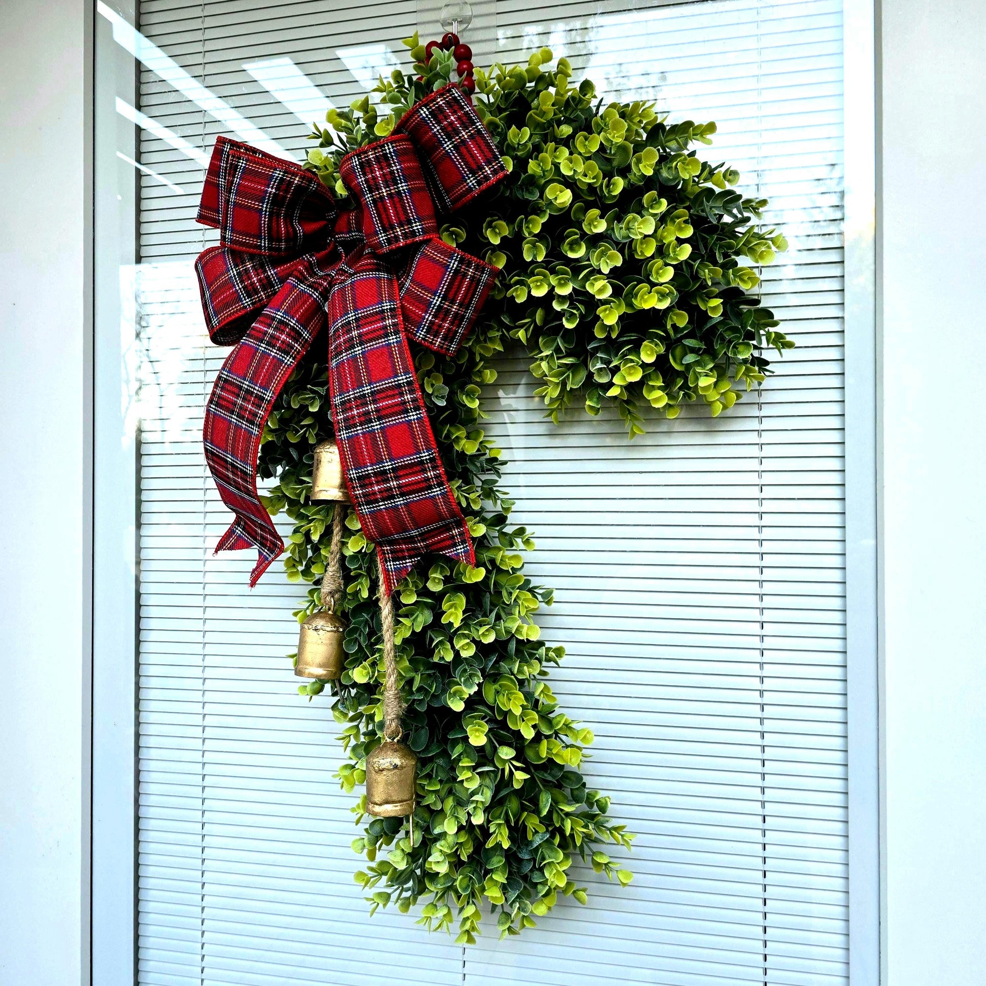 Add a touch of festive elegance to your home this holiday season with this stunning handcrafted Candy Cane Wreath. Created on a sturdy wreath board, this unique design features eucalyptus, gold bells, and a plaid bow. This wreath is a beautiful statement piece for any holiday decor, perfect for your front door, wall, or mantle.
