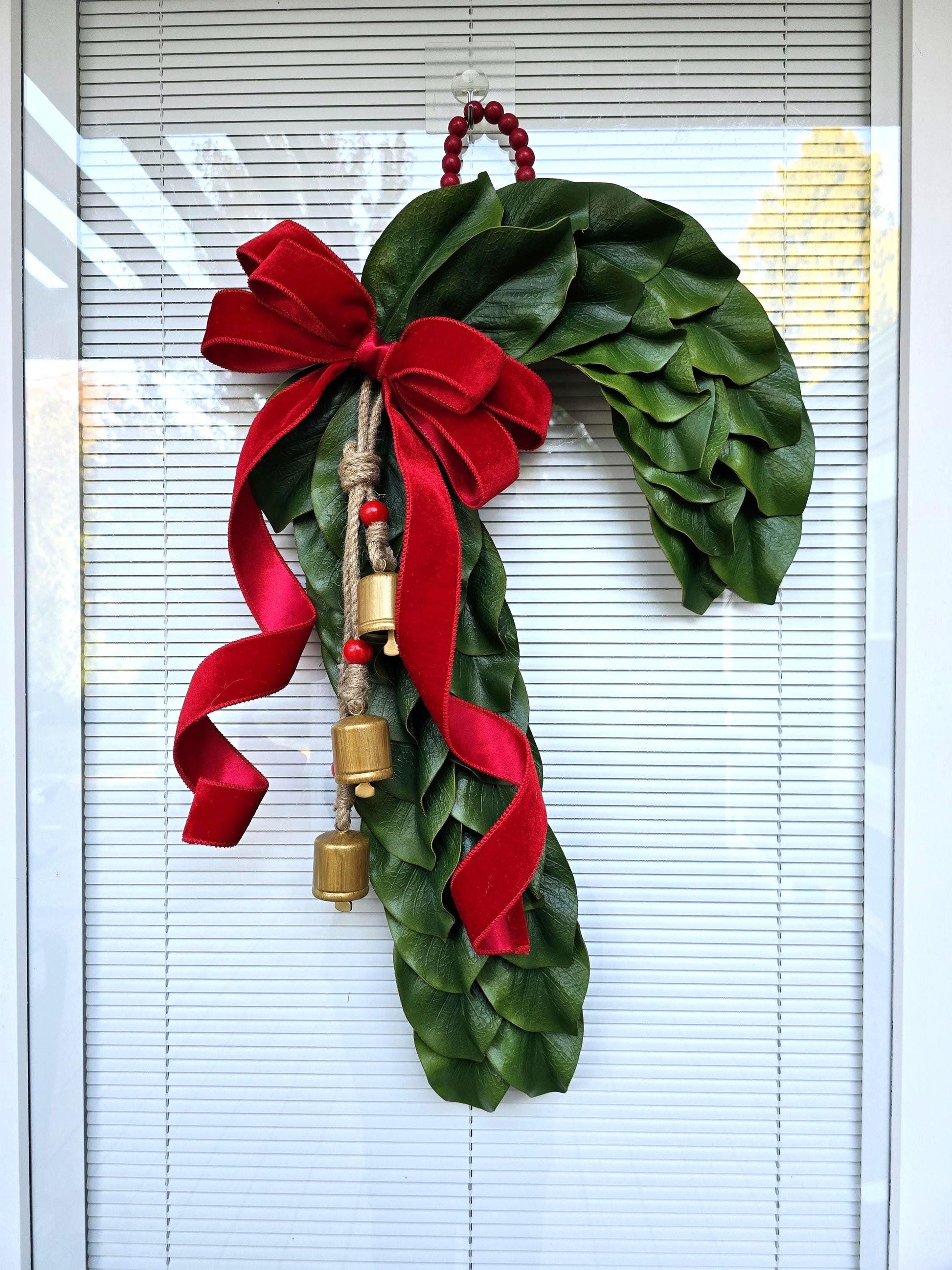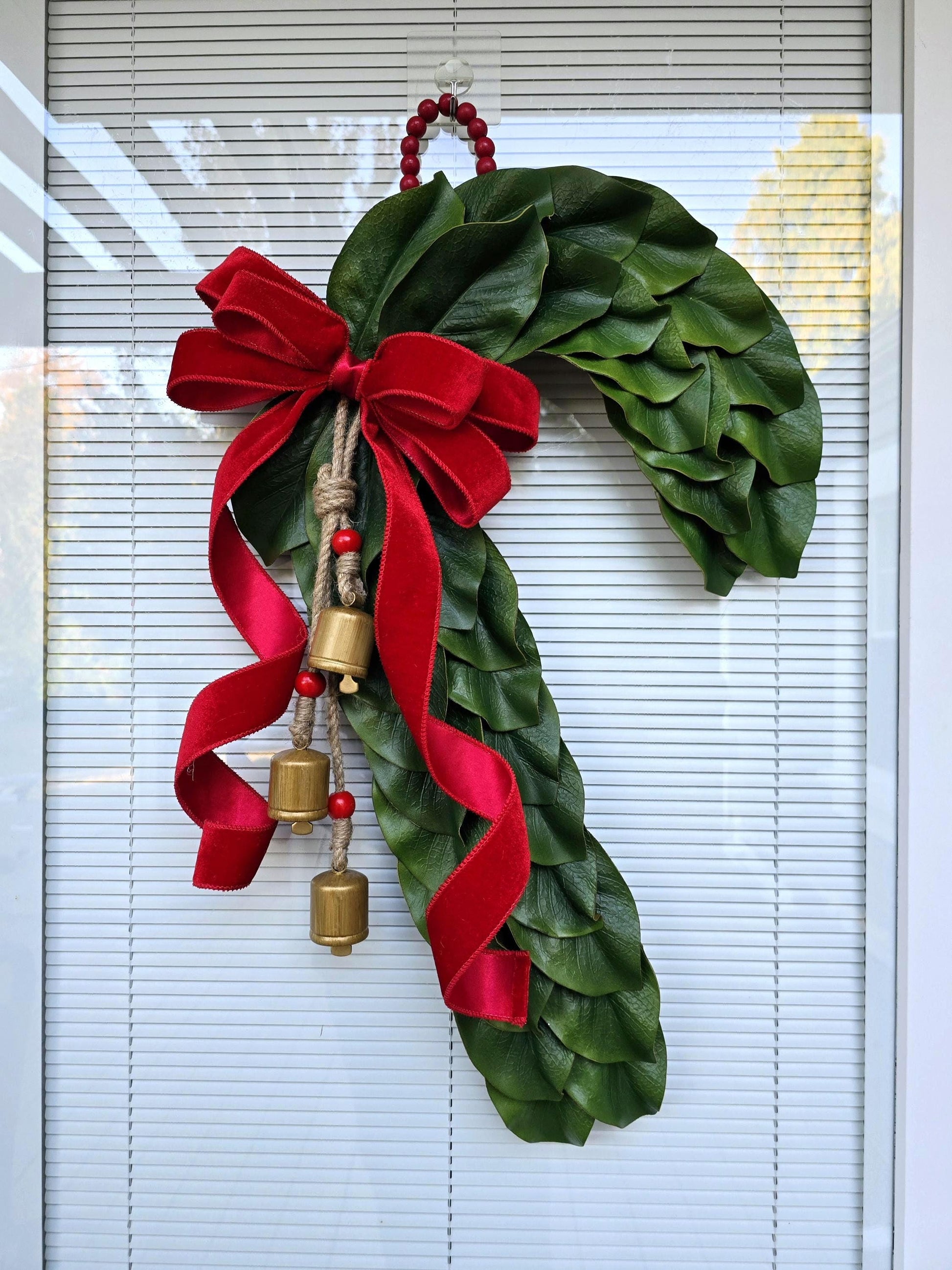 Add a touch of festive elegance to your home this holiday season with this stunning handcrafted Candy Cane Wreath. Created on a sturdy wreath board, this unique design features magnolia leaves, glittery gold accents, and a luxurious red velvet bow. Perfect for your front door, wall, or mantle, this wreath is a beautiful statement piece for any holiday decor.