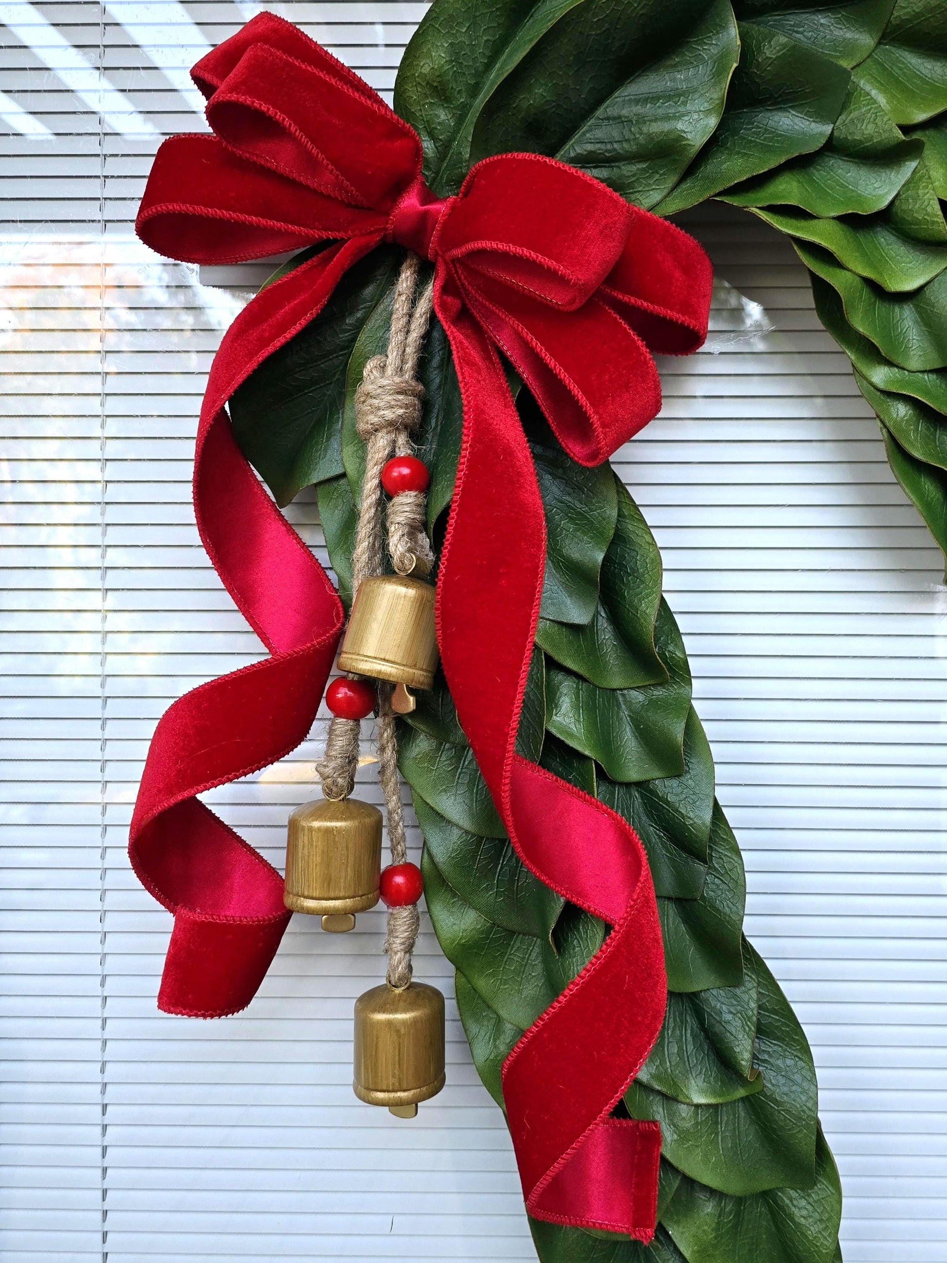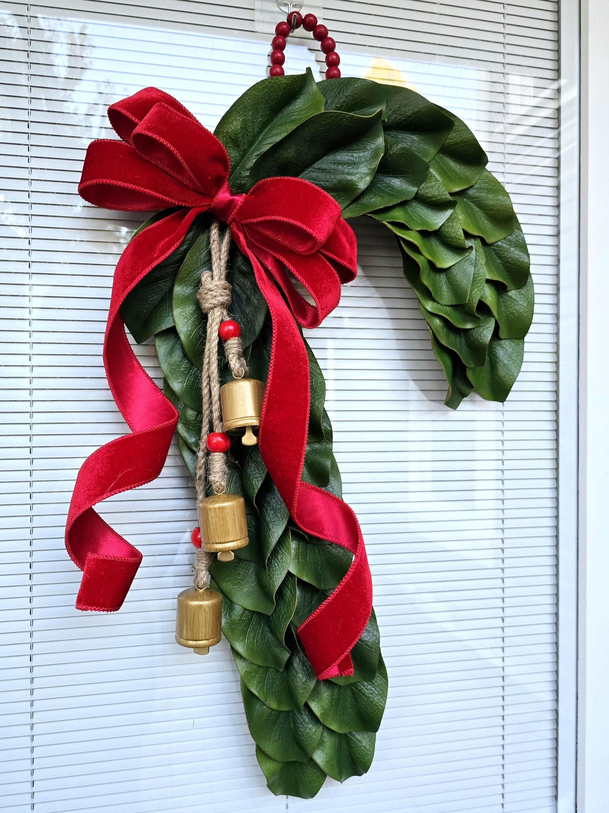 š¬ Materials: Realistic faux magnolia leaves, glittery gold accents, red velvet satin backing wired bow