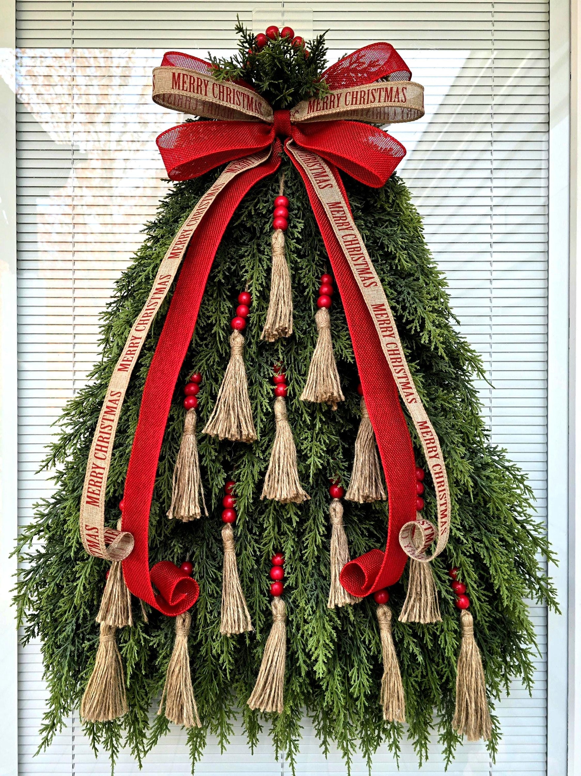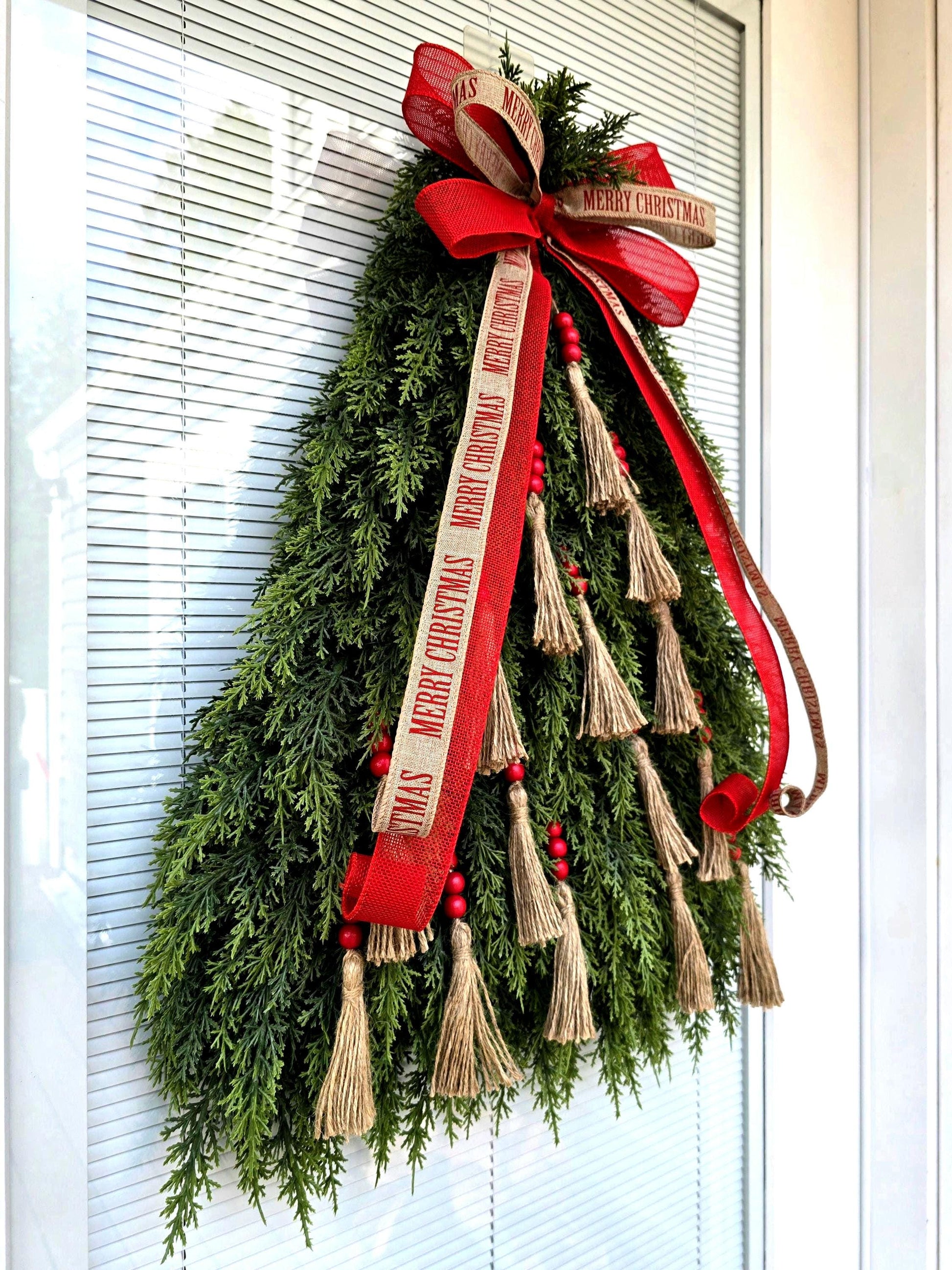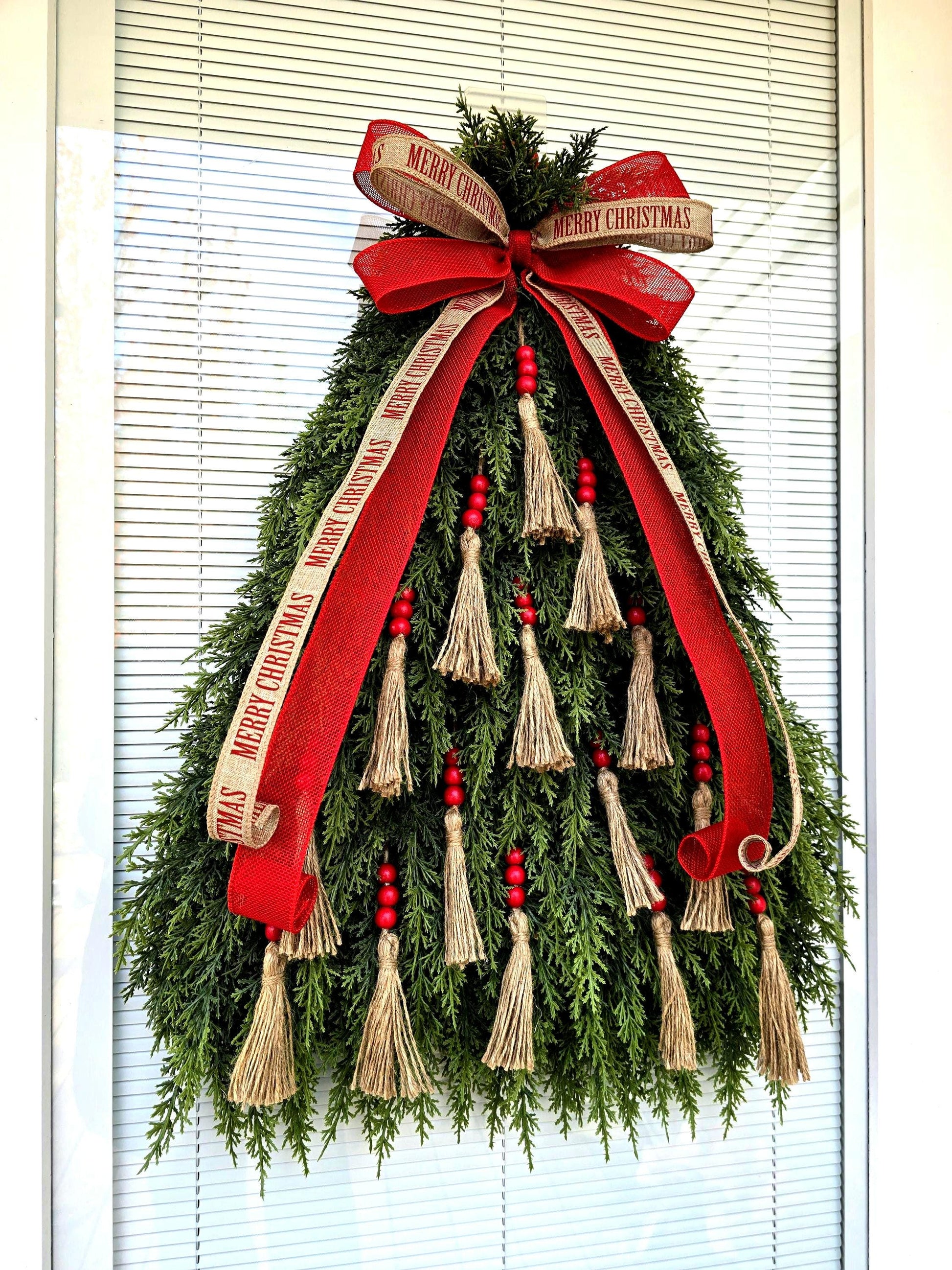 Bring festive charm to your home with this handcrafted Christmas tree wreath, which is ideal for indoor or outdoor use. It's perfect for front doors, porches, or a holiday wall decoration.