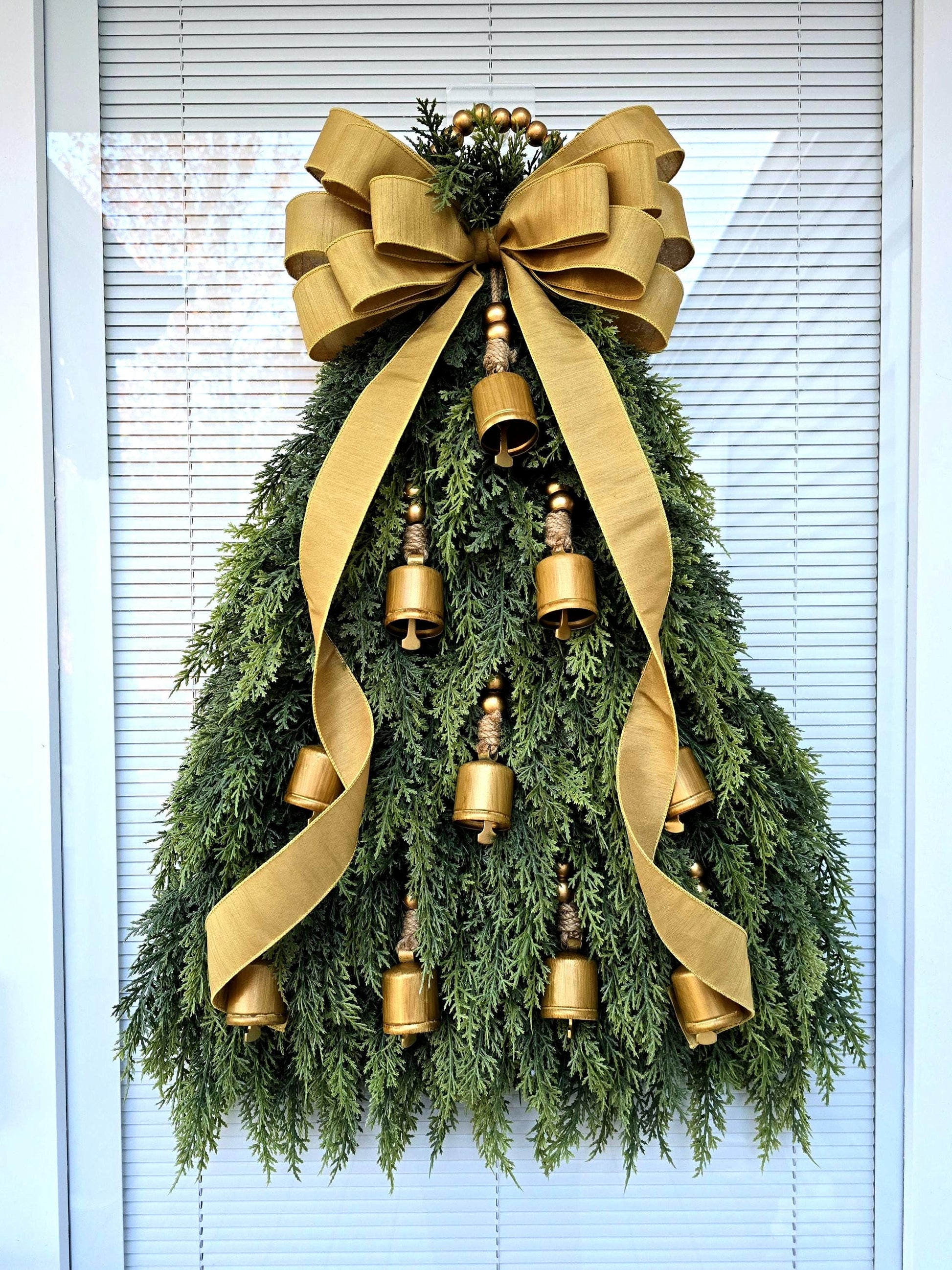 Christmas Tree Wreath For Front Door, Double Door, Winter Home Decor, Xmas Teardrop Holiday Swag & Bells, Gate Fence Decoration, House Gifts