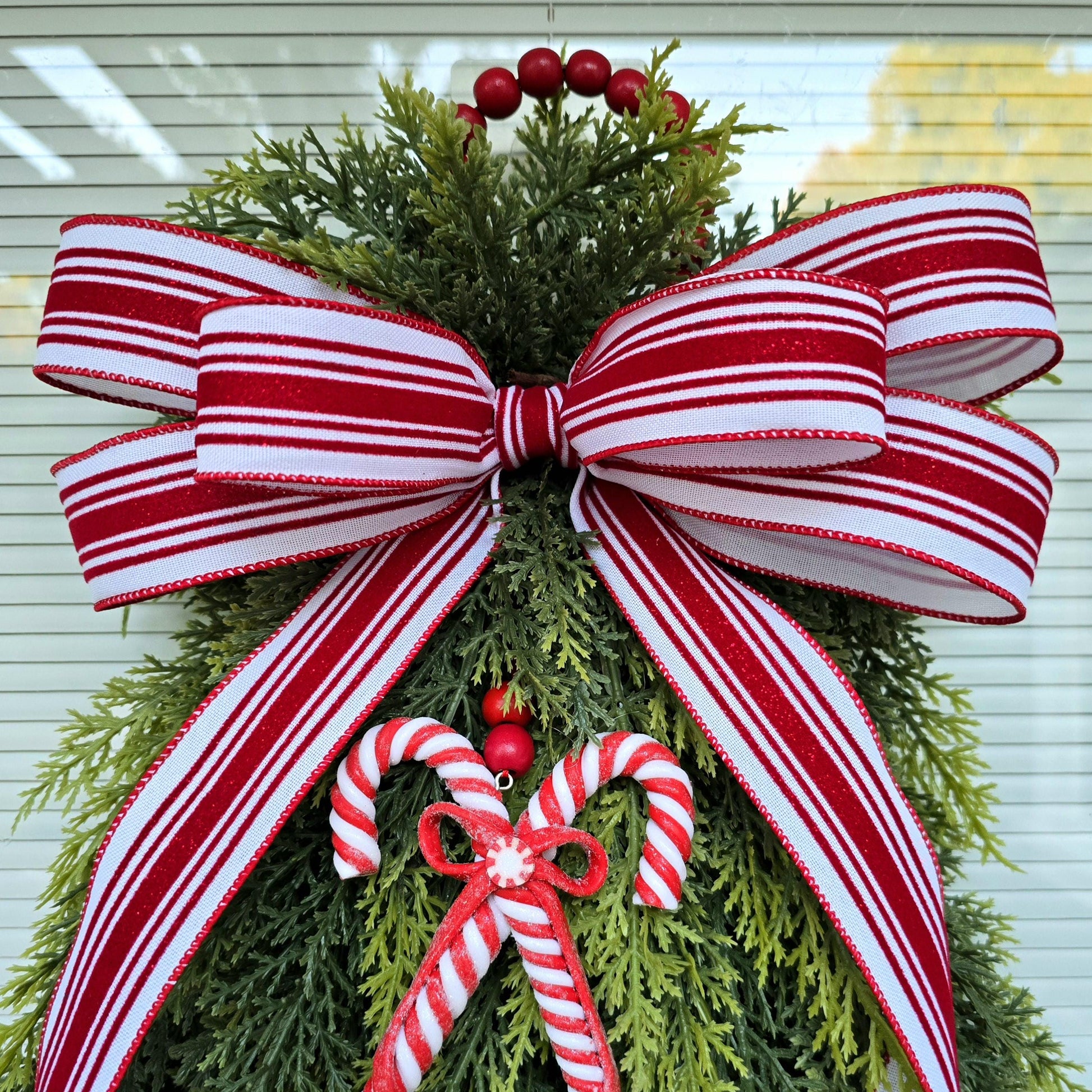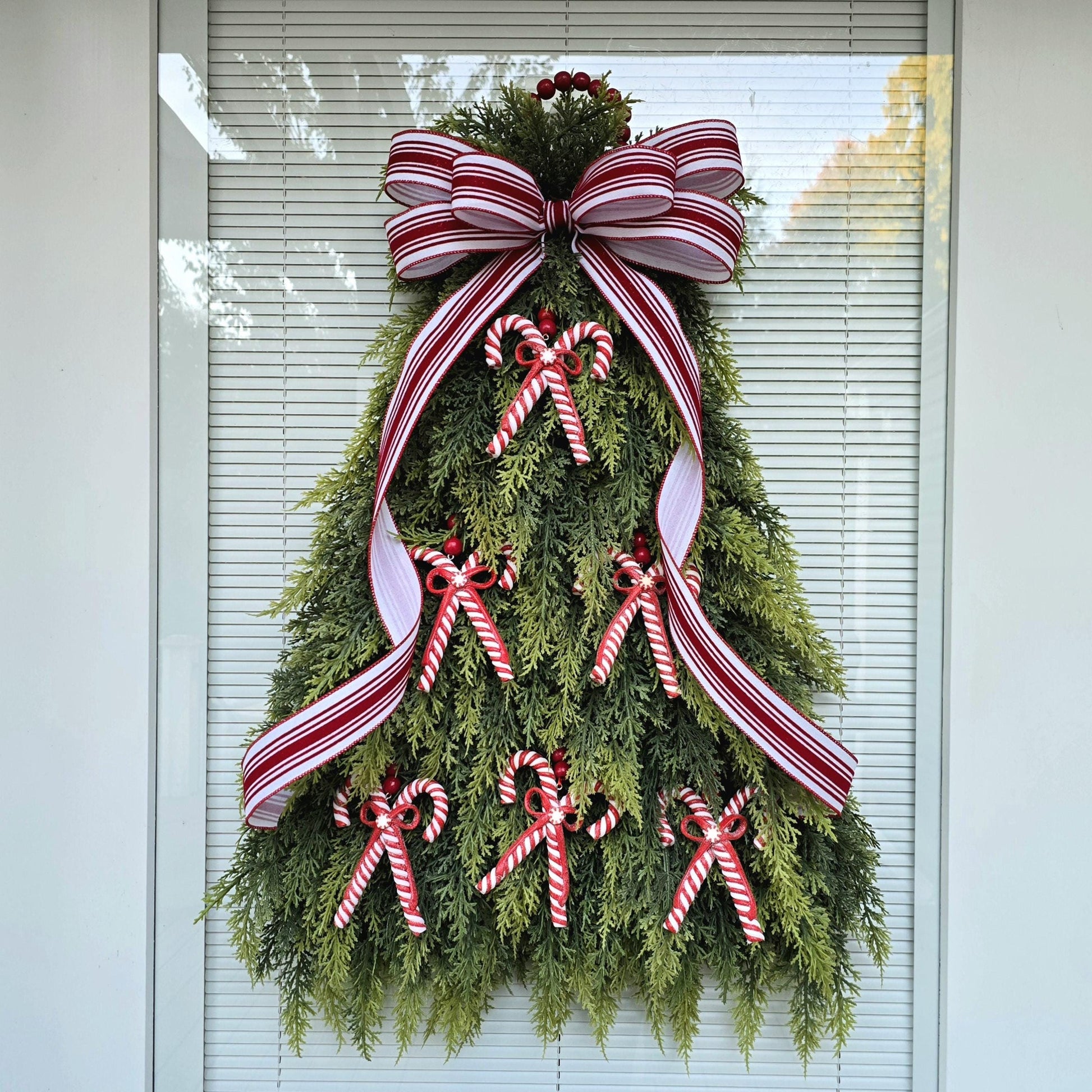 Christmas Wreath For Front Door, Double Door Decor, Outdoor Large Holiday Candy Cane Decoration, Xmas Tree Swag With Red & White Candycanes