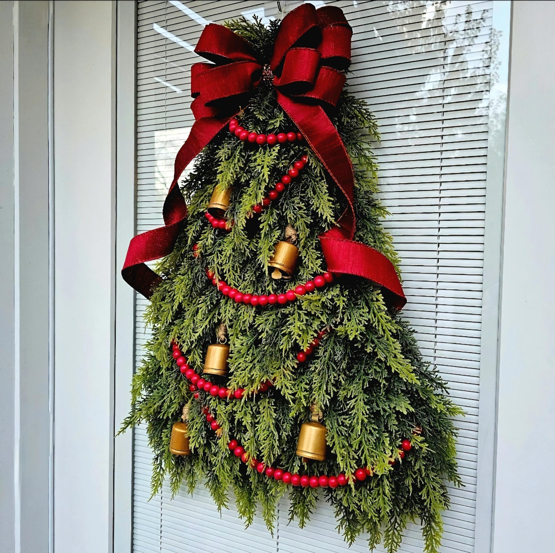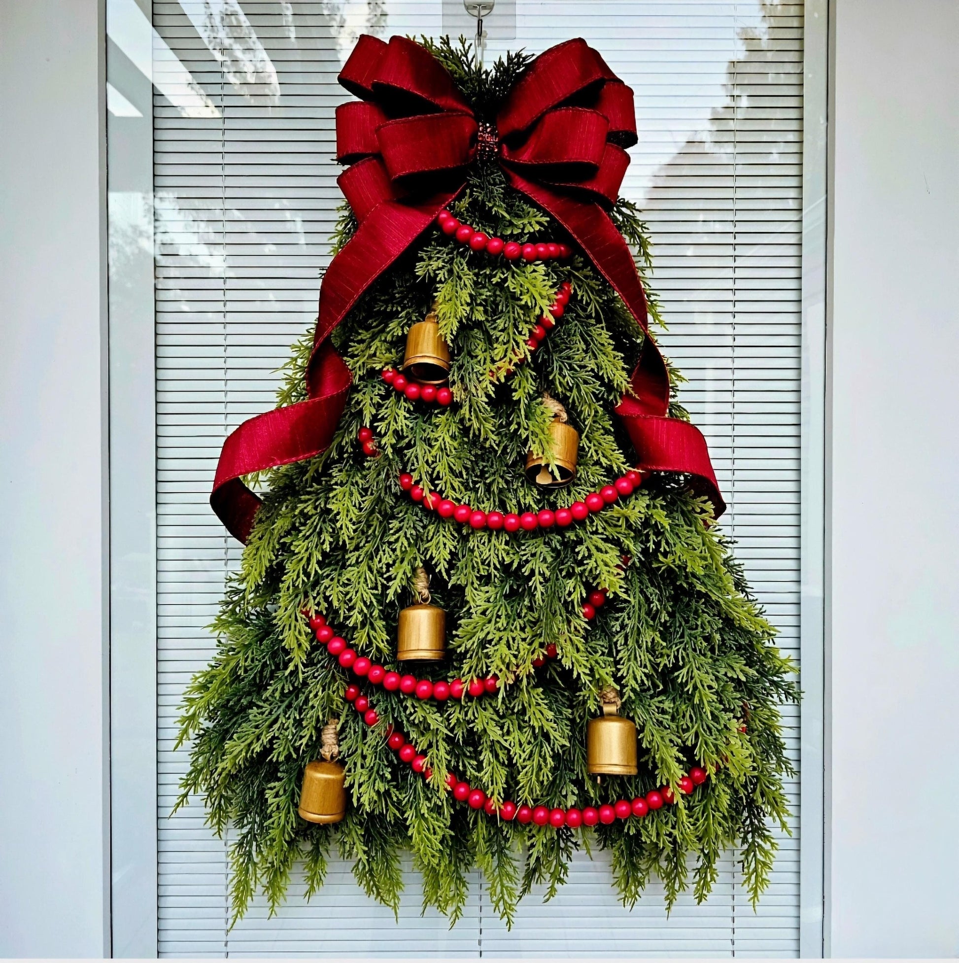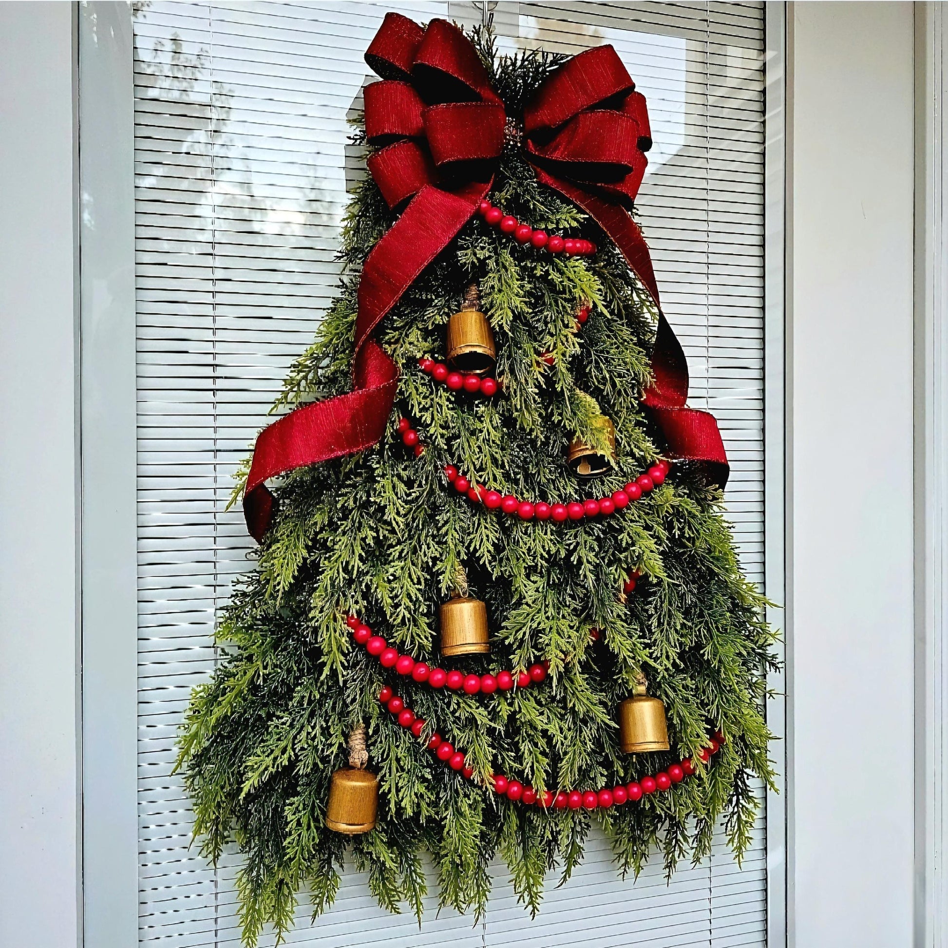 Christmas Wreaths For Front Door, Double Door, Unique Holiday Teardrop Swag & Bells, Winter Xmas Tree Shaped Home Decor, Elegant House Gift