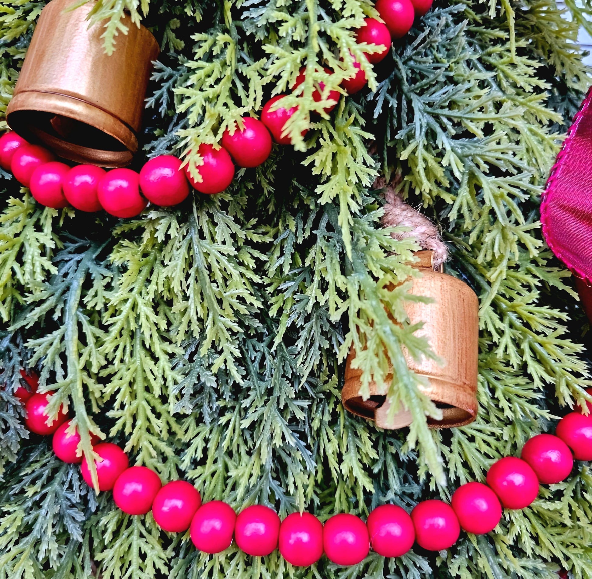 Bring festive charm to your home with these handcrafted Christmas wreaths, perfect for indoor or outdoor use. Ideal for front doors, porches, or as holiday wall decorations, each wreath features soft-touch cedar, gold bells, red wooden beaded garland, and a luxurious velvet red bow.