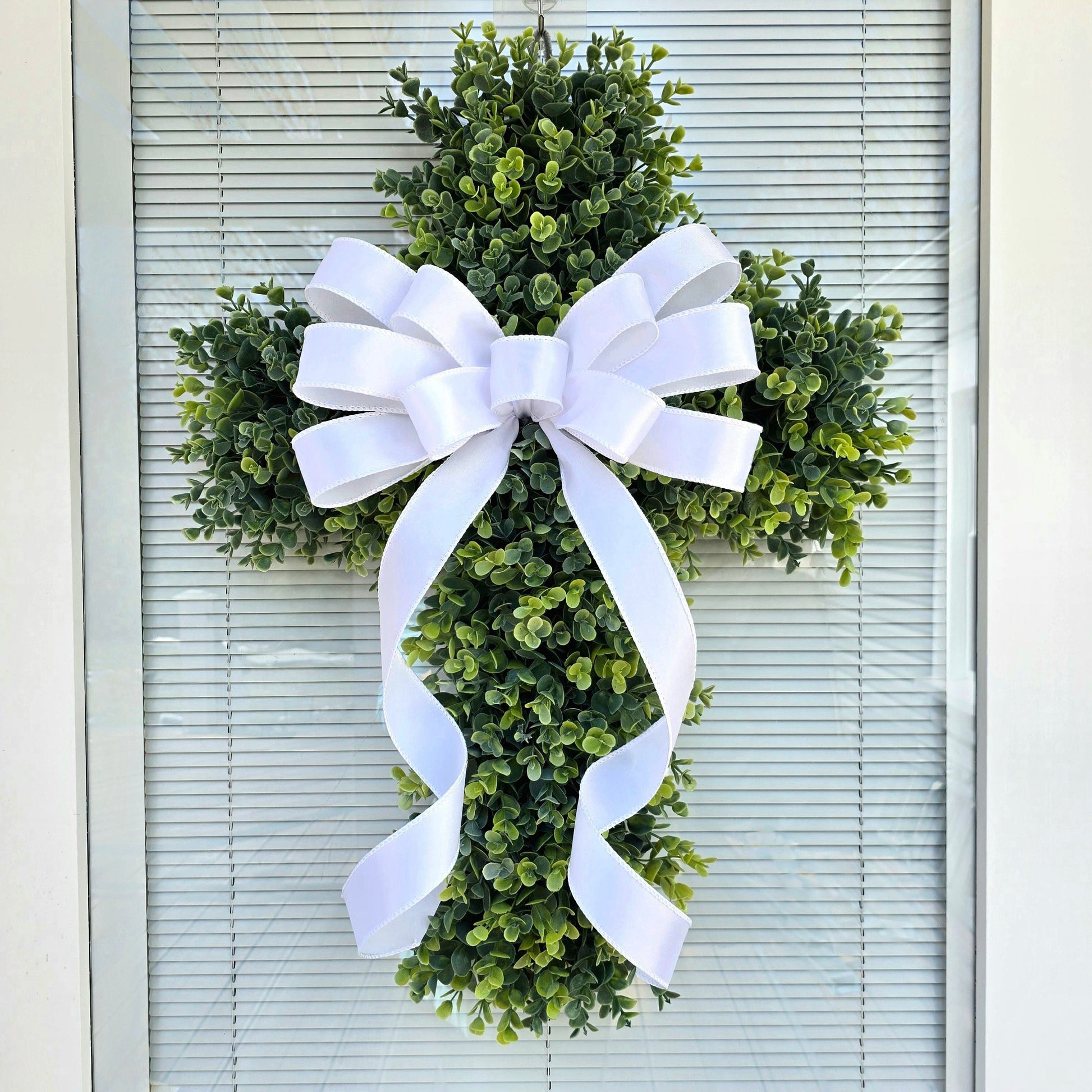 - This beautiful, large, and full cross wreath is crafted with high-quality artificial eucalyptus, featuring a wired ribbon bow placed in the center.