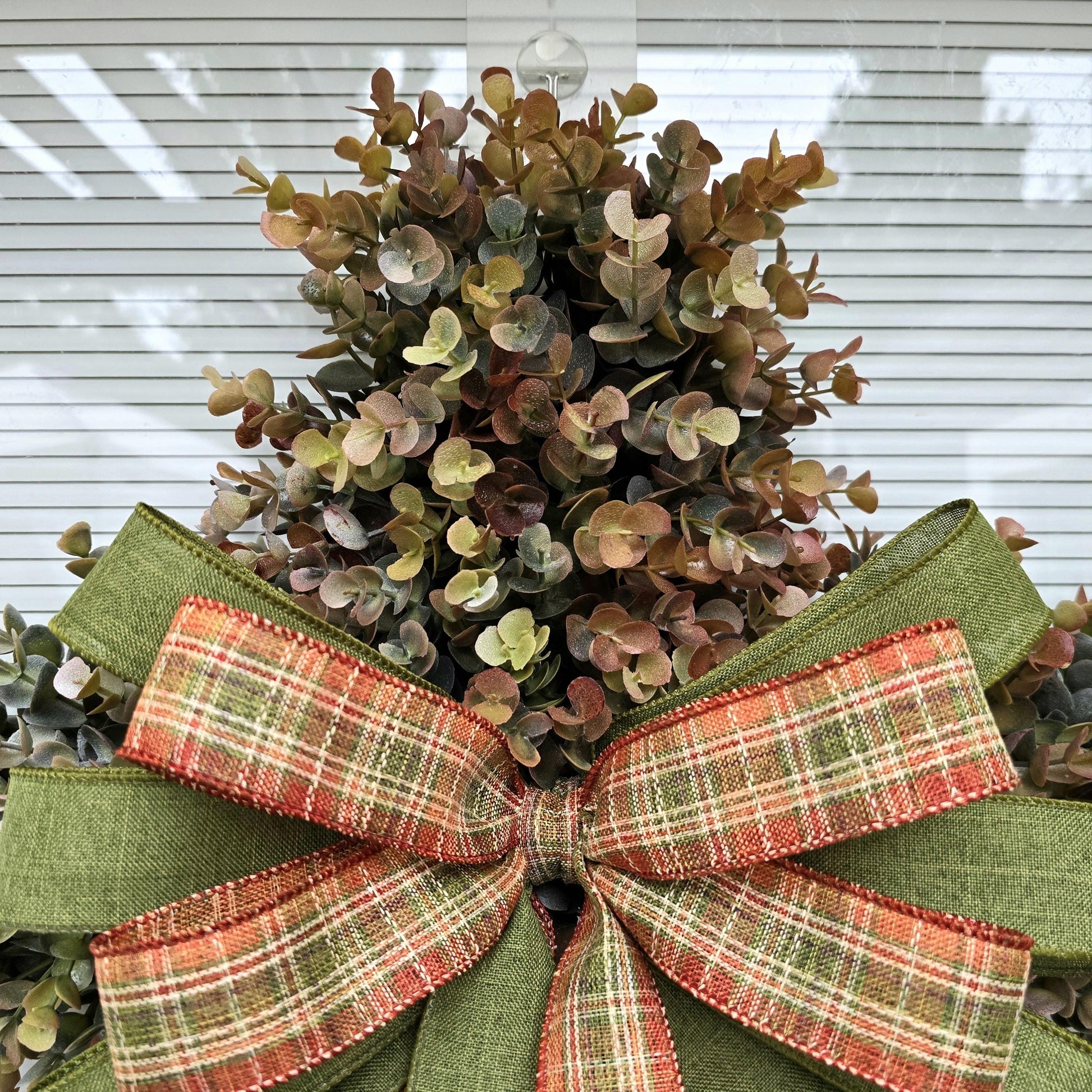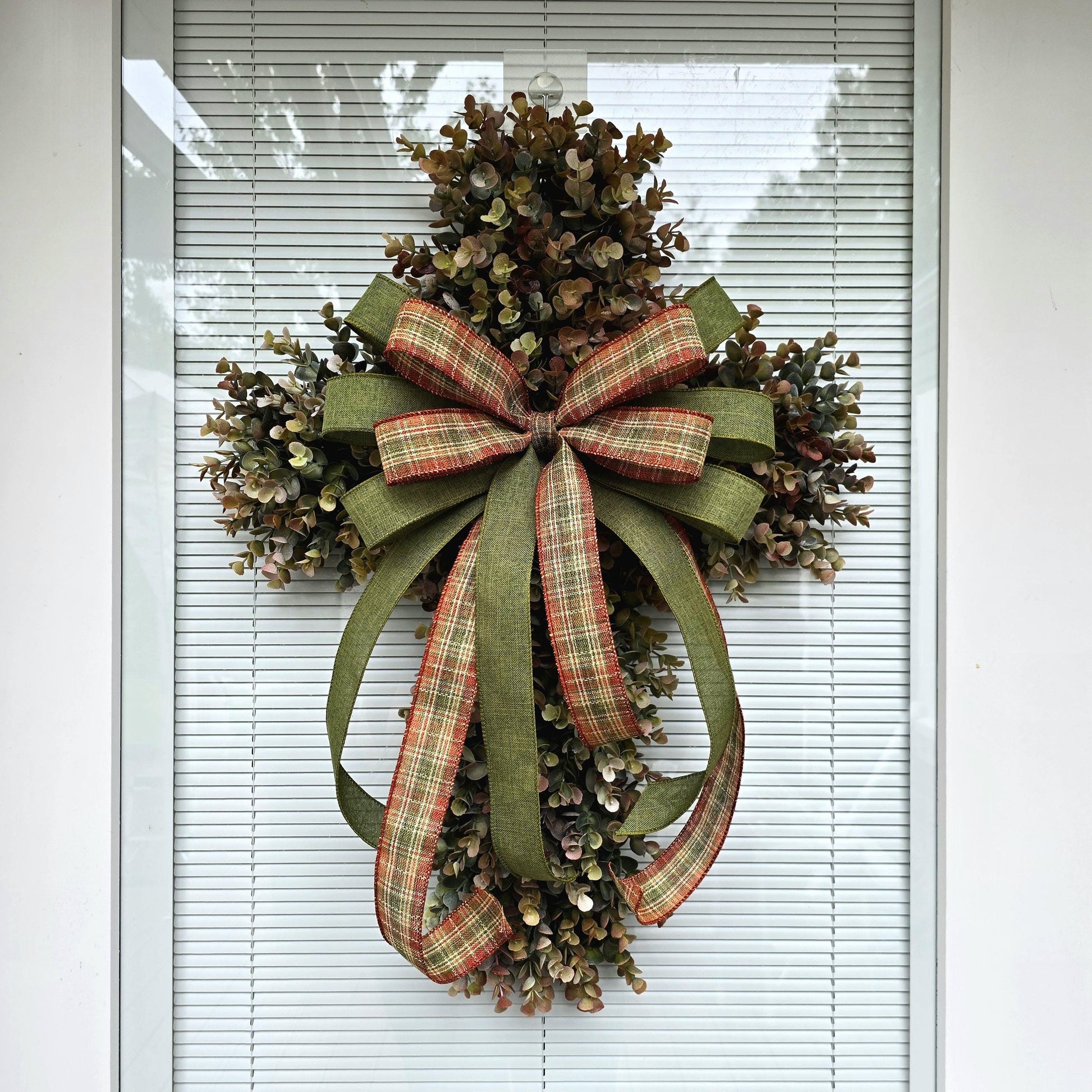 - This beautiful, large, and very full cross wreath is crafted with high-quality artificial eucalyptus, featuring a wired ribbon bow placed in the center.