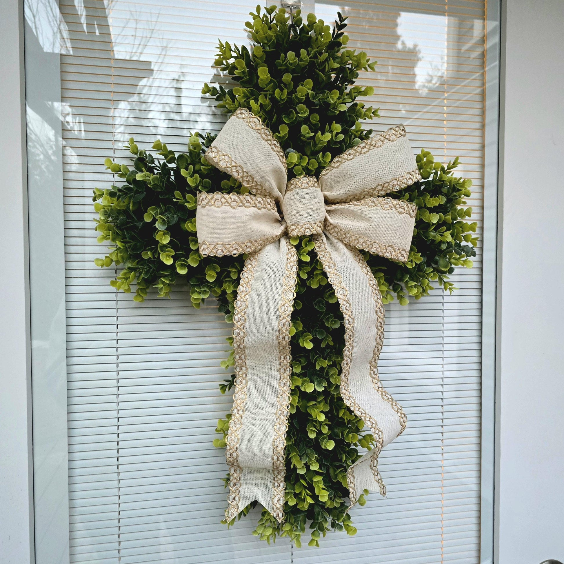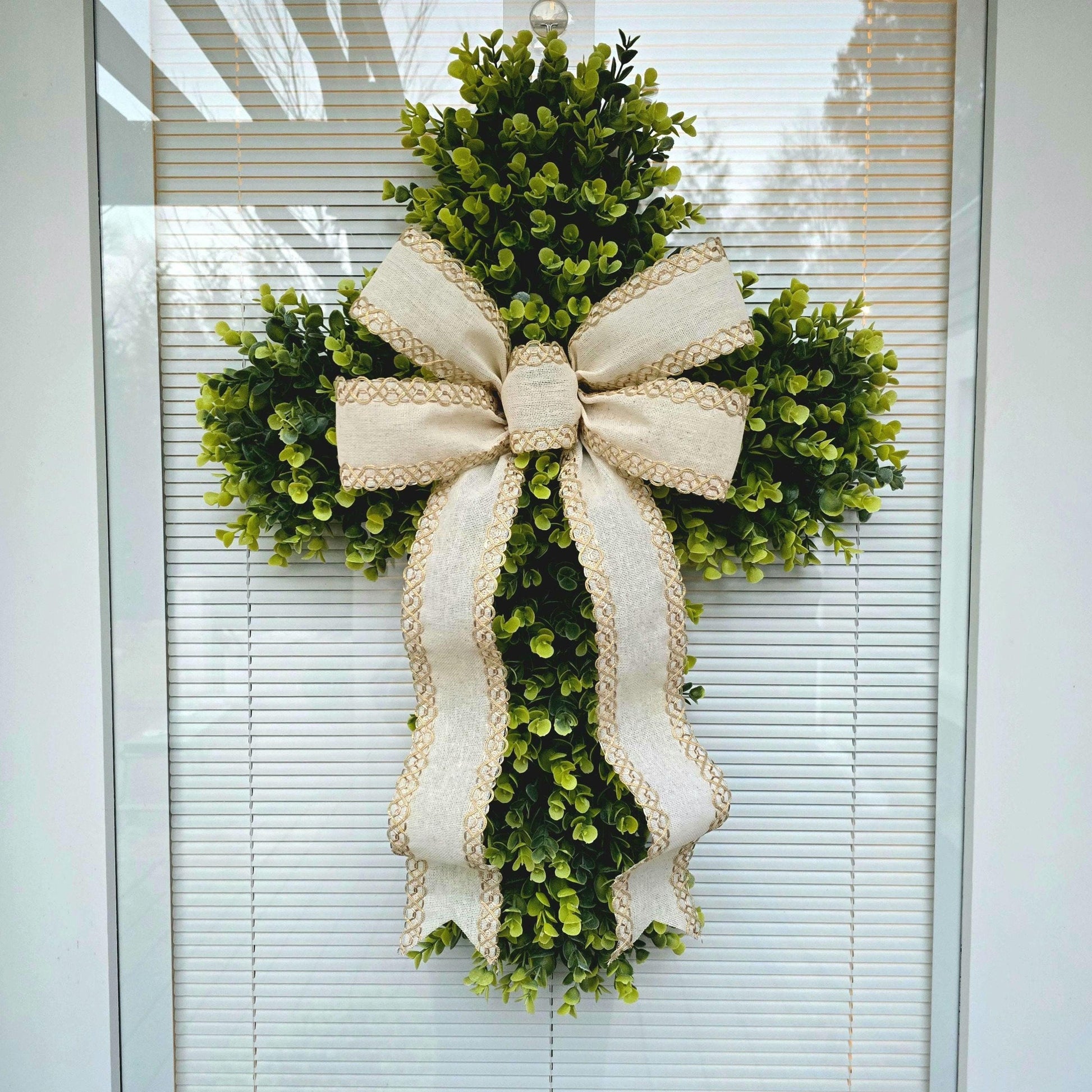 - This beautiful, large, and very full cross wreath is crafted with high-quality artificial eucalyptus, featuring a wired ribbon bow placed in the center.