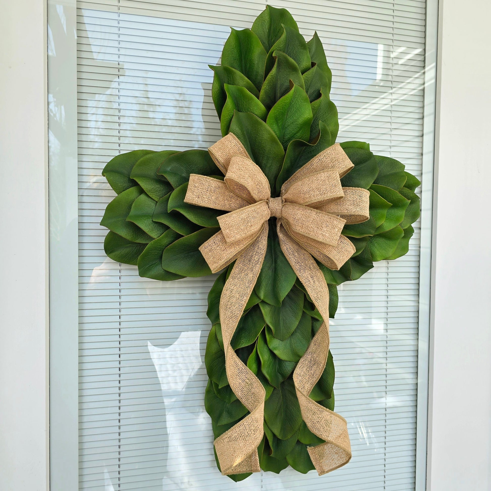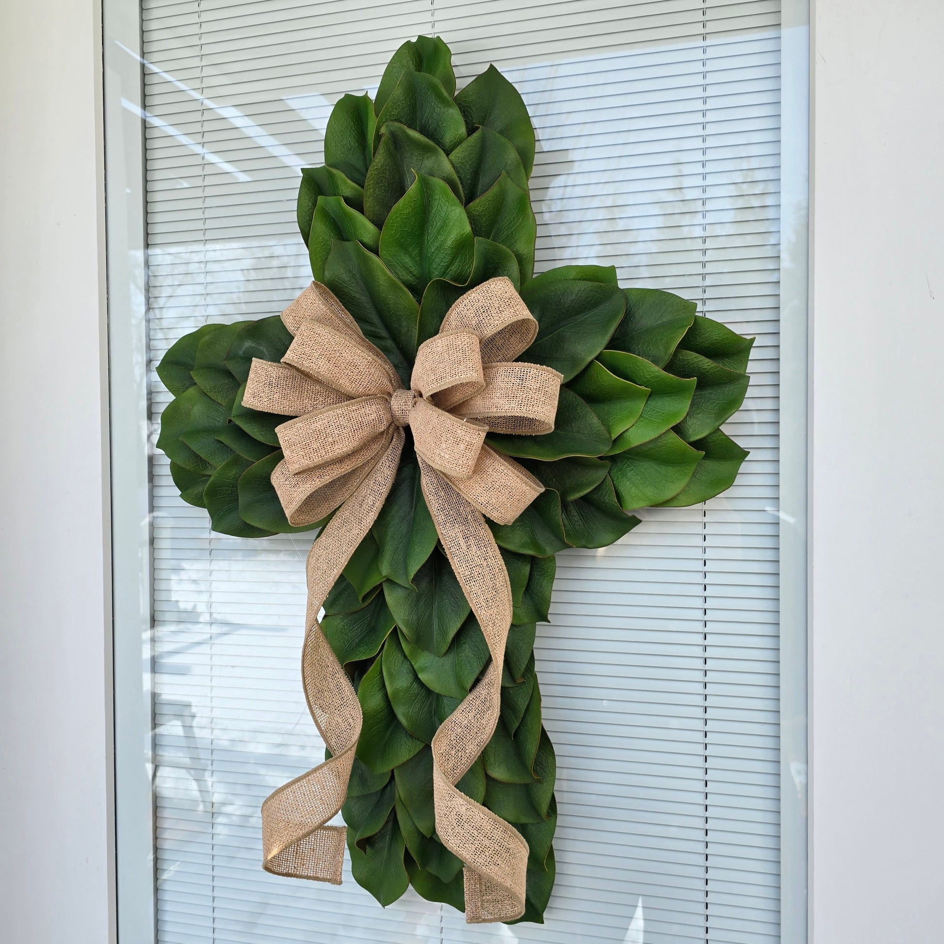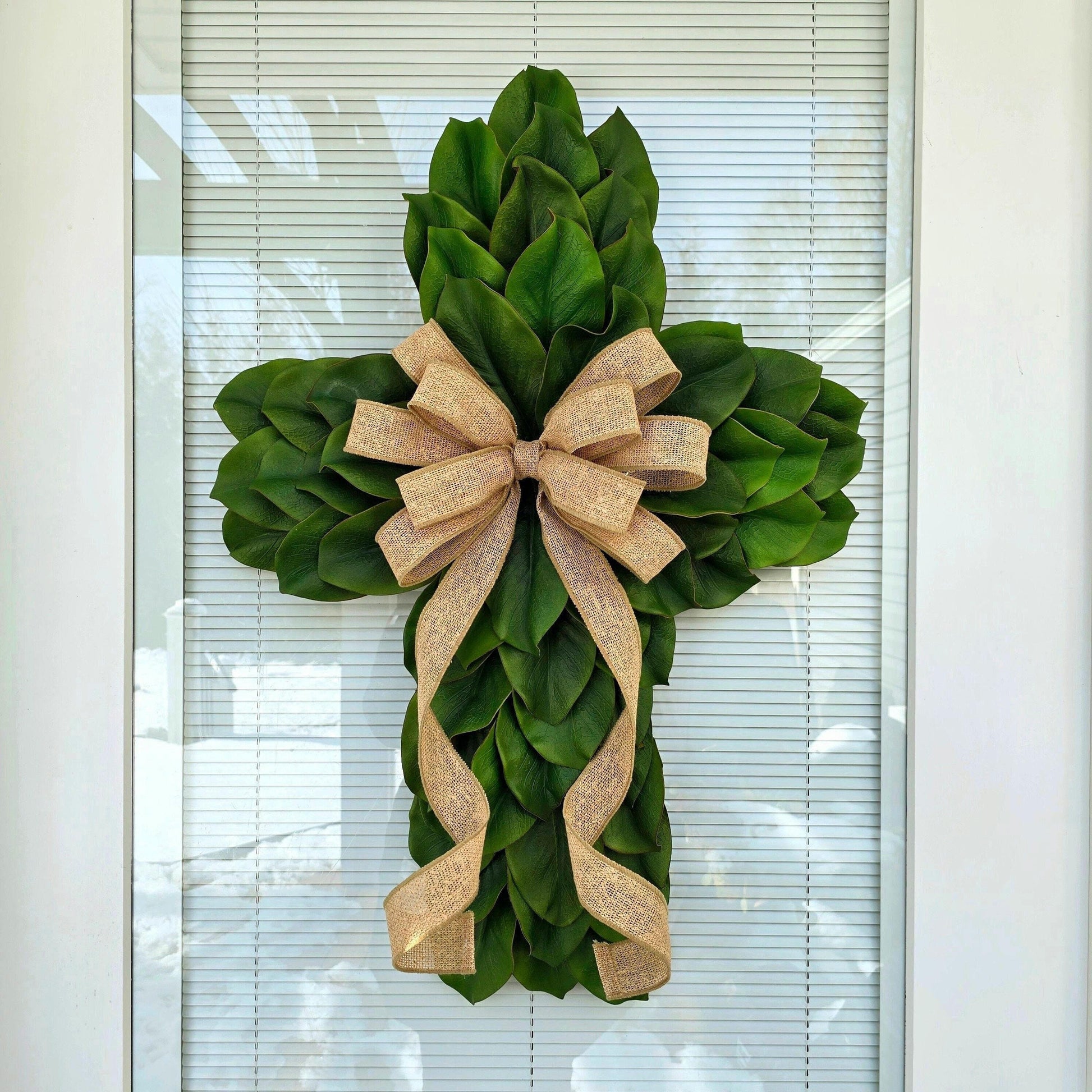 Introducing our exquisite Cross Wreath made with high quality artifical magnolia leaves with an interchangeable bow, a stunning addition to your home decor.