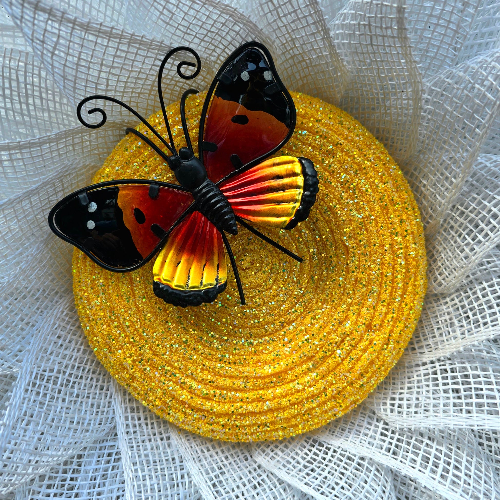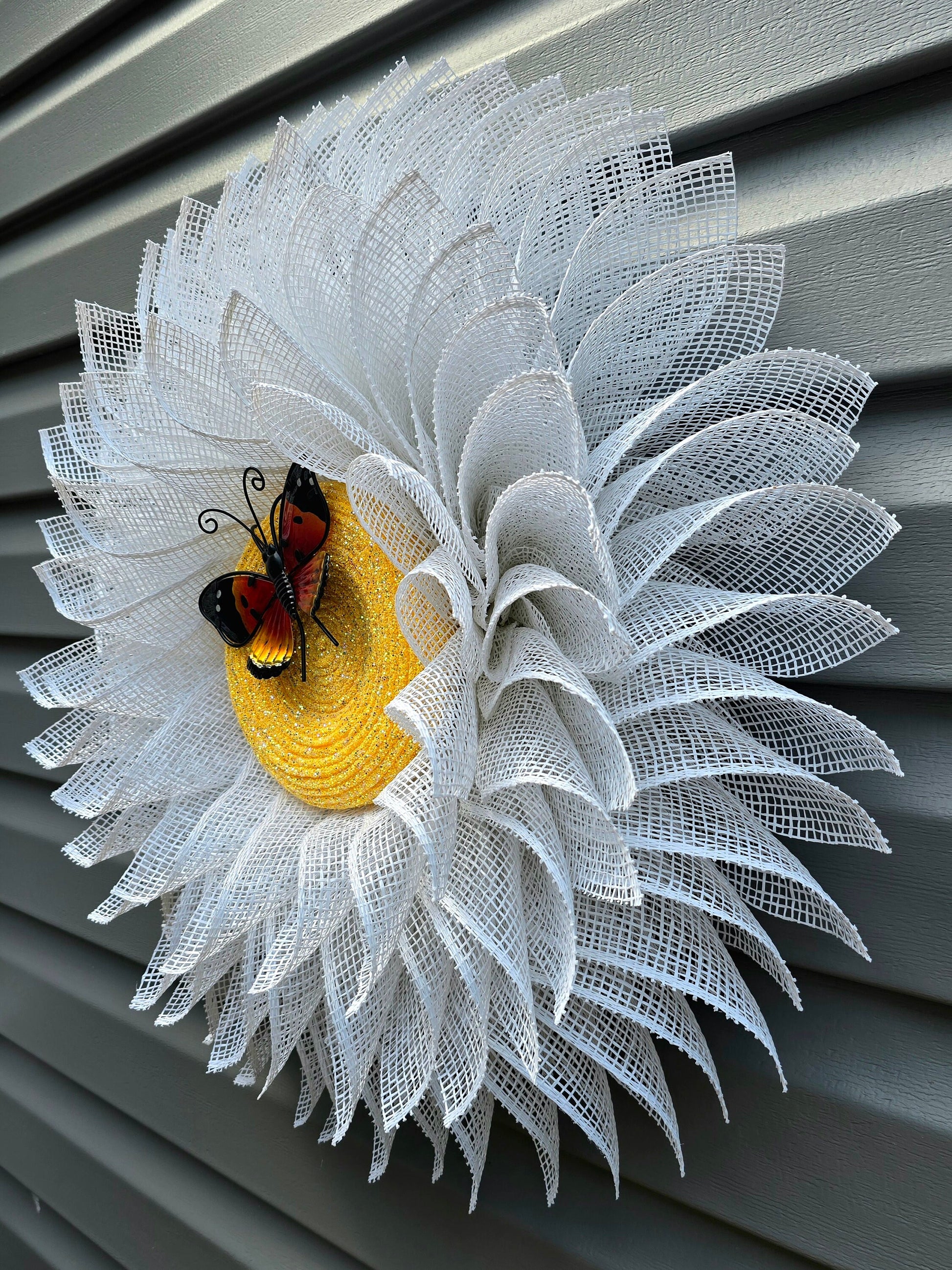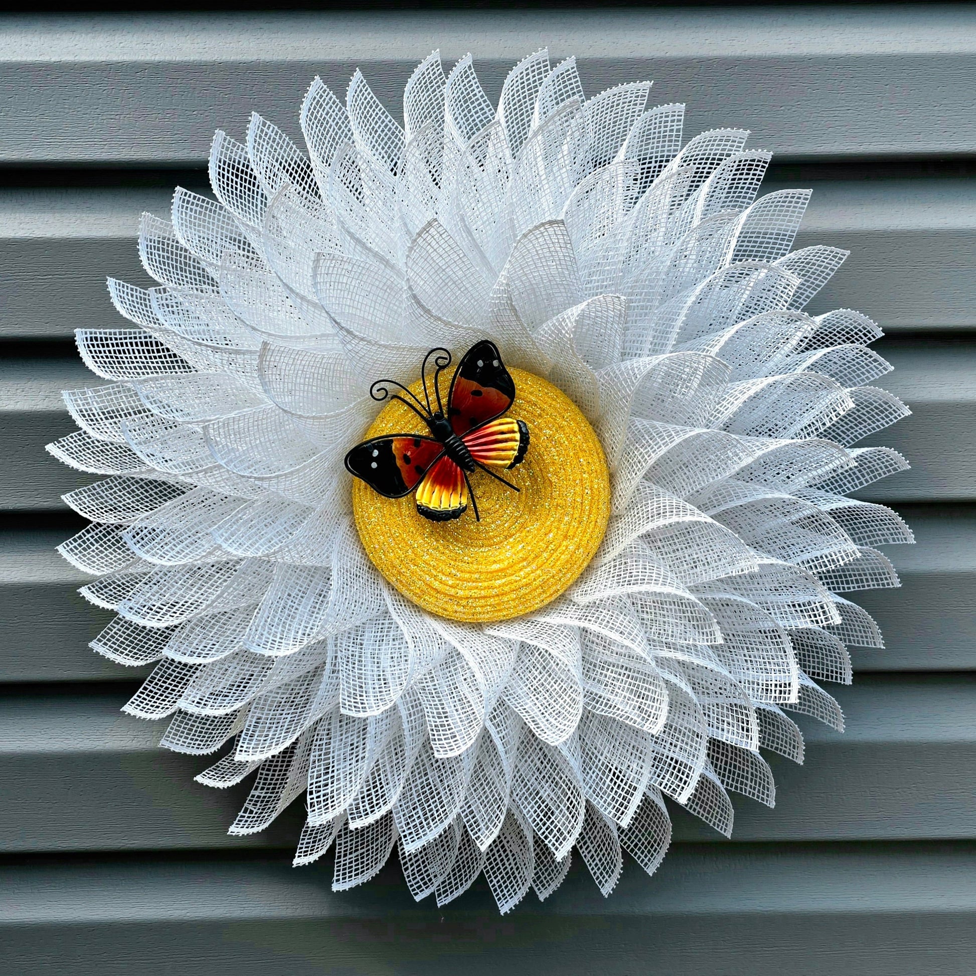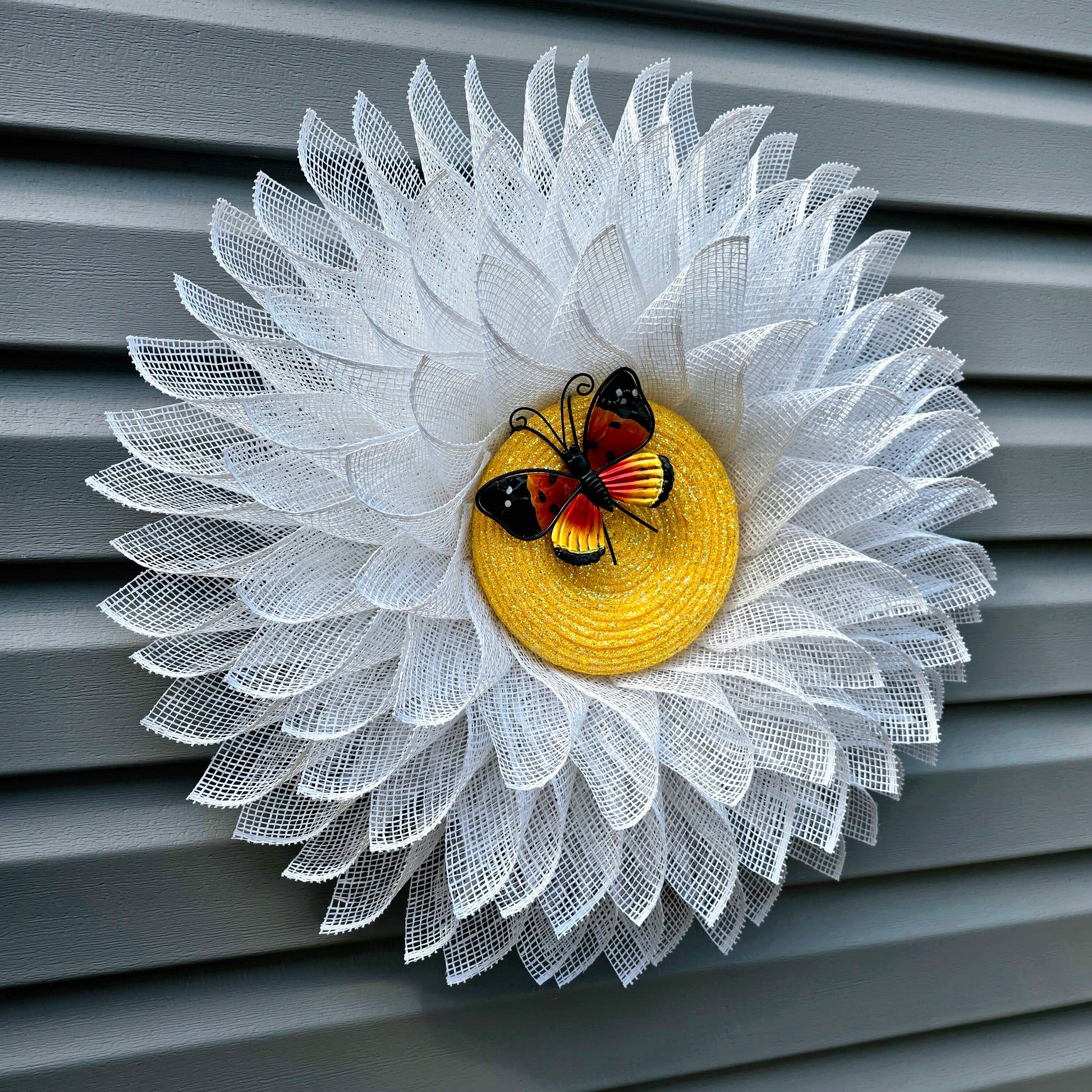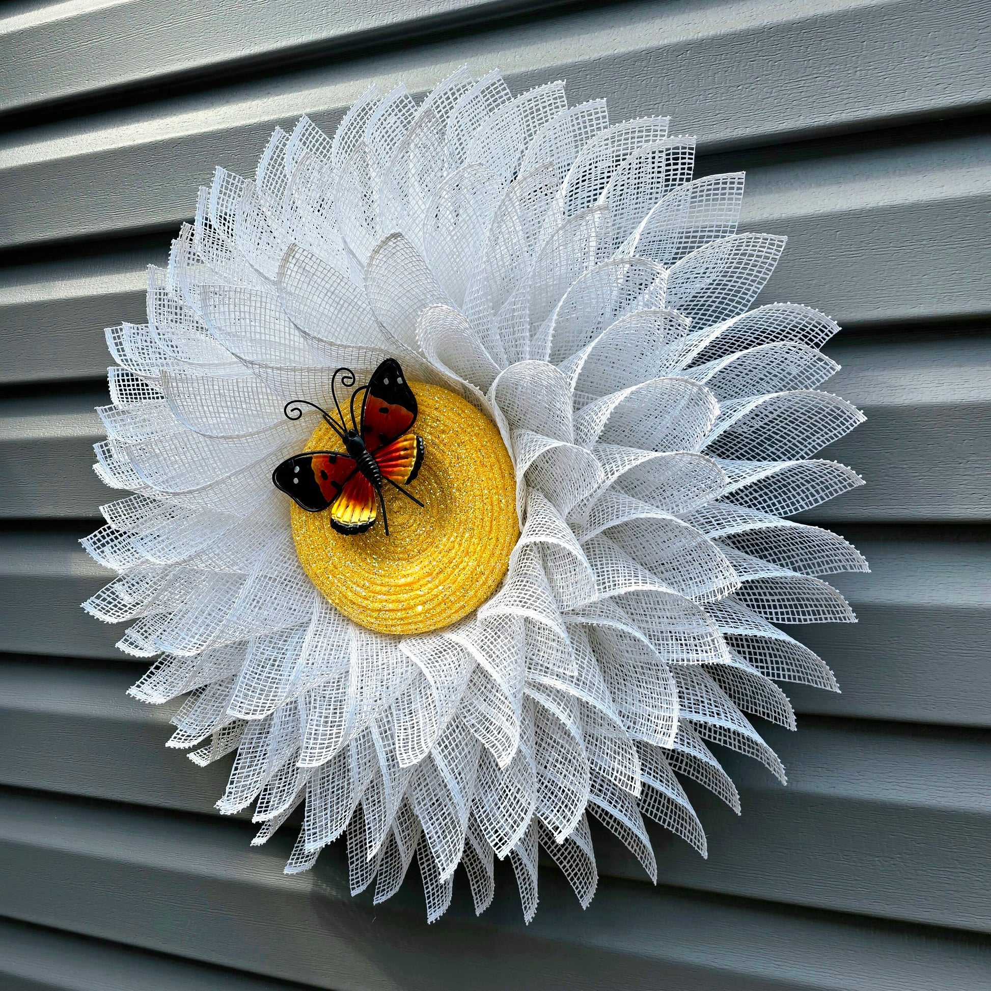 Daisy Wreath For Front Door With Butterfly, Indoor Outdoor Spring Summer Fall Seasonal Porch Decor, White Flower Wall Decoration, Home Gifts
