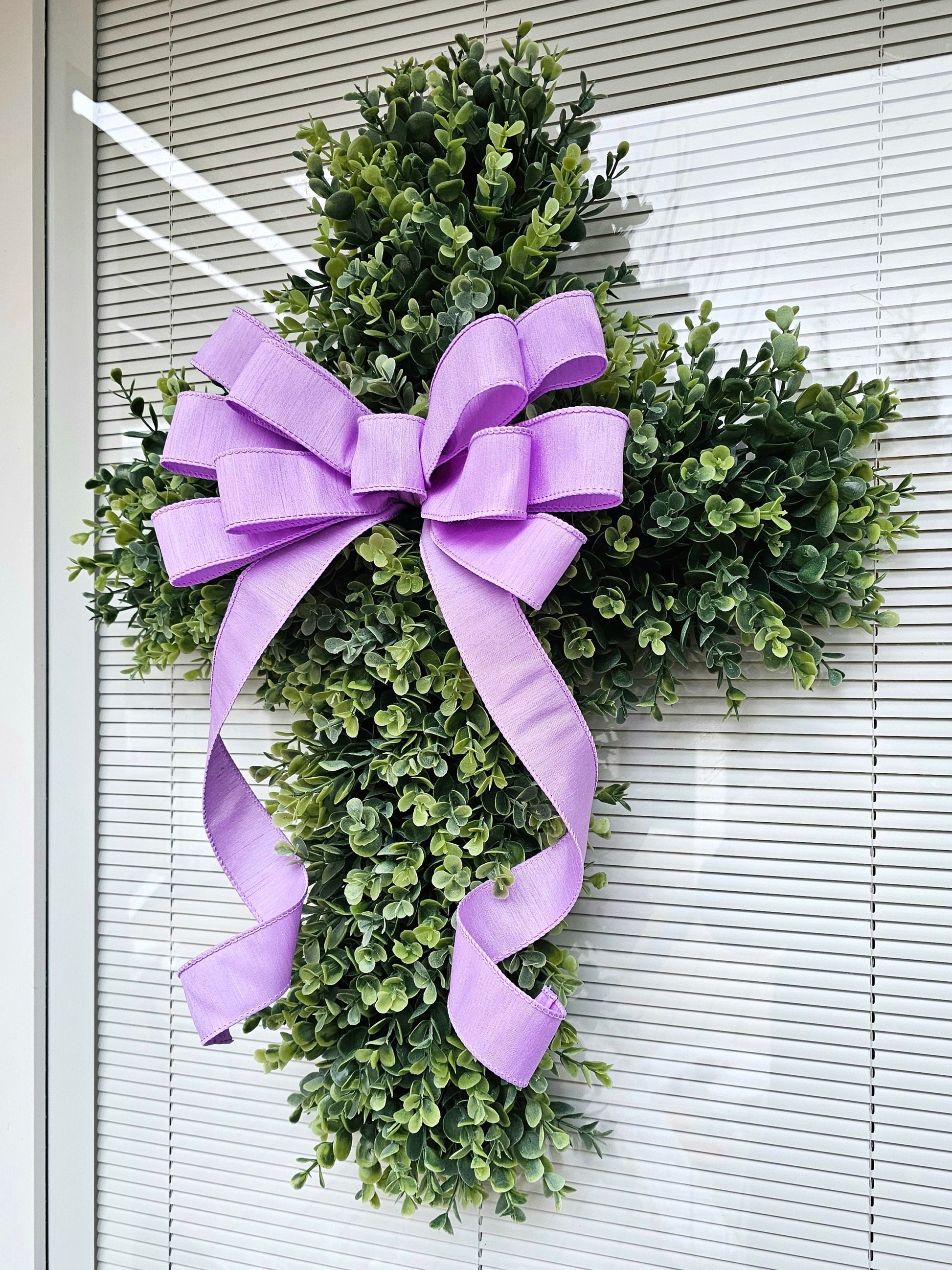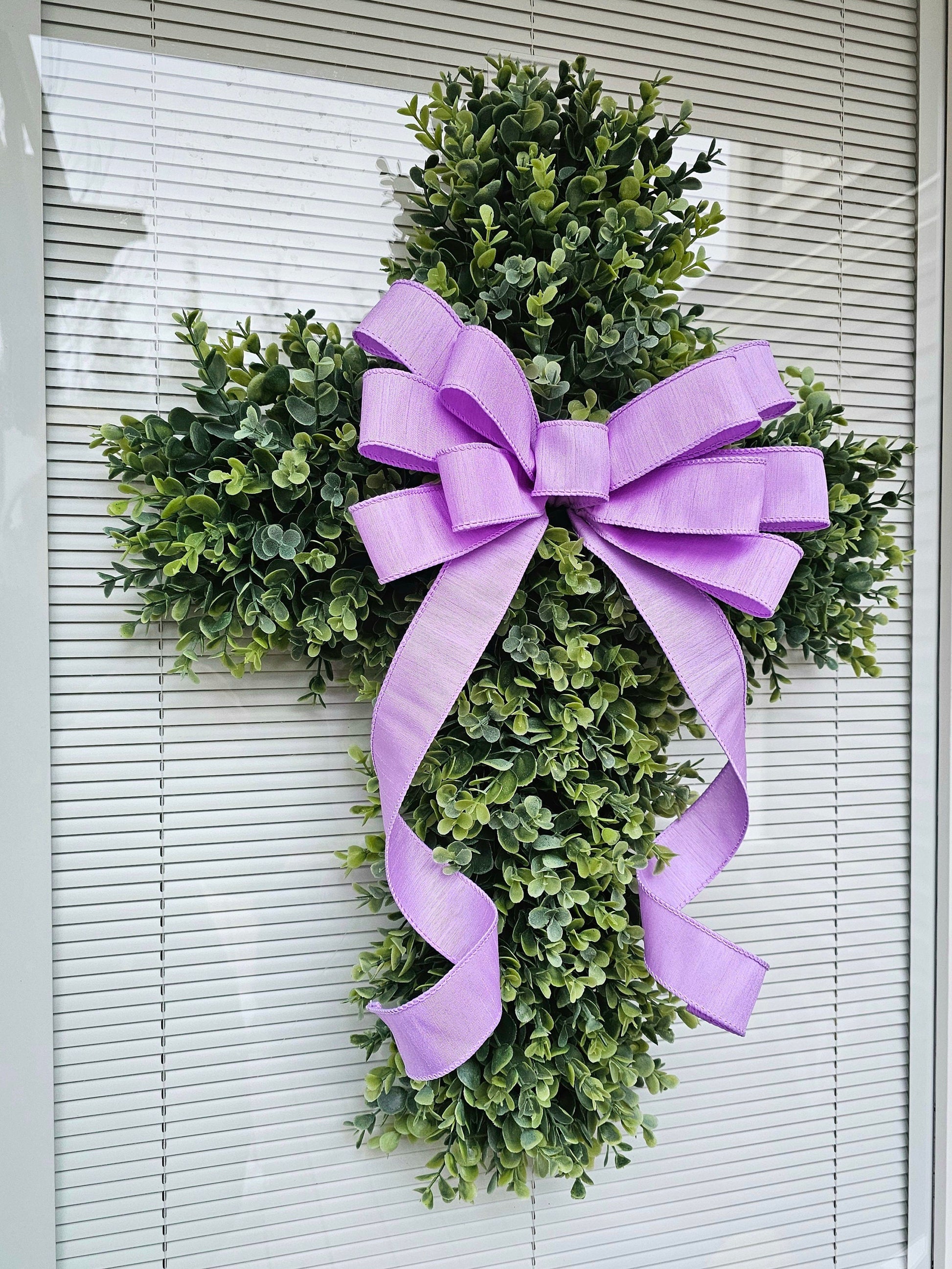 - This beautiful, large, and very full cross wreath is crafted with high-quality artificial eucalyptus, featuring a wired ribbon bow placed in the center.