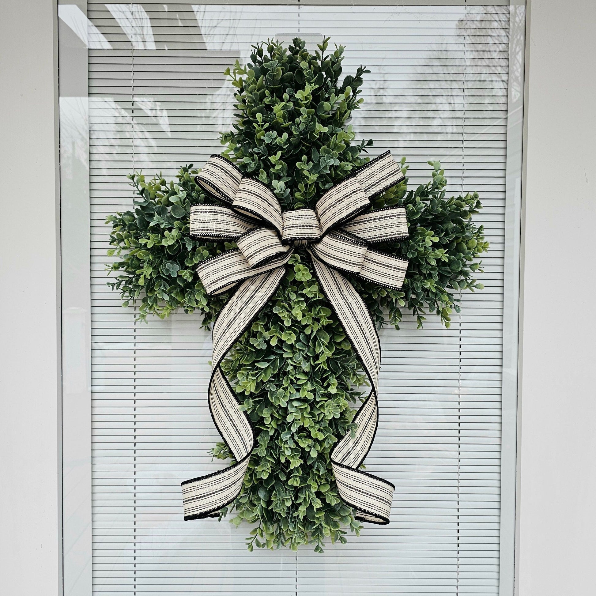 - This beautiful, large, and very full cross wreath is crafted with high-quality artificial eucalyptus, featuring a wired ribbon bow placed in the center.