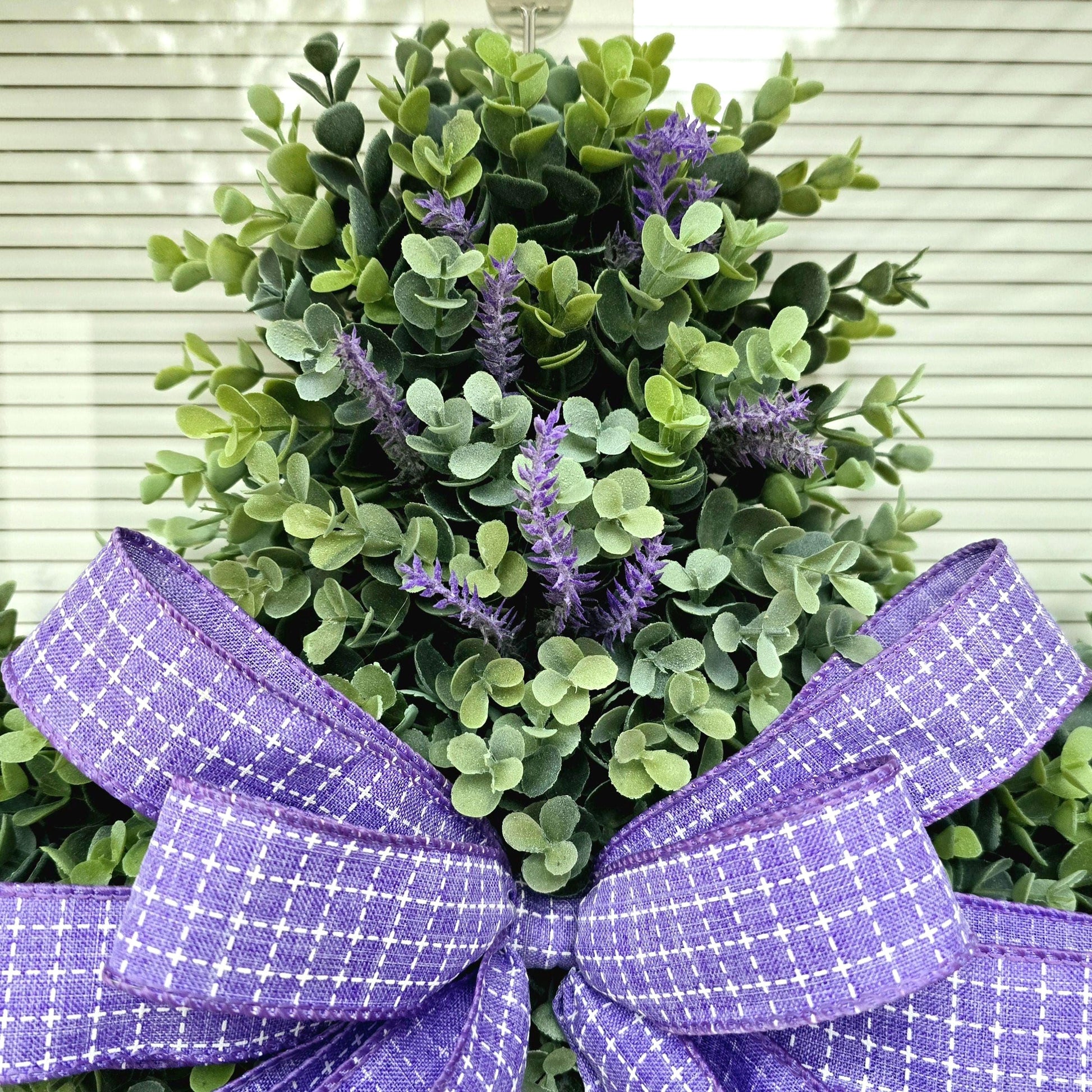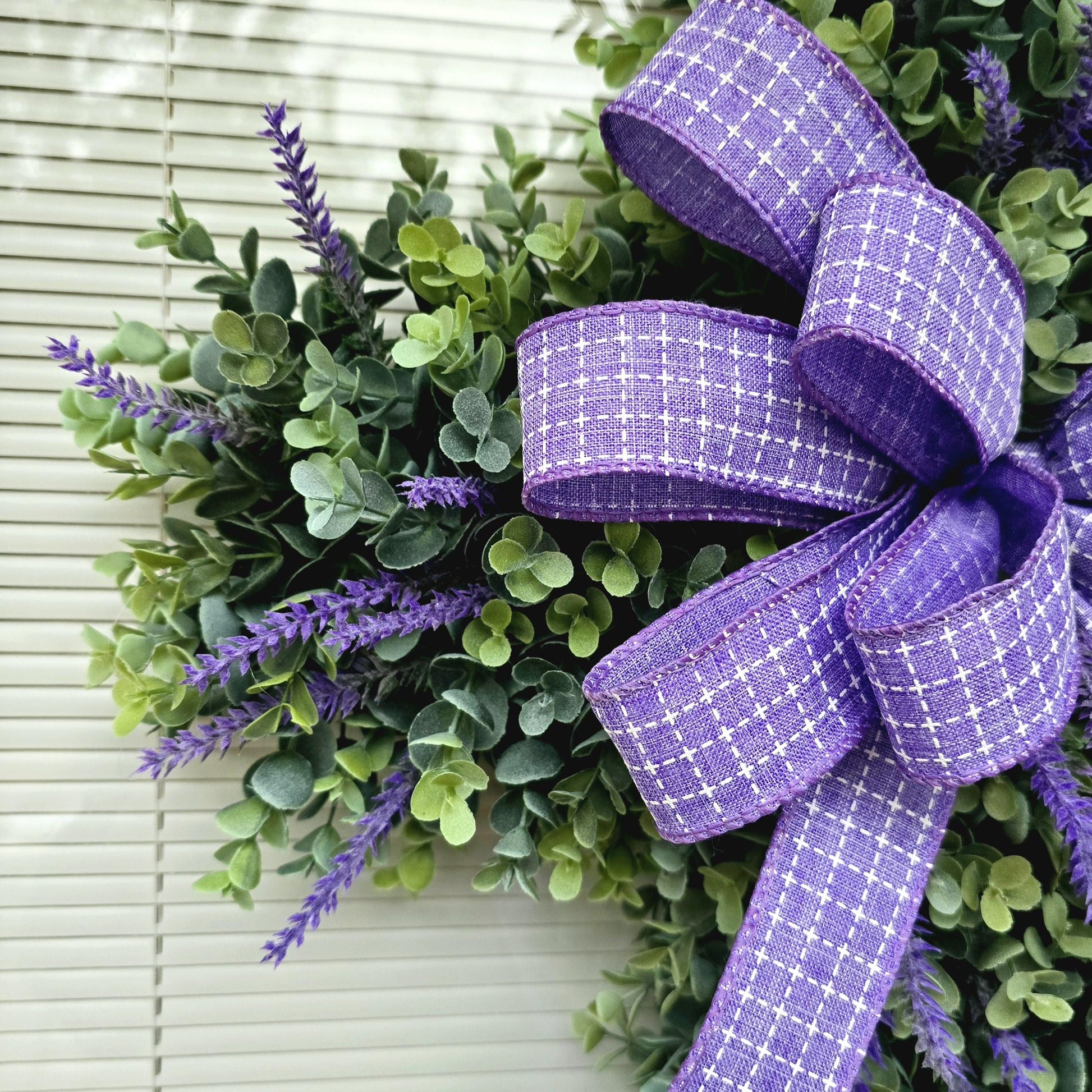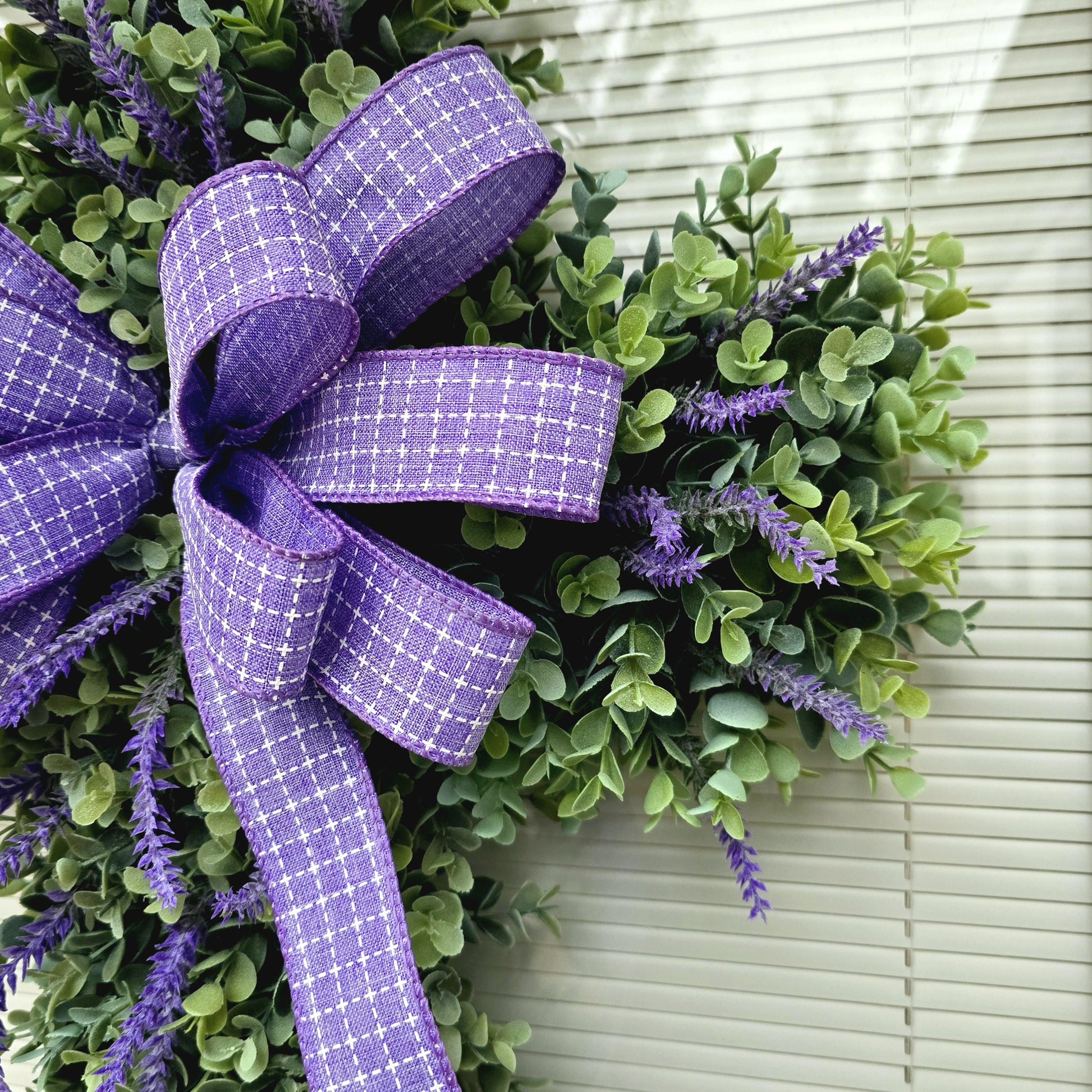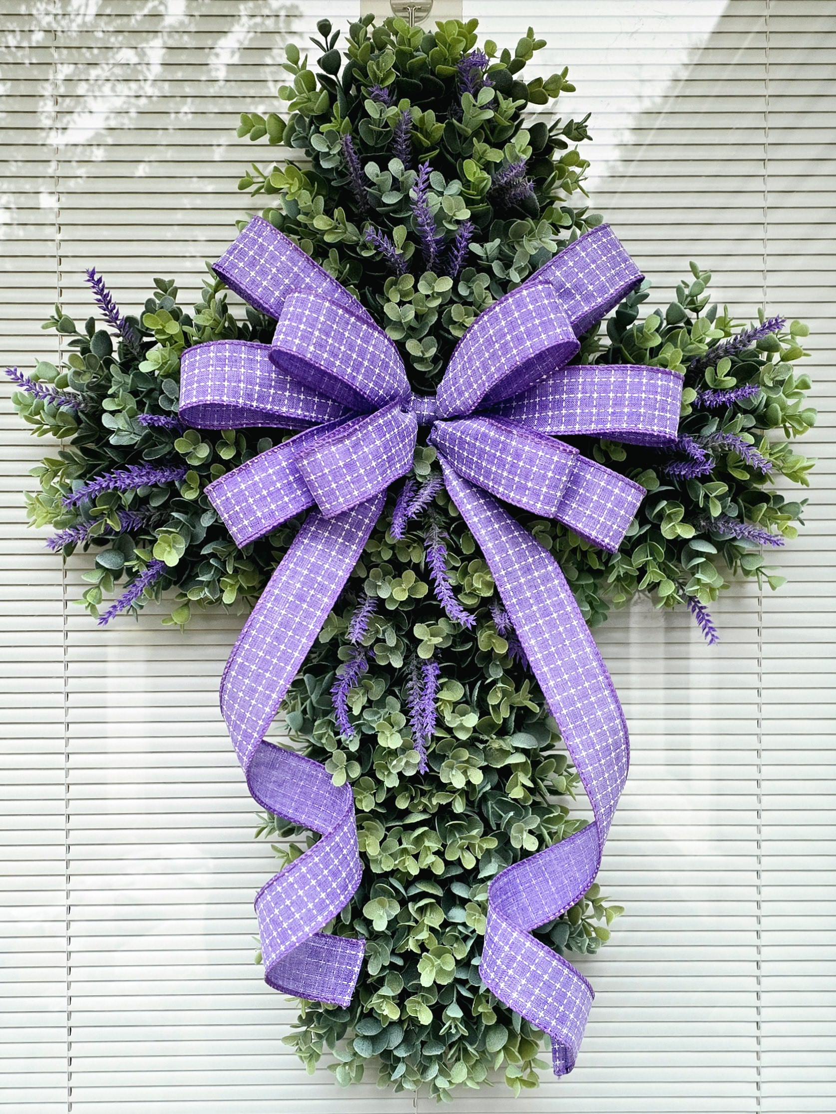 - This beautiful, large, and full cross wreath is crafted with high-quality artificial eucalyptus, lavender, and a wired ribbon bow placed in the center.
