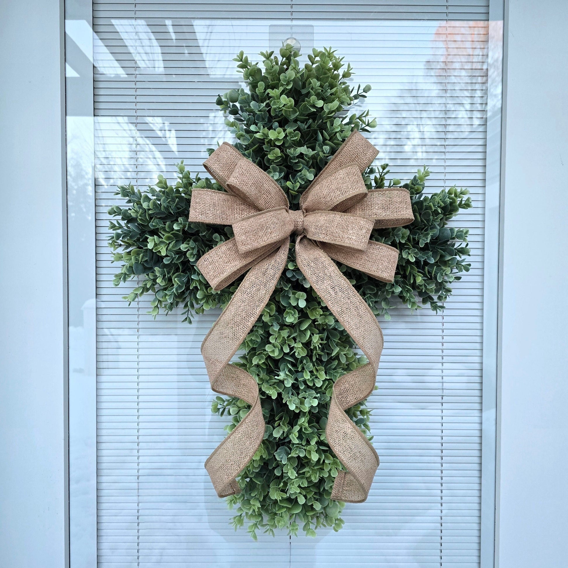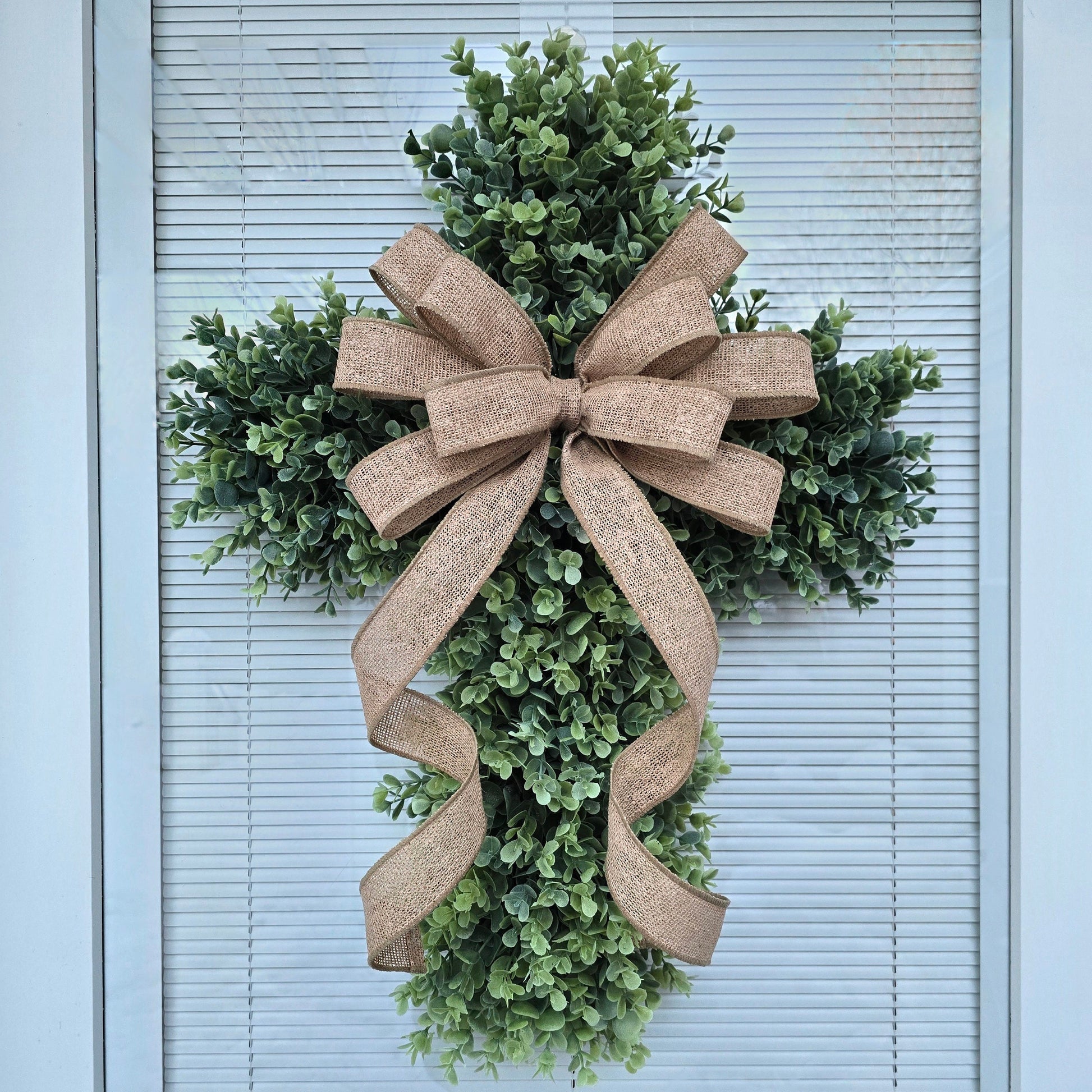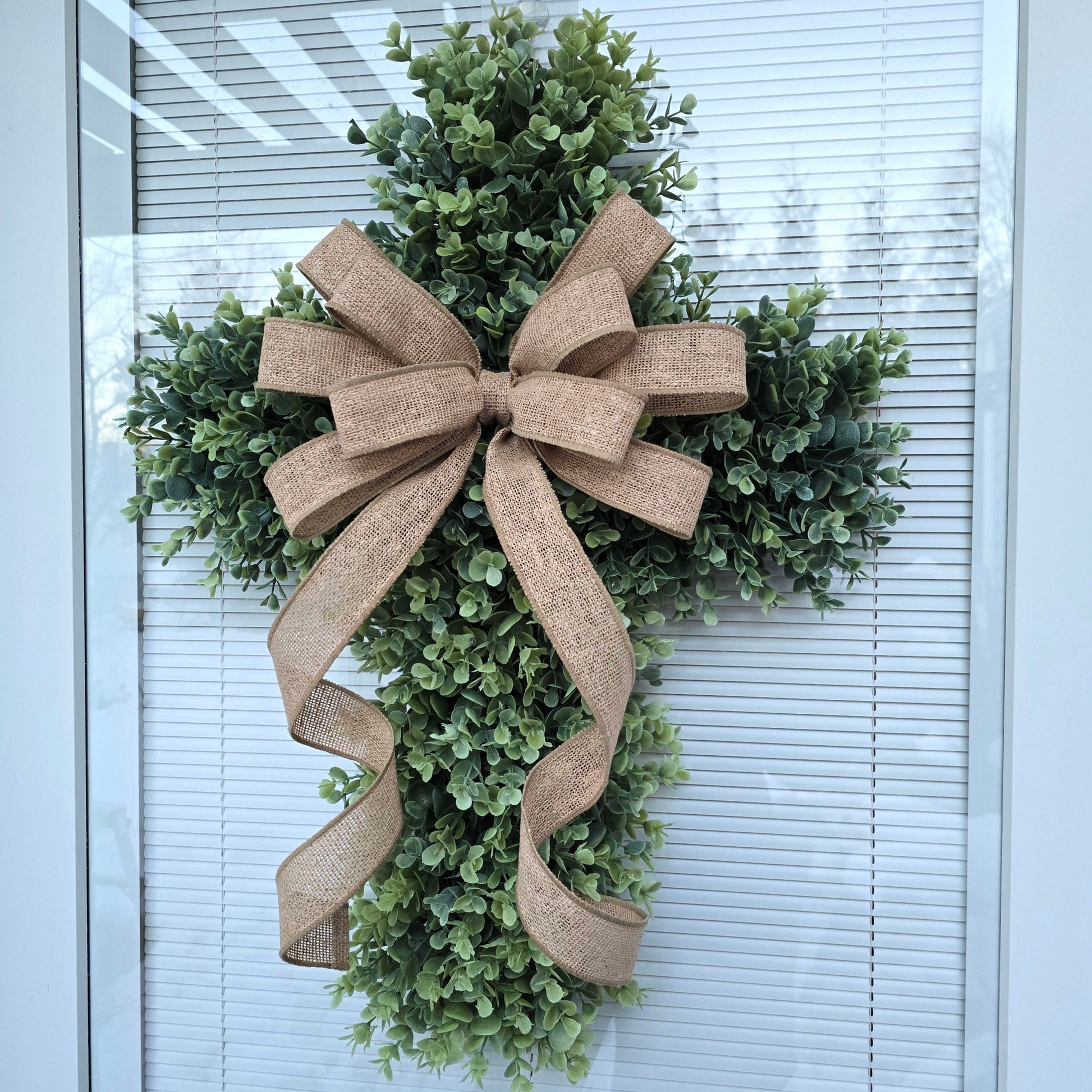 - This beautiful, large, and very full cross wreath is crafted with high-quality artificial eucalyptus, featuring a wired ribbon bow placed in the center.