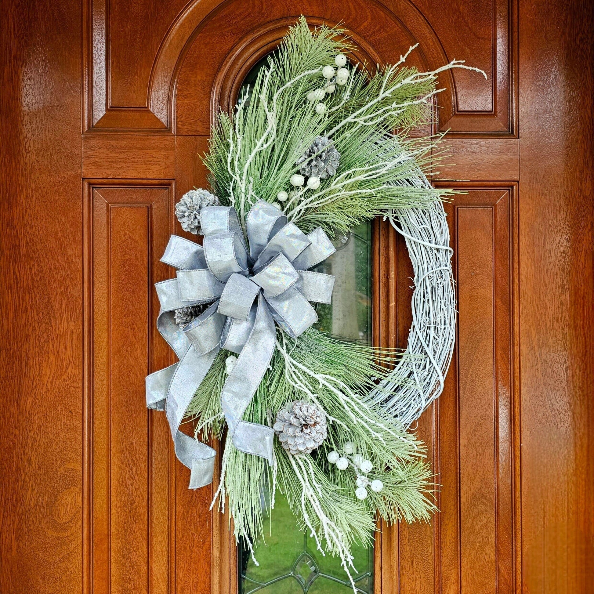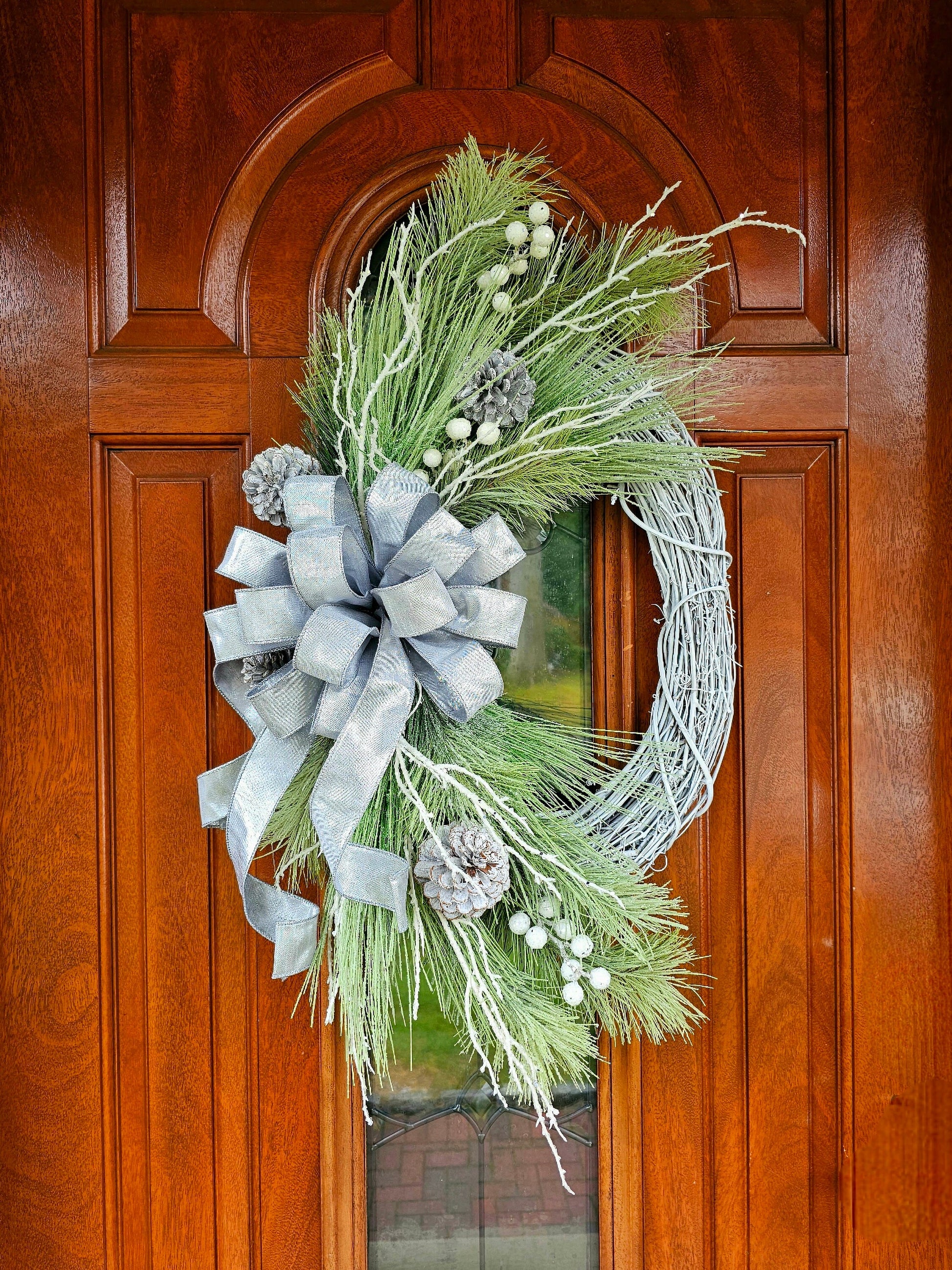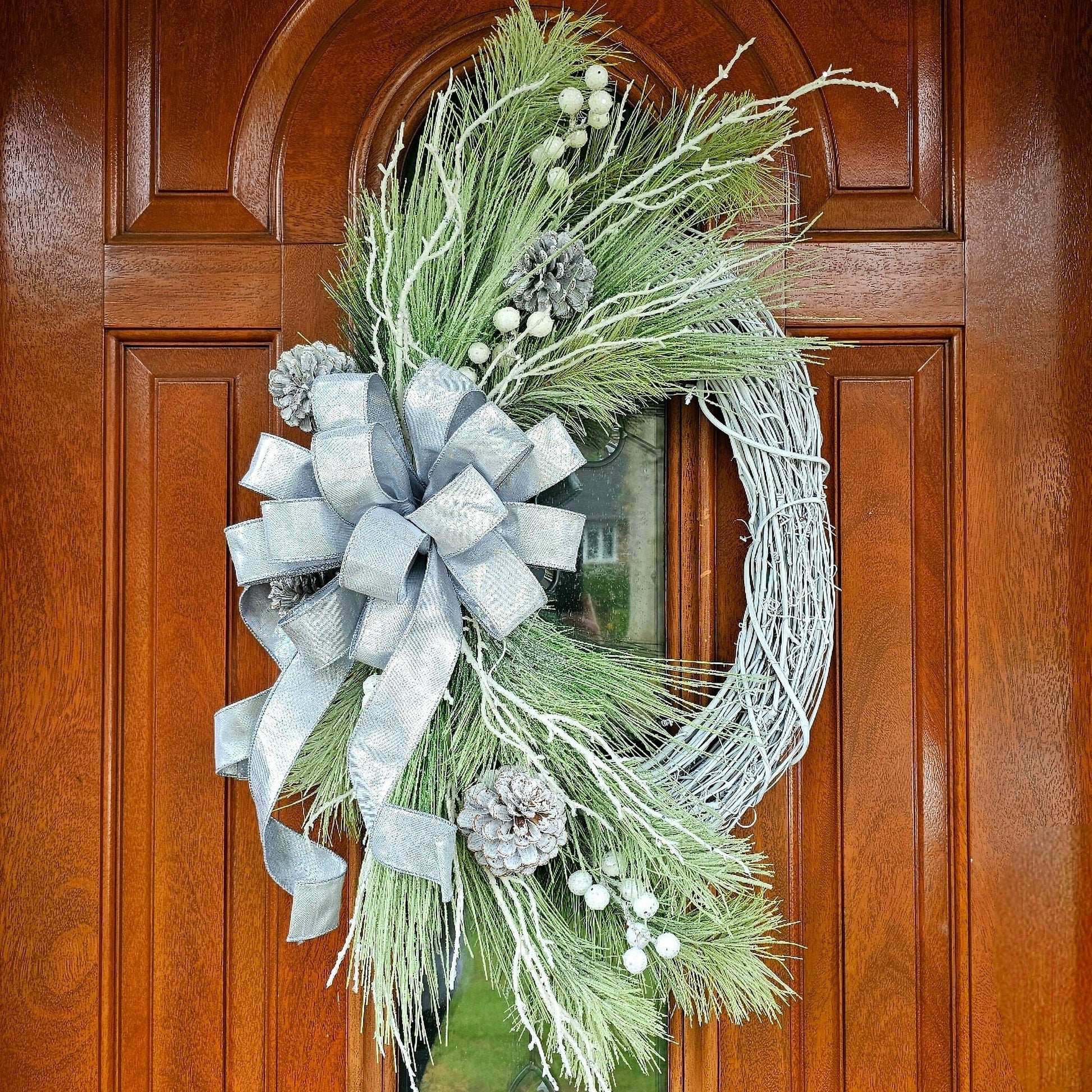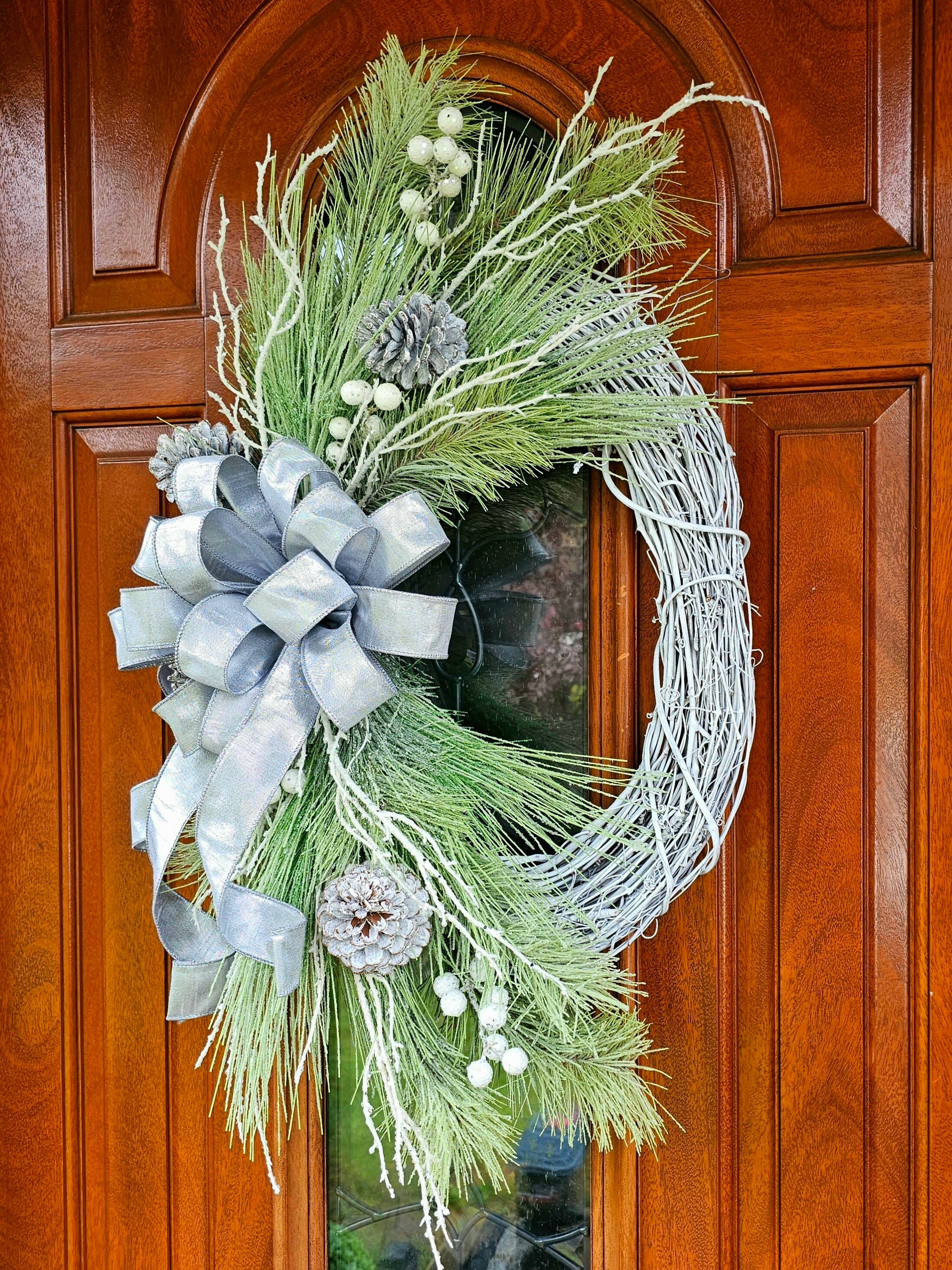 This handcrafted wreath features top-notch materials on a white oval grapevine base, with frosted pine, whitewashed pine cones, glitter branches and a beautiful silver duponi bow.