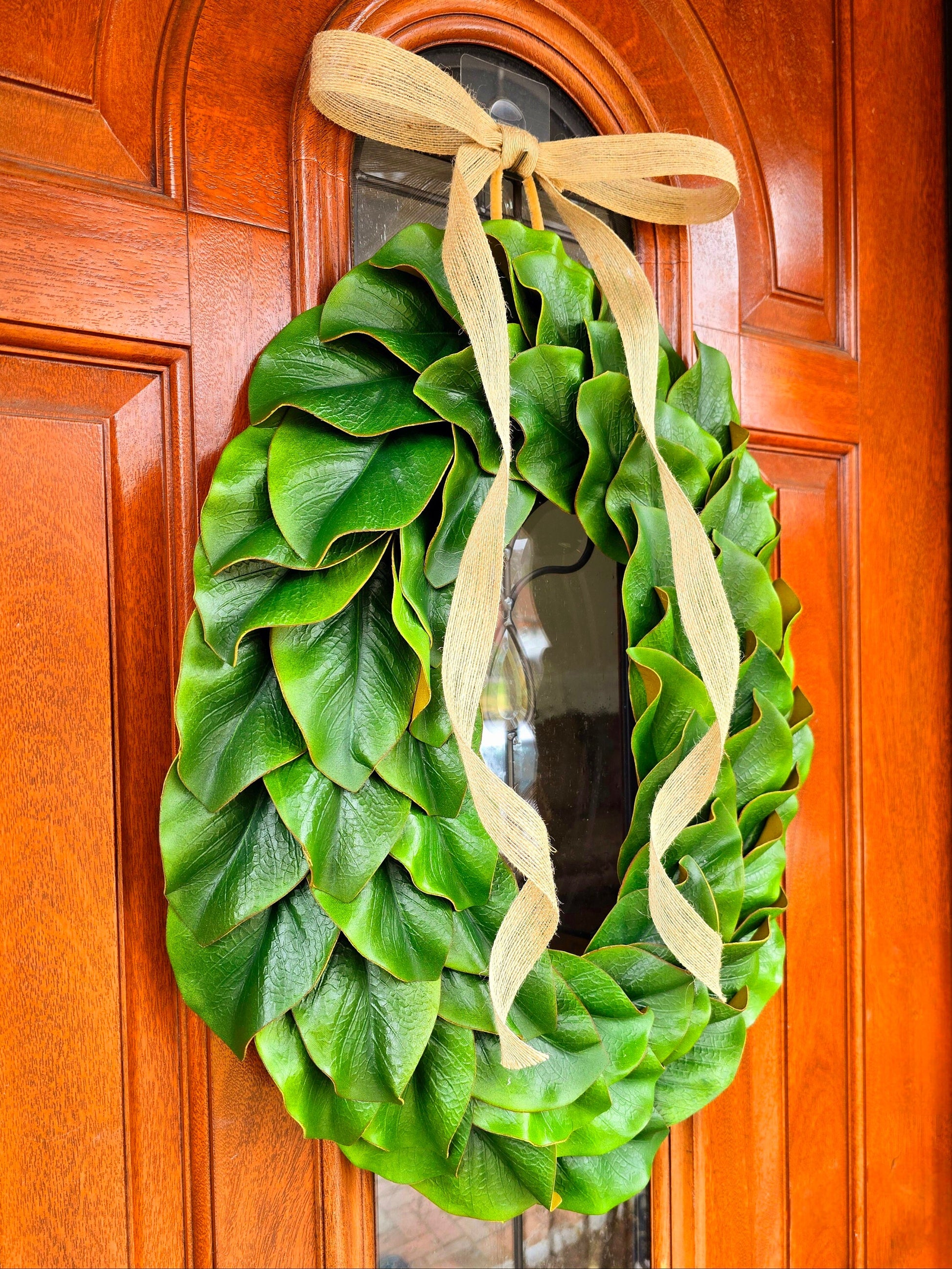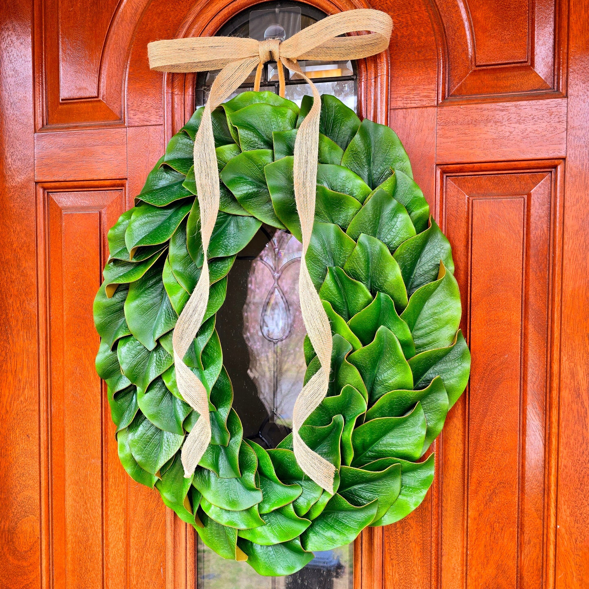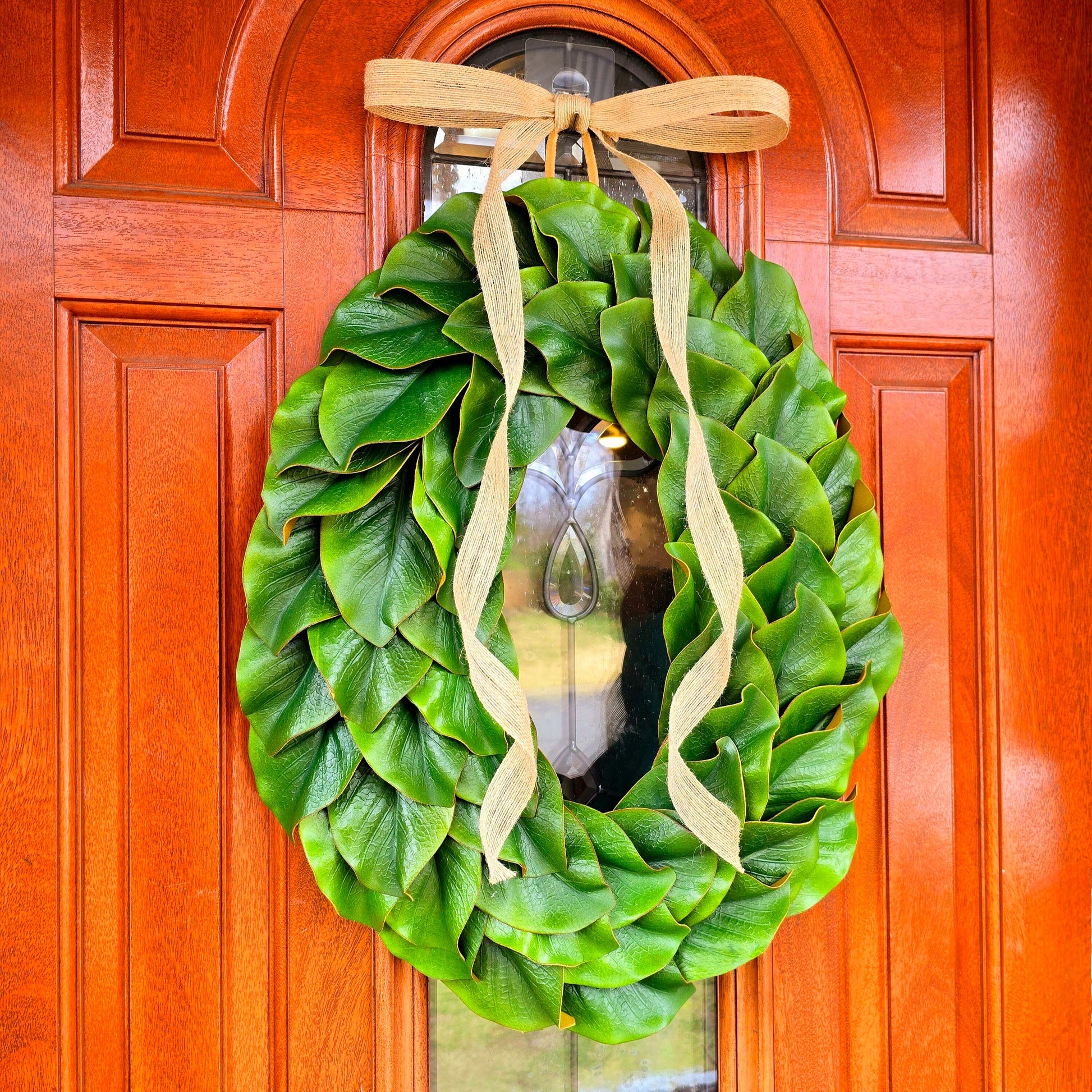 Introducing our exquisite Magnolia Leaves Oval Wreath, a stunning piece for indoor or outdoor home decor.