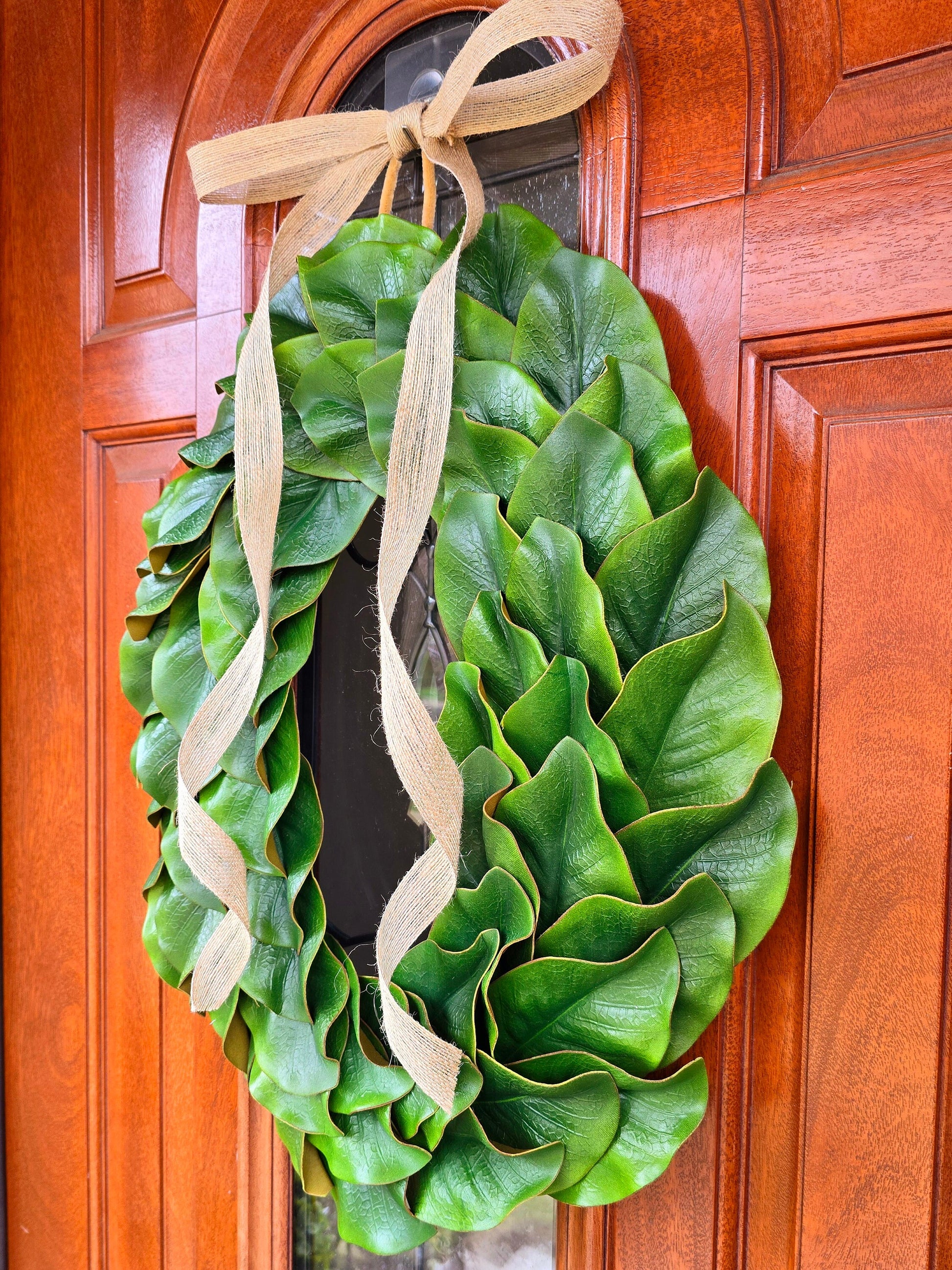 This beautiful magnolia wreath is meticulously crafted using high-quality artificial leaves and a stunning yet simple bow.