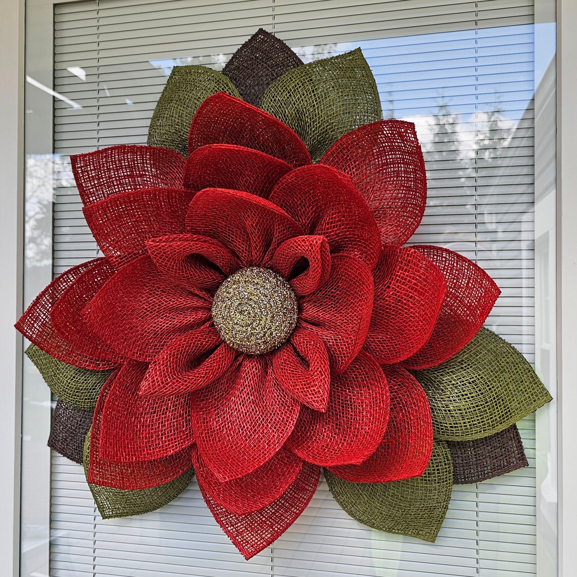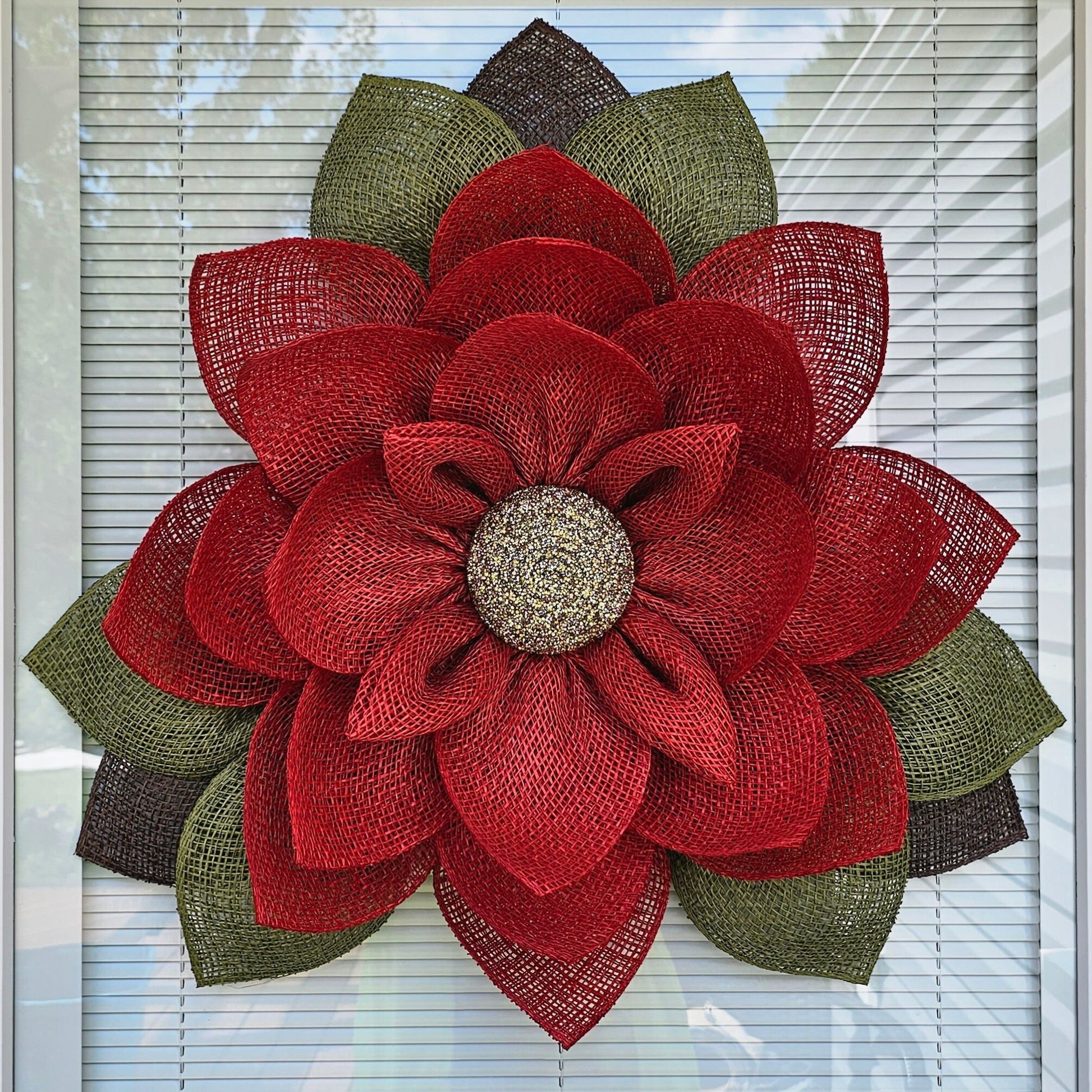 Magnolia Wreath For Front Door, Double Door Decor, Red Burlap Flower, Outdoor Home Seasonal Decoration, Handmade Floral Gift Ideas