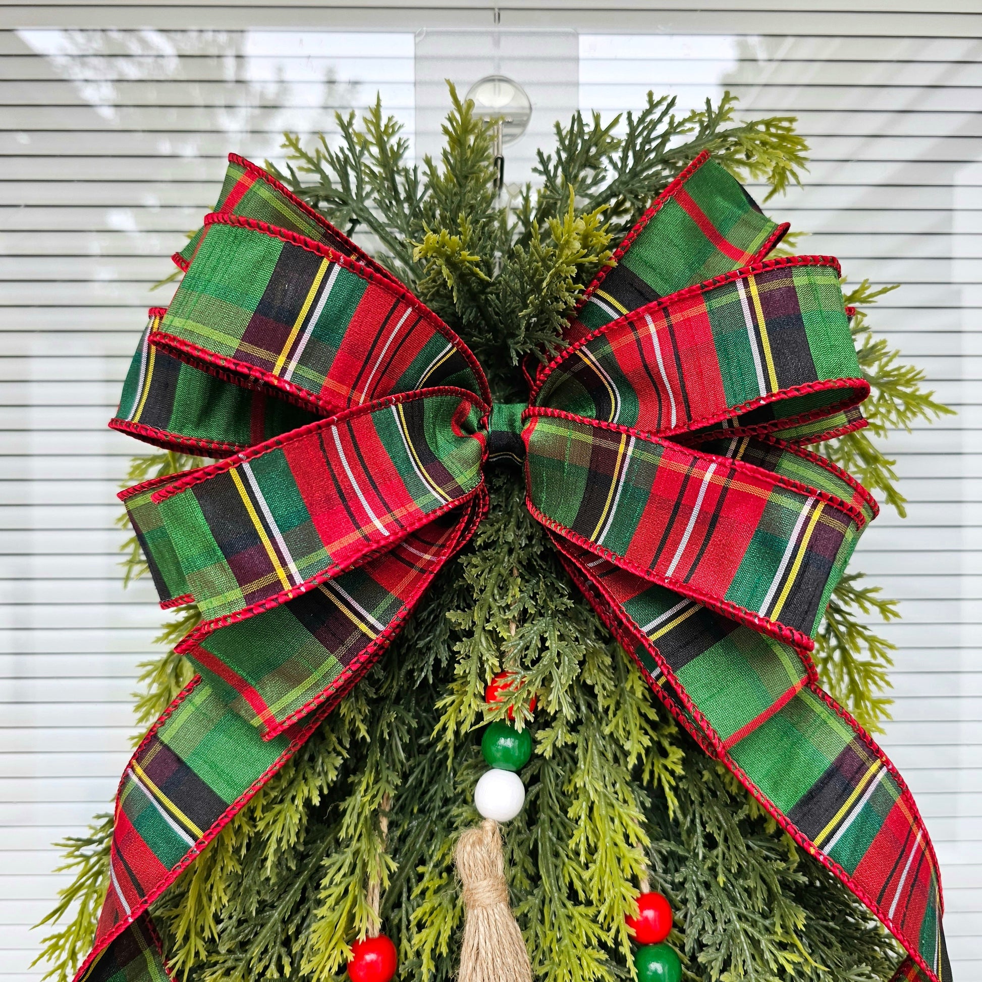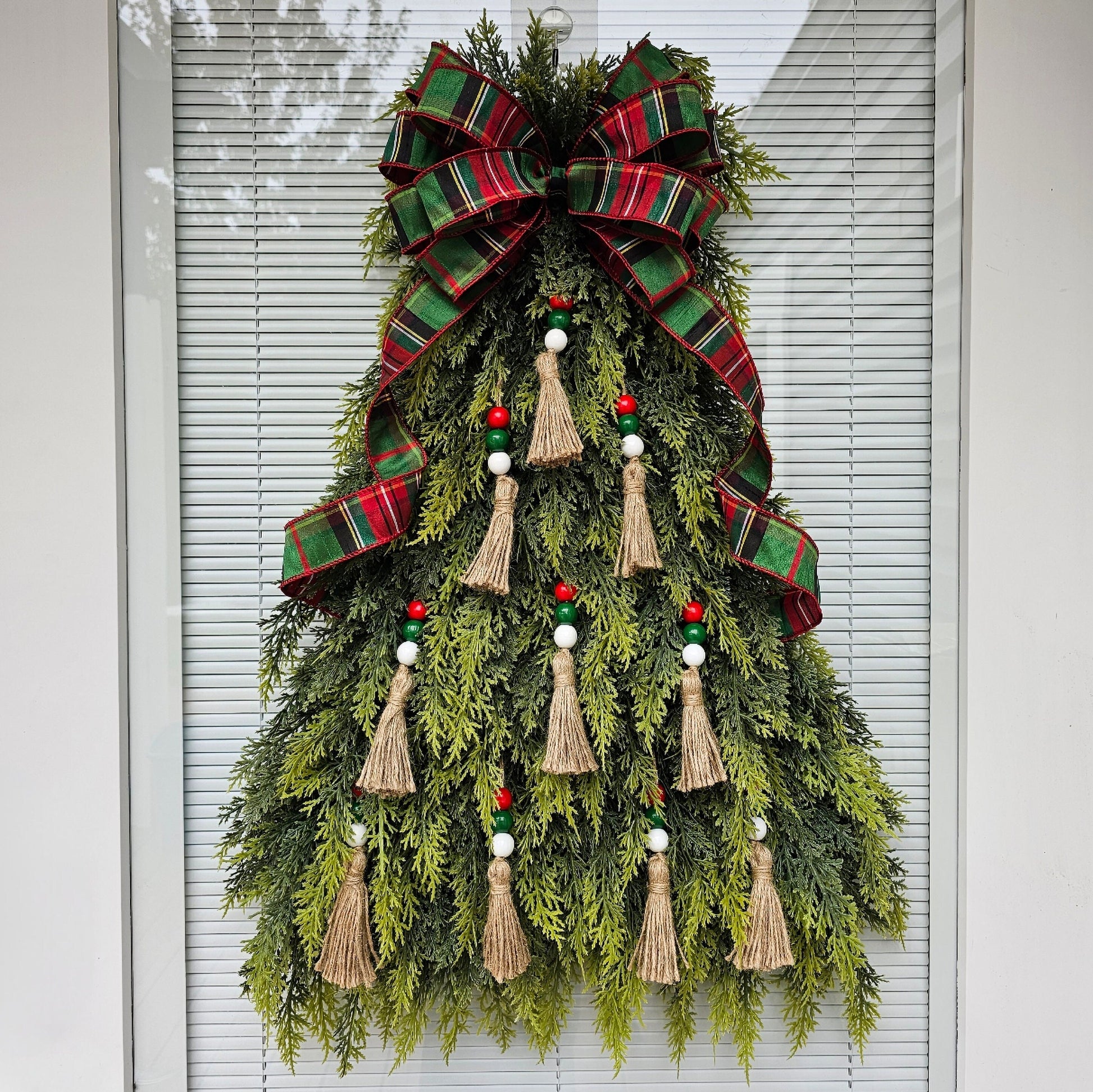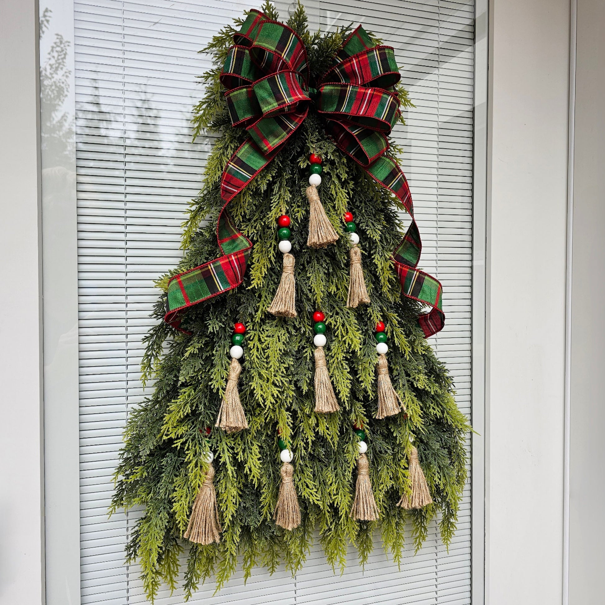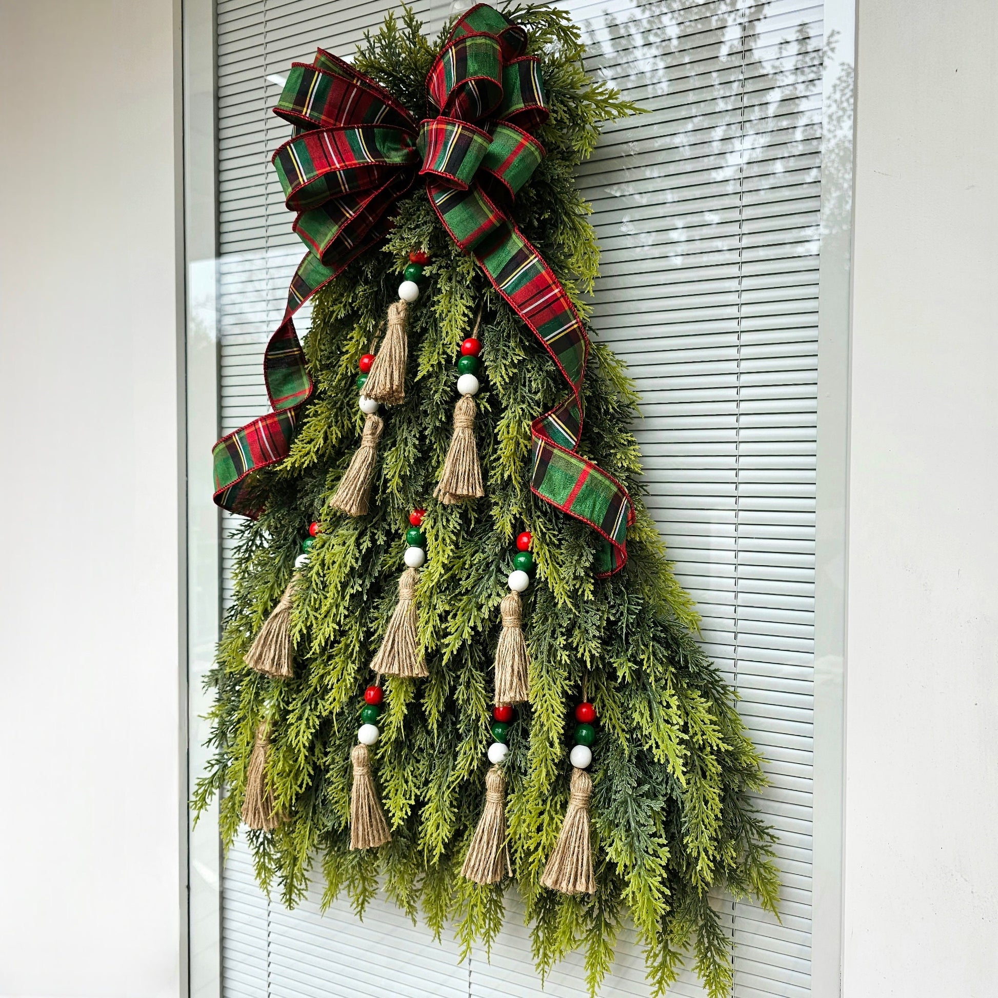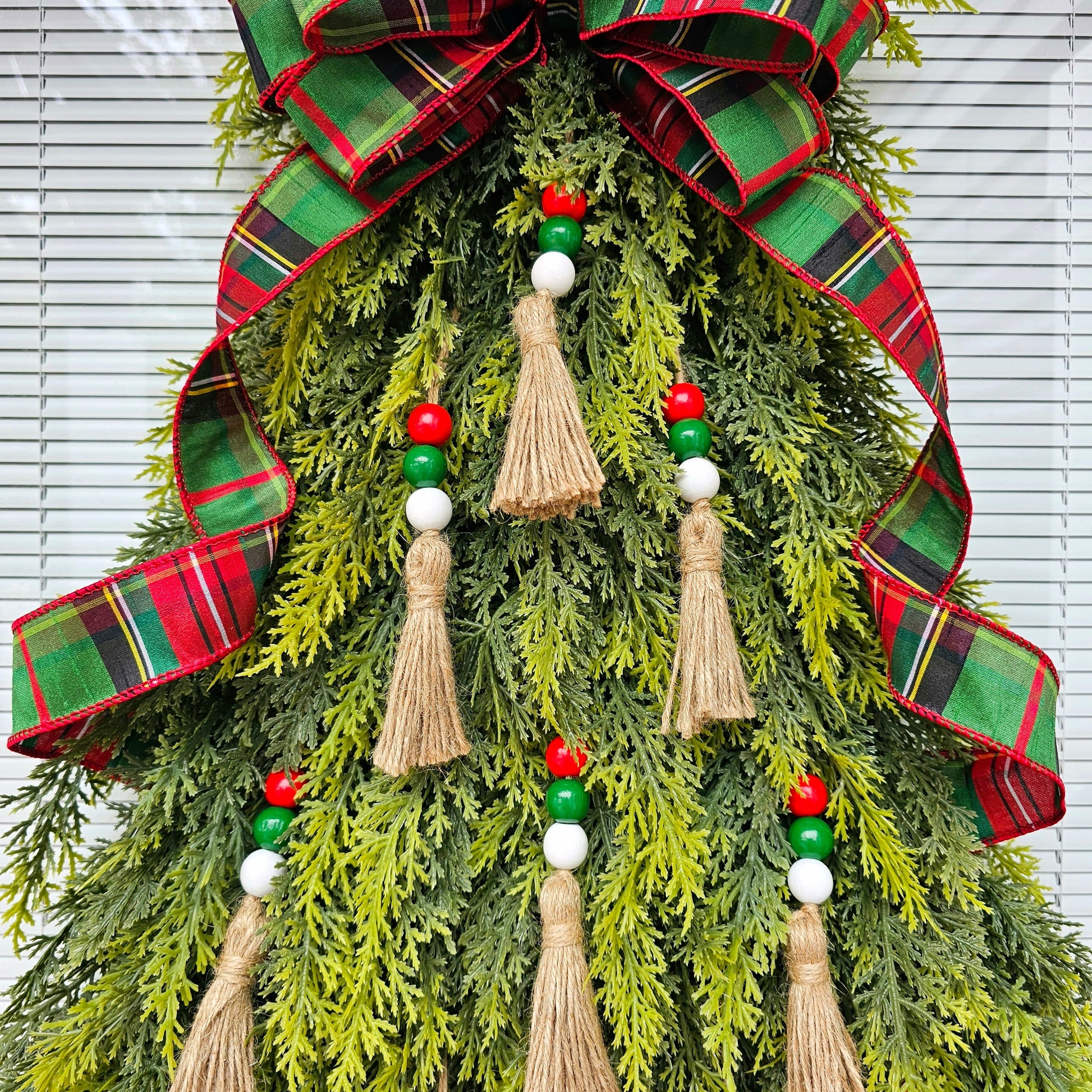This artifical Christmas tree wreath is crafted with soft, real-touch cedar leaves and red white green beaded tassel ornaments and topped with an elegant D Stevens wired bow.
