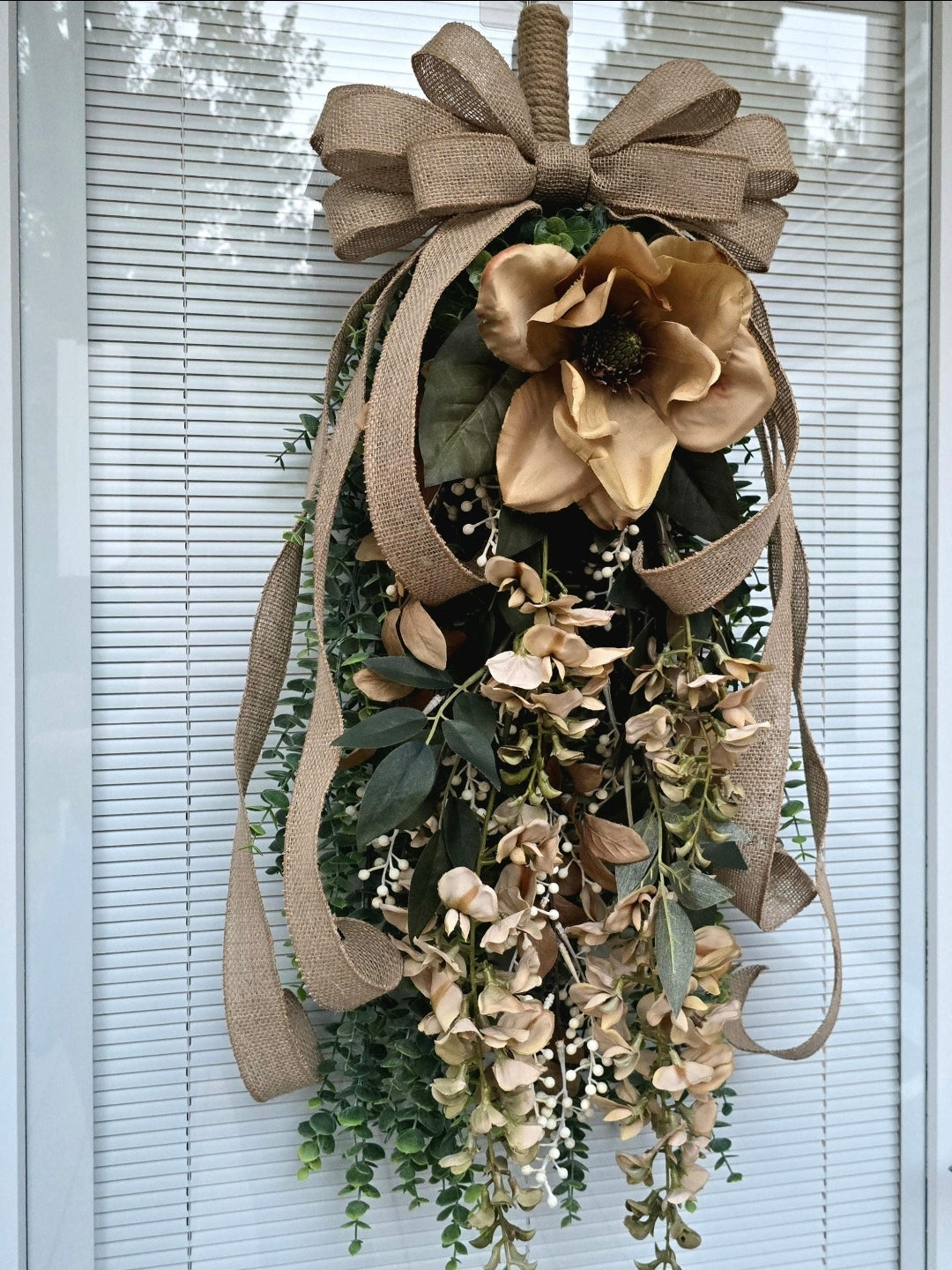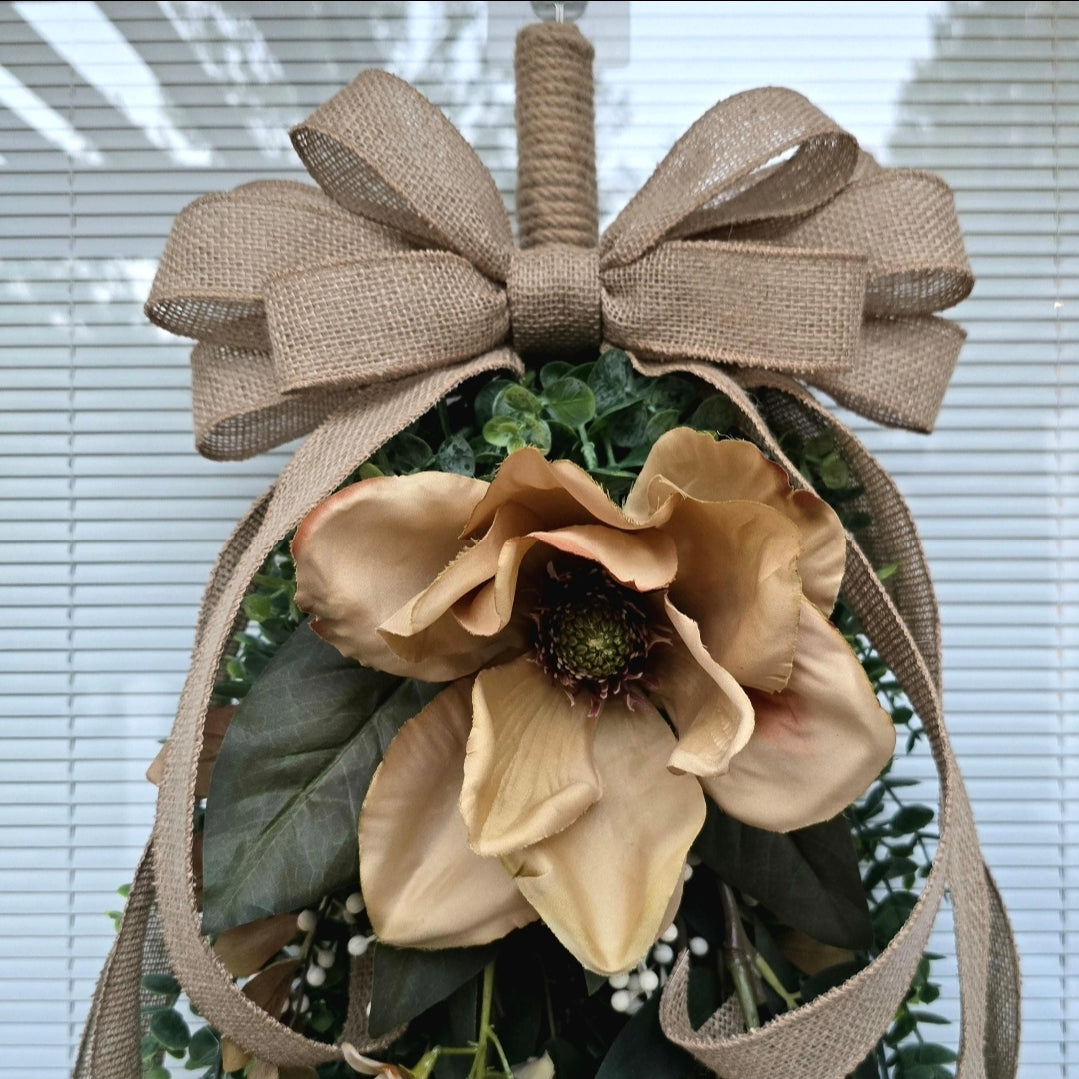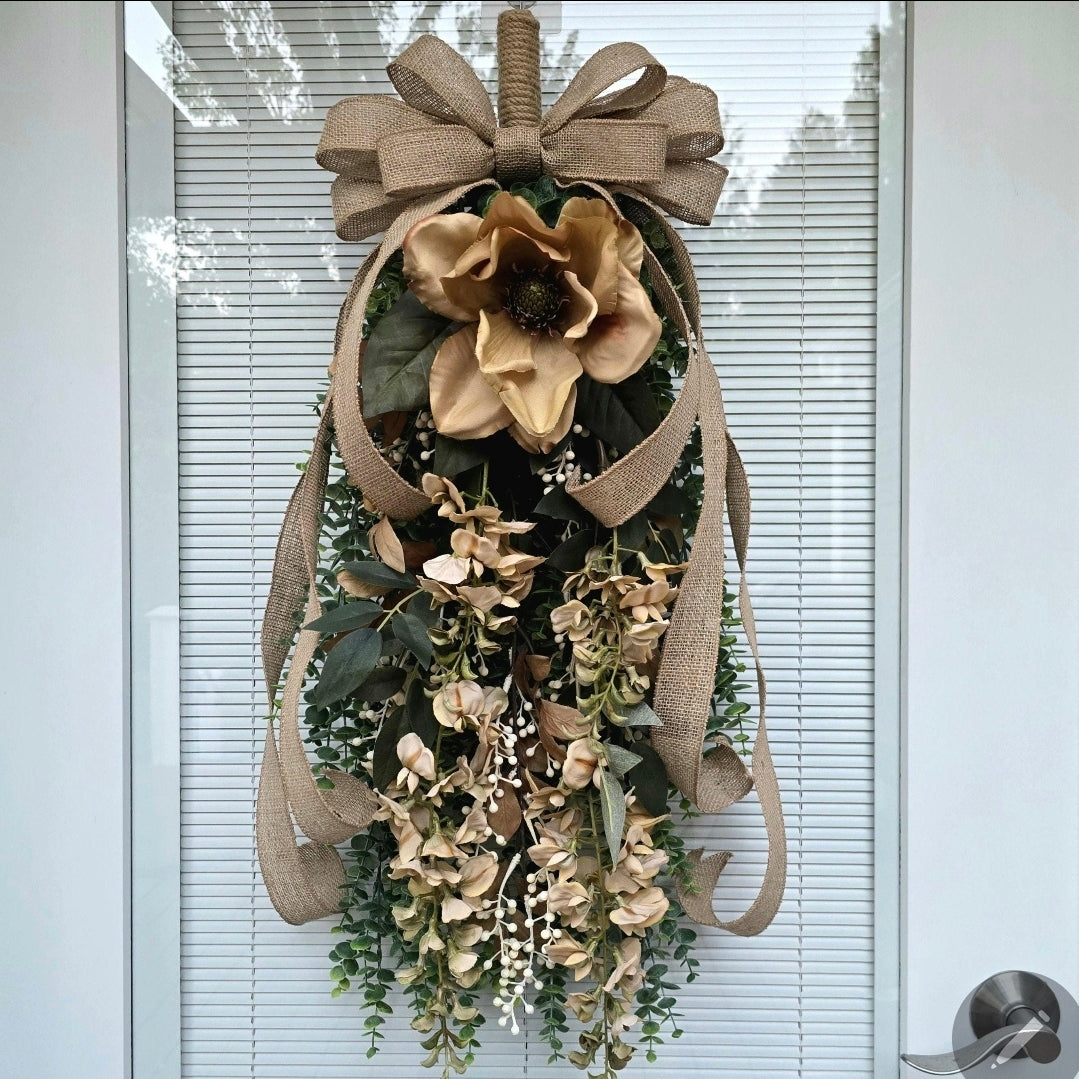 Welcome the autumn season with this handcrafted magnolia wreath swag, designed to bring rustic elegance and timeless charm to your home. Perfect for front doors, porches, and entryways, this unique piece blends farmhouse warmth with high-end craftsmanship.