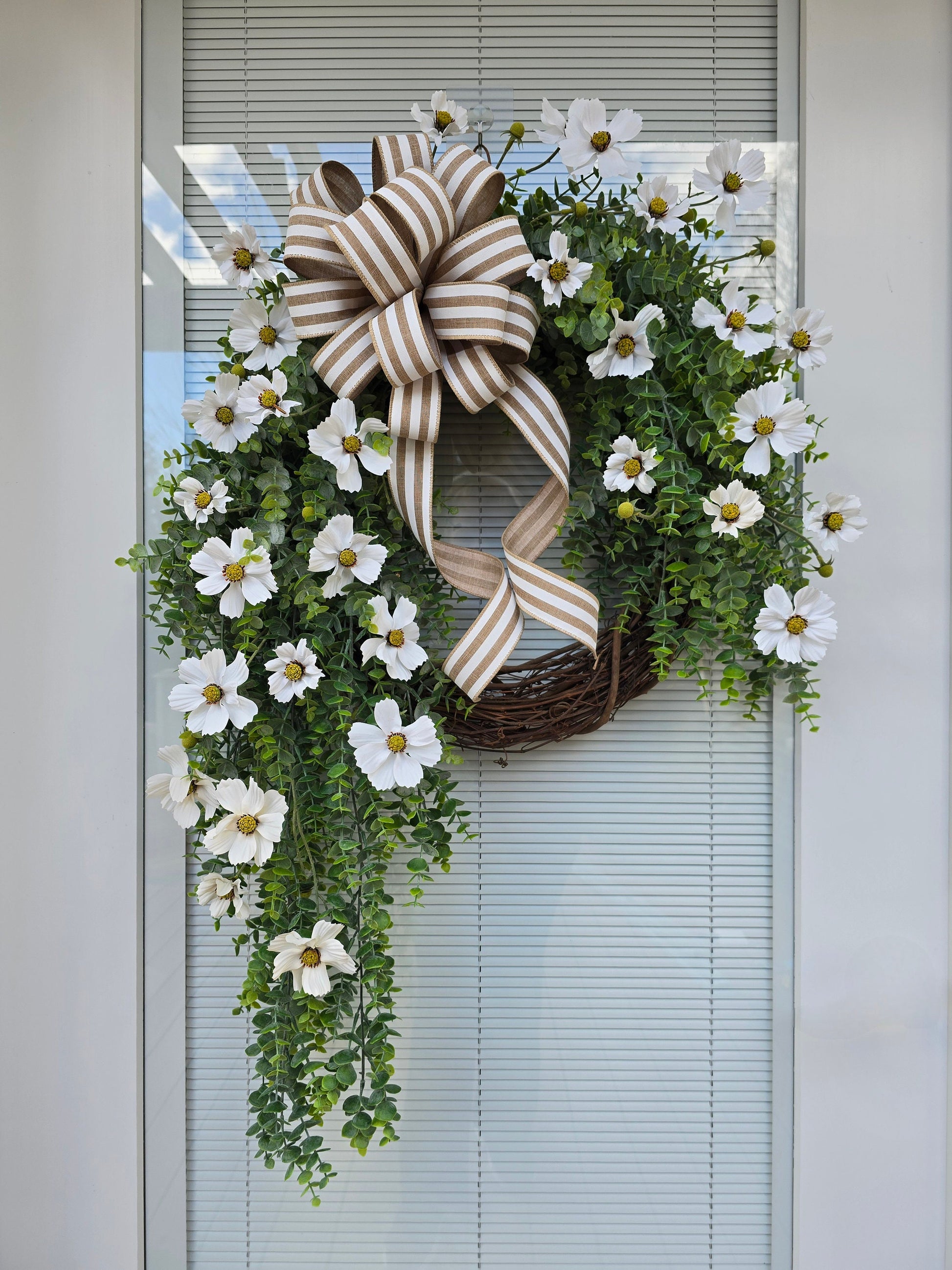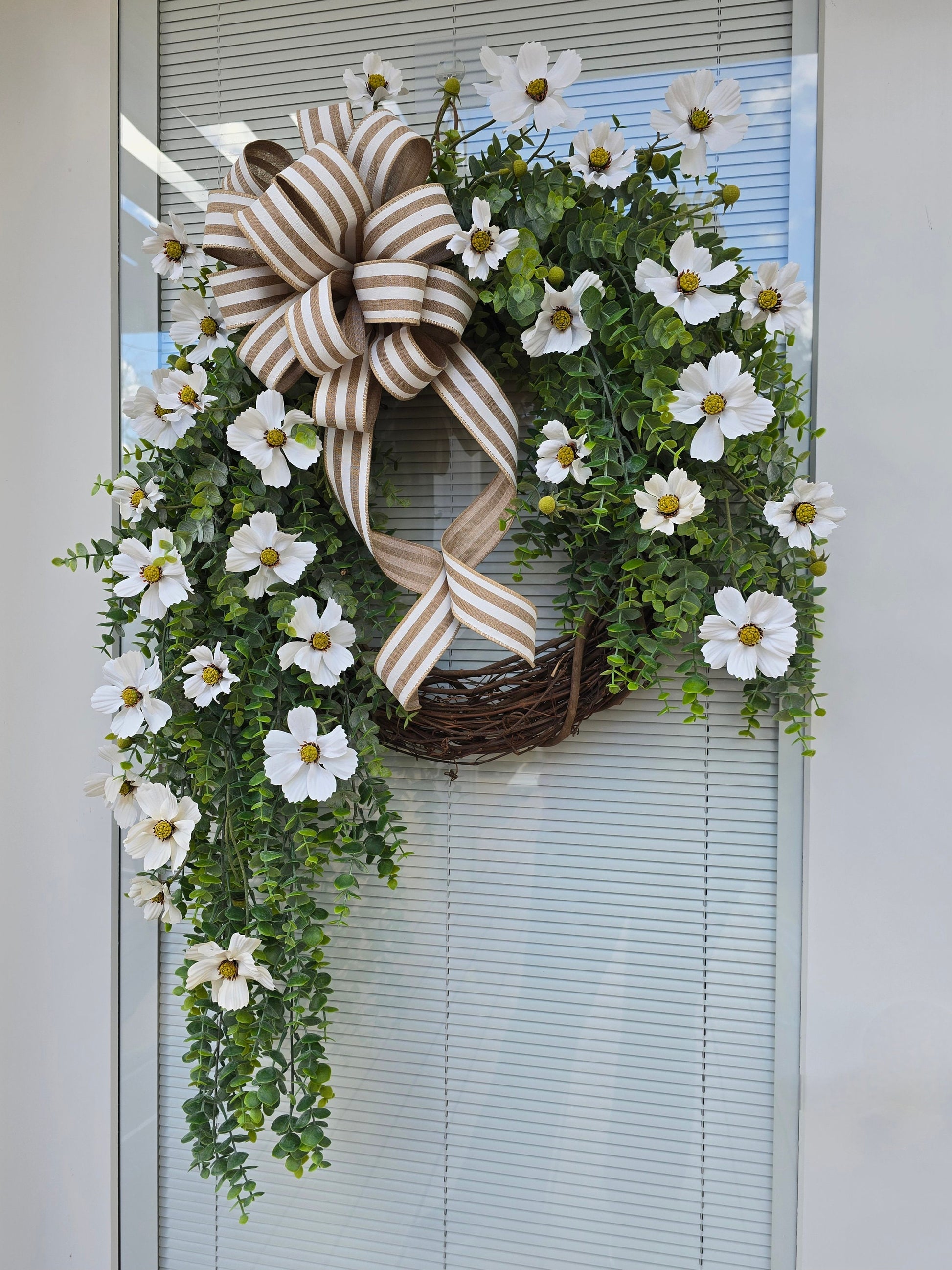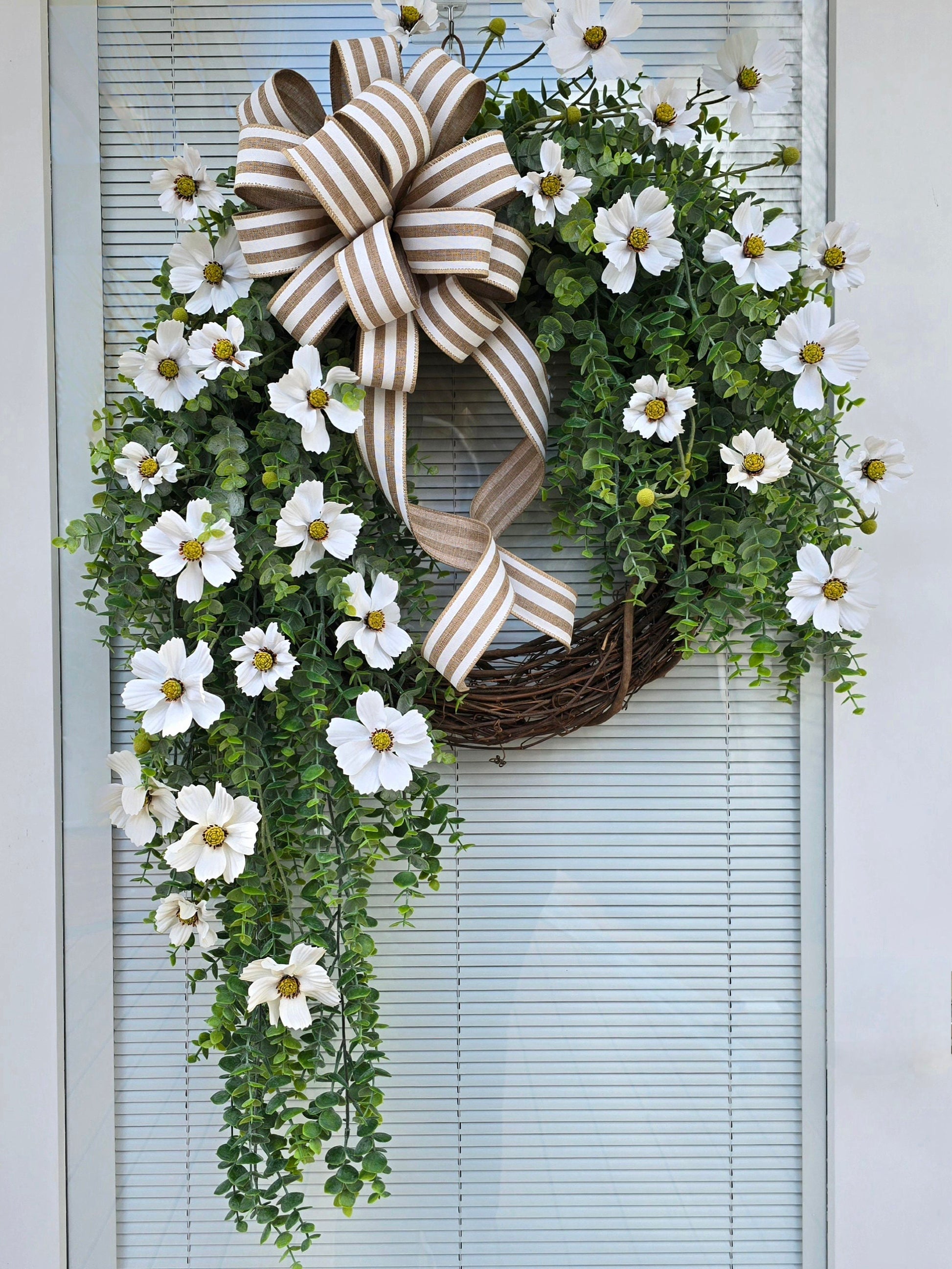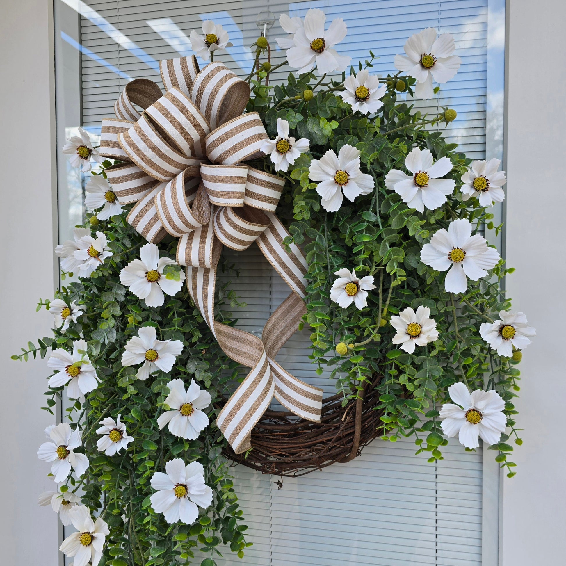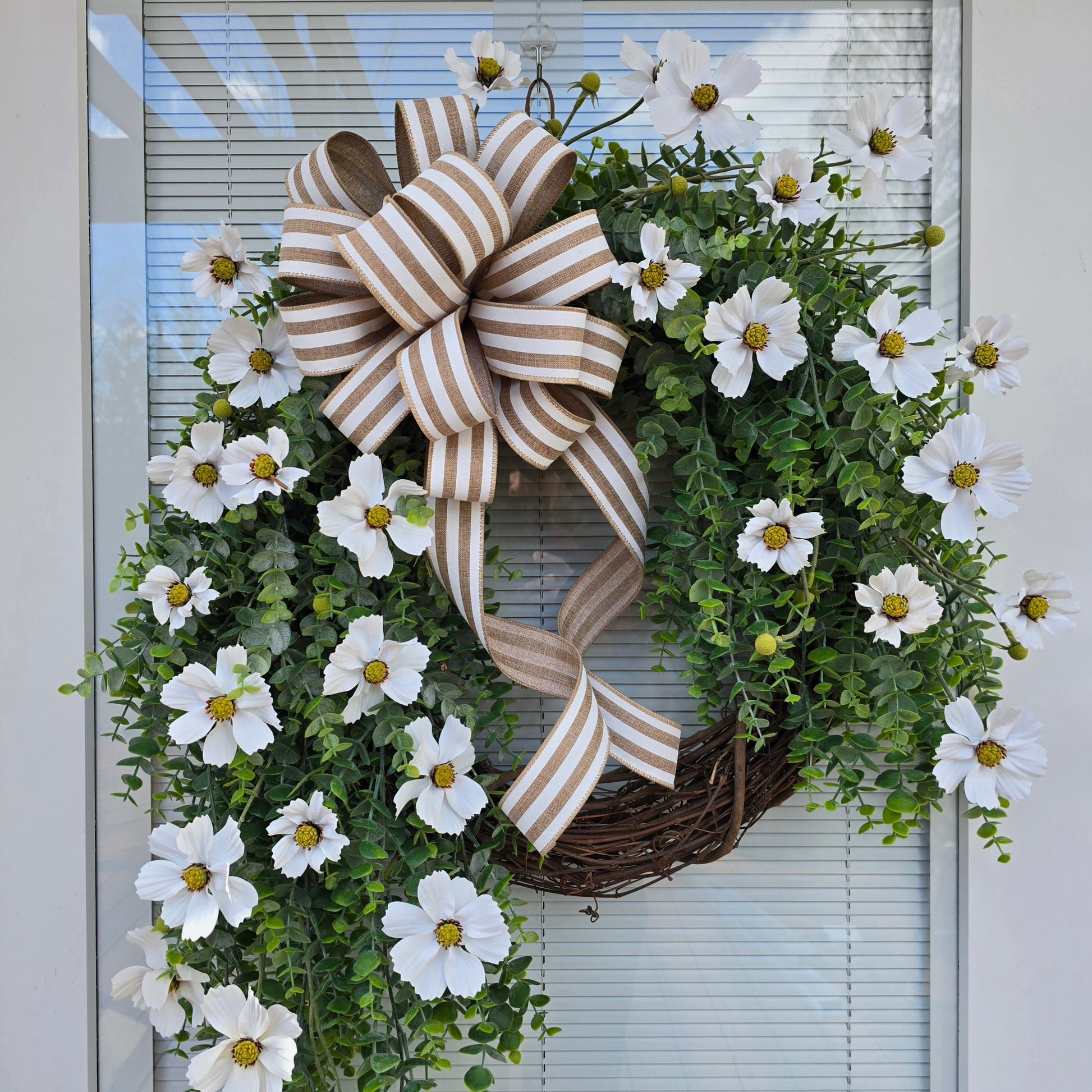 Indulge in luxury with this exquisite wreath crafted on a grapevine base. Adorned with elegant eucalyptus and pristine white cosmo flowers, topped with a sophisticated white burlap stripe bow.