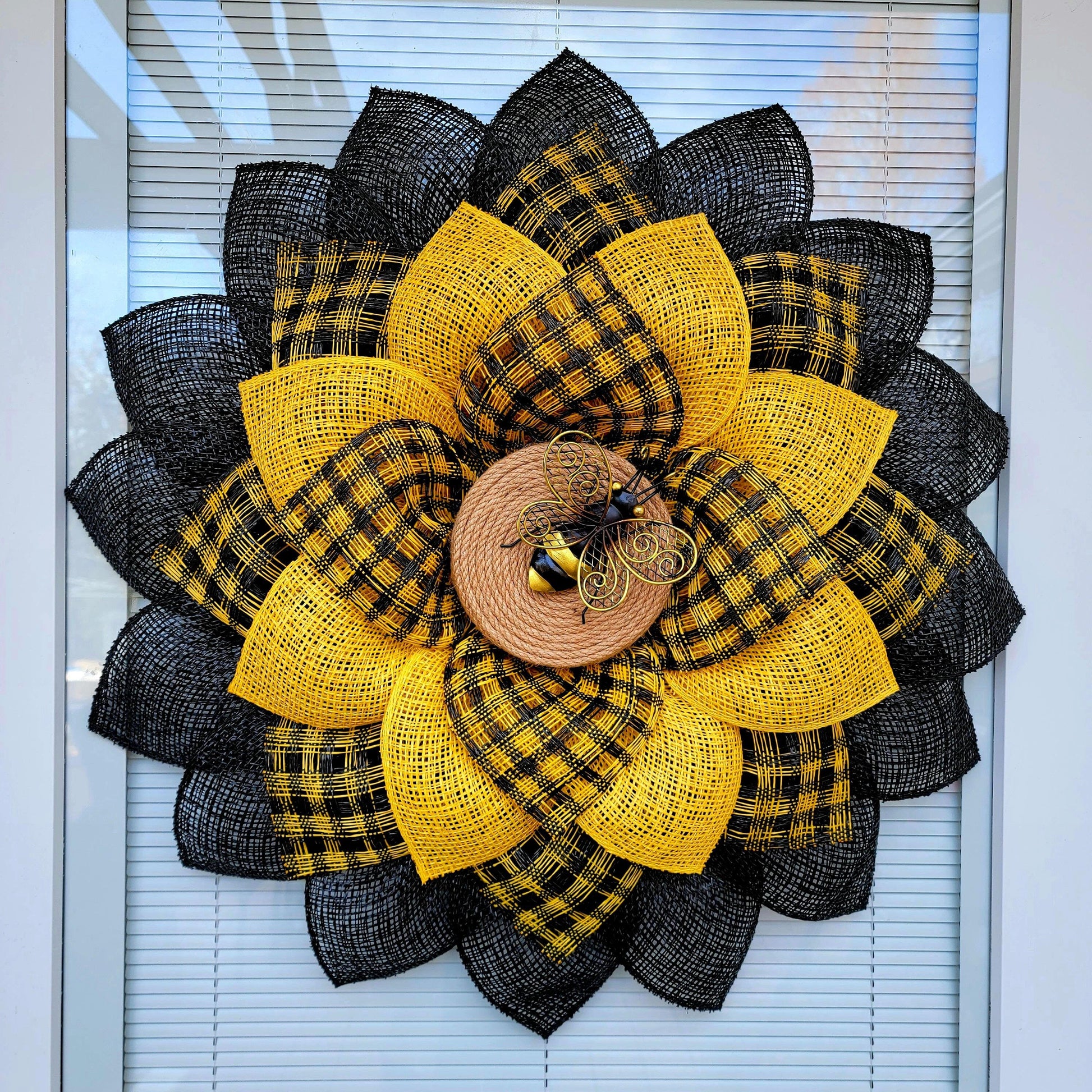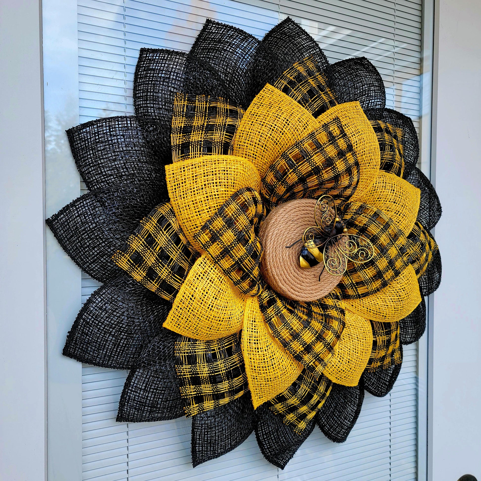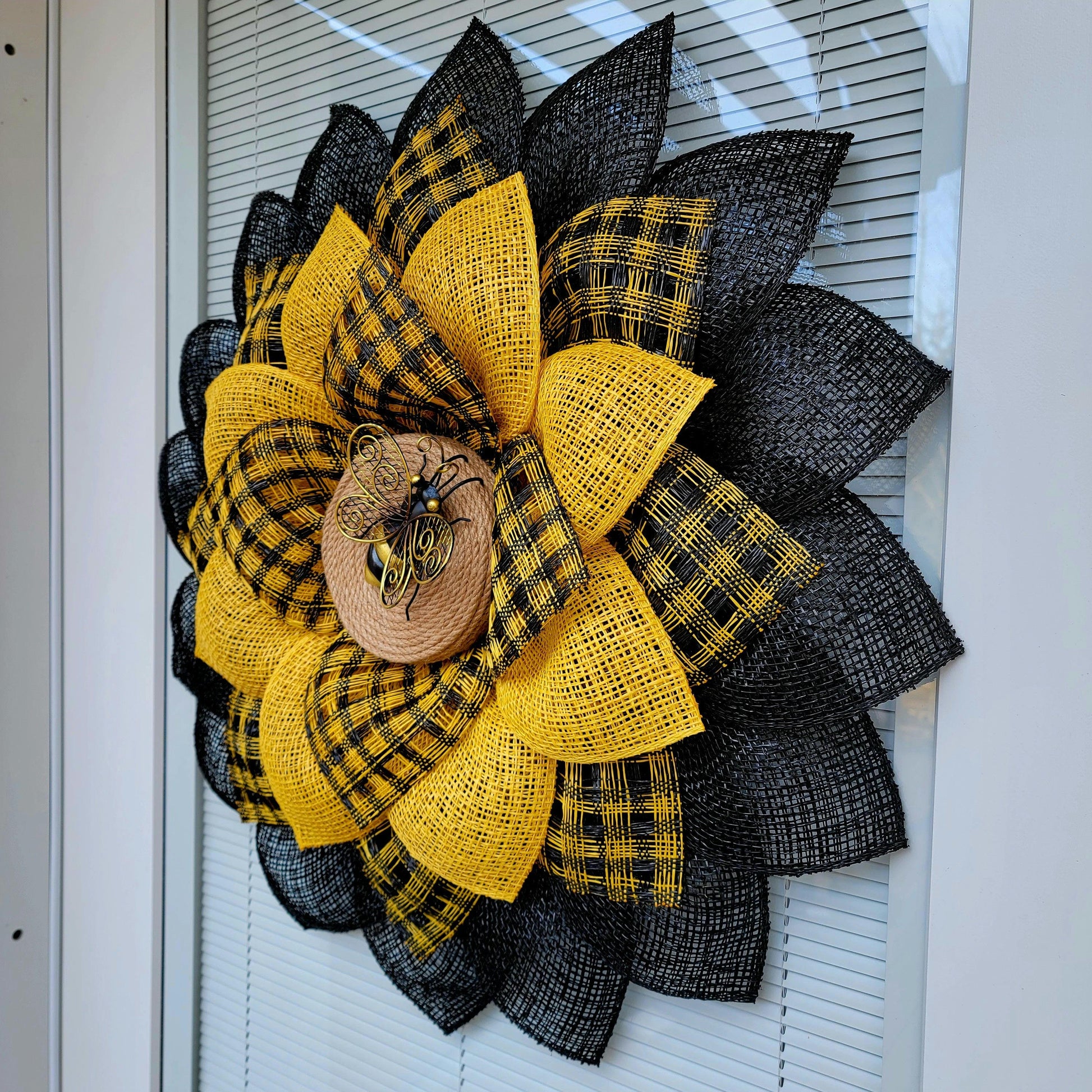 Enhance your home's curb appeal with our stunning double-door wreath, perfect for outdoor seasonal decor. This large, yellow, and black burlap flower wreath makes a beautiful gift for any occasion.