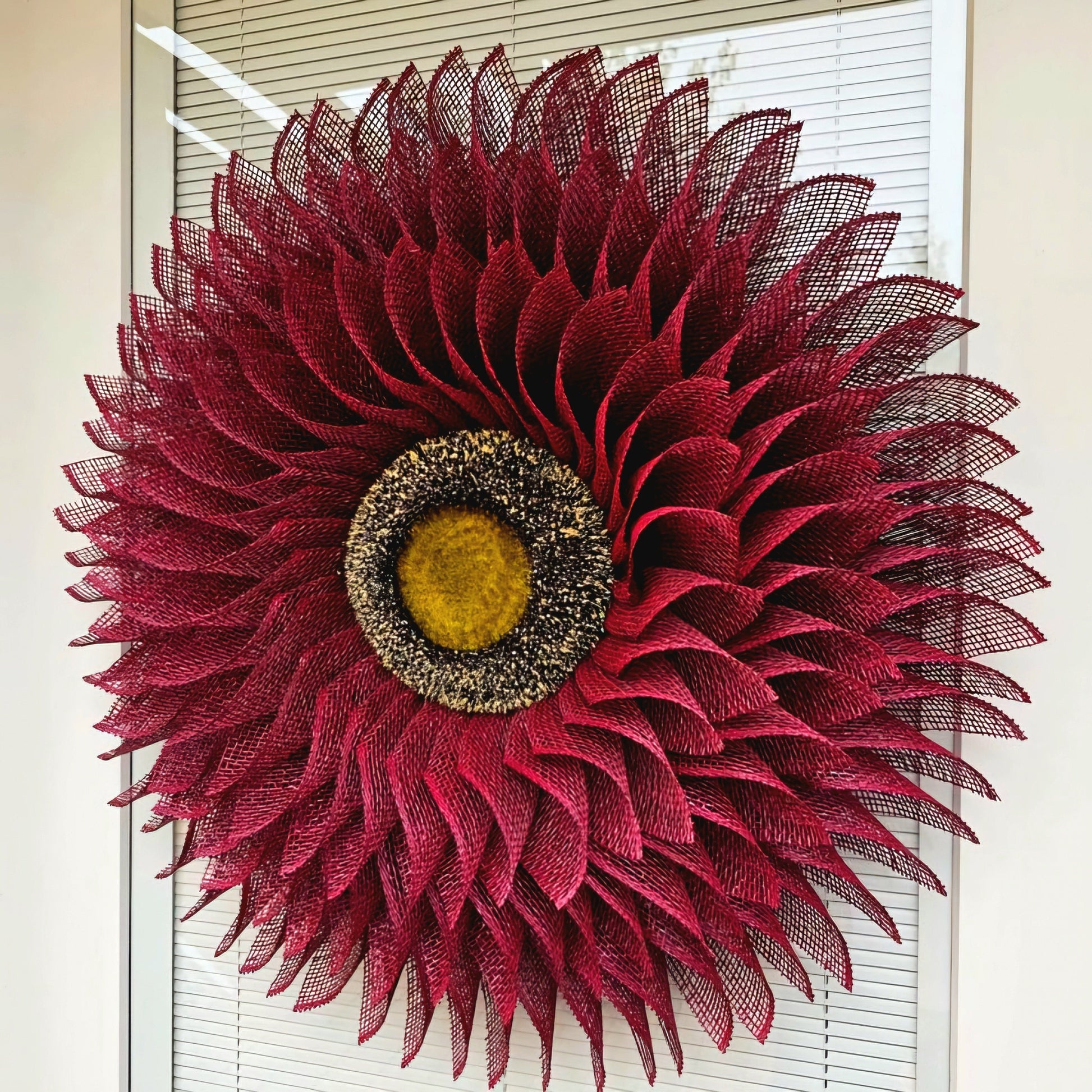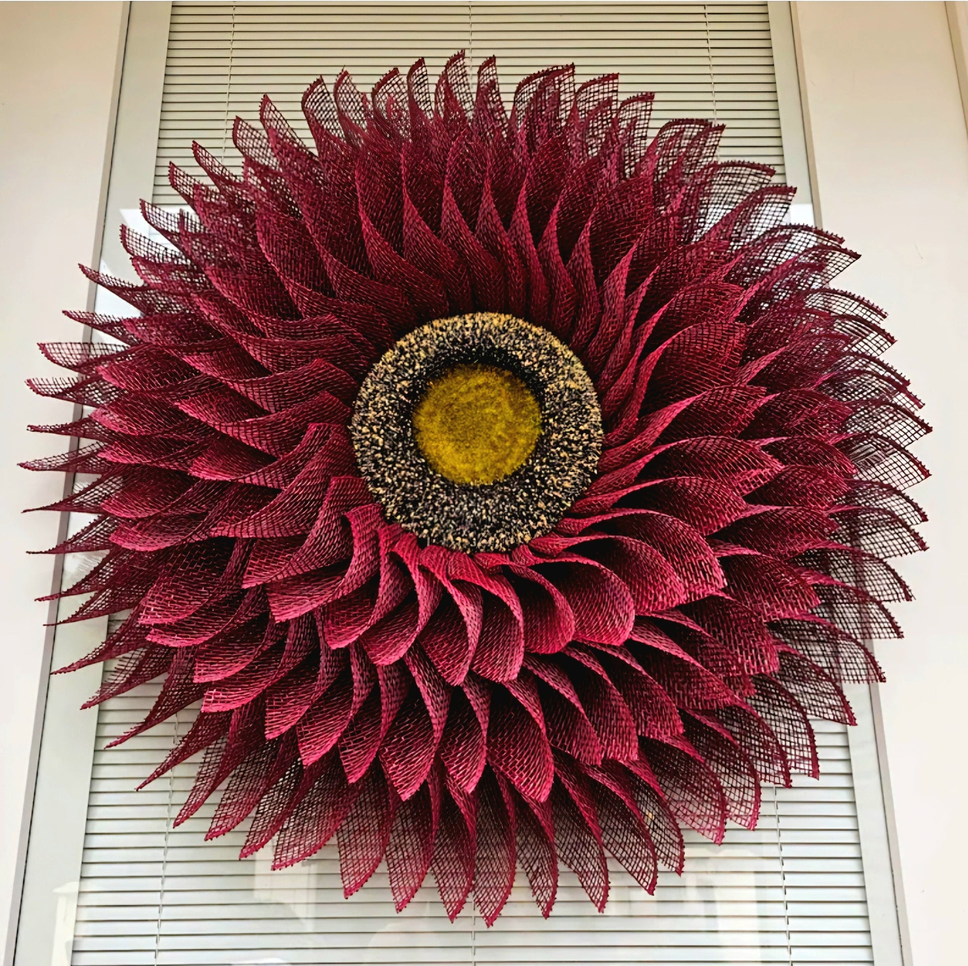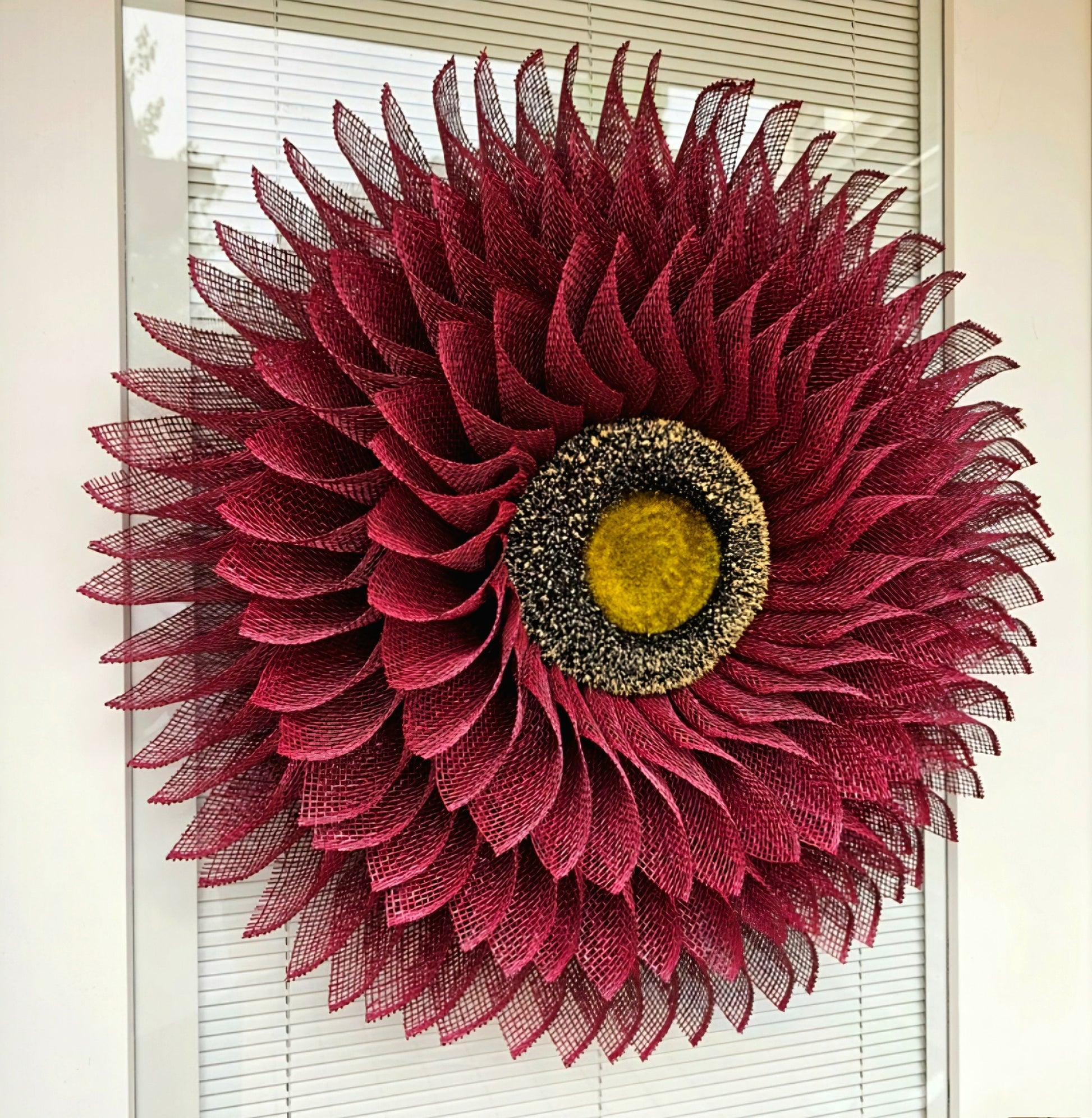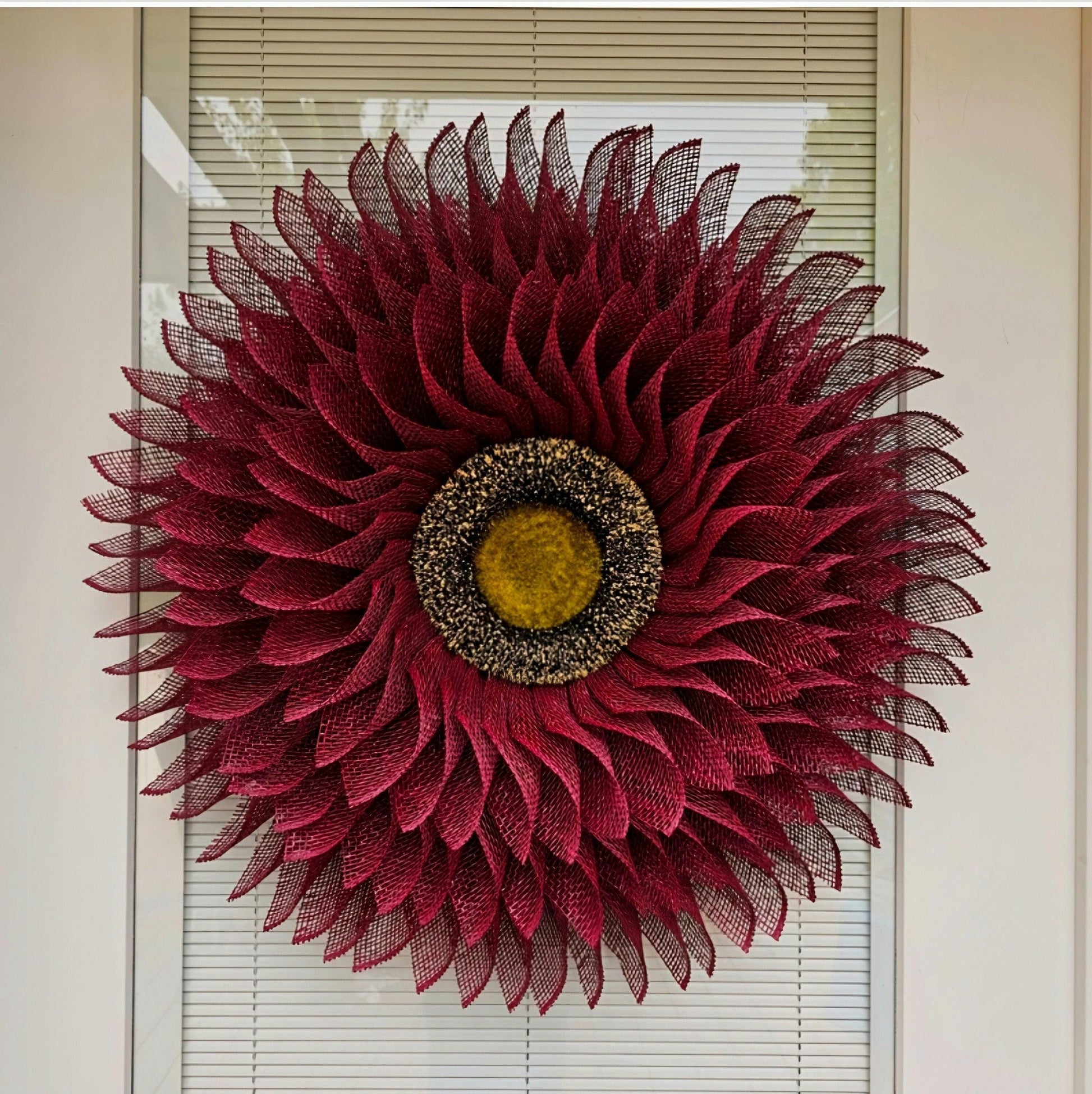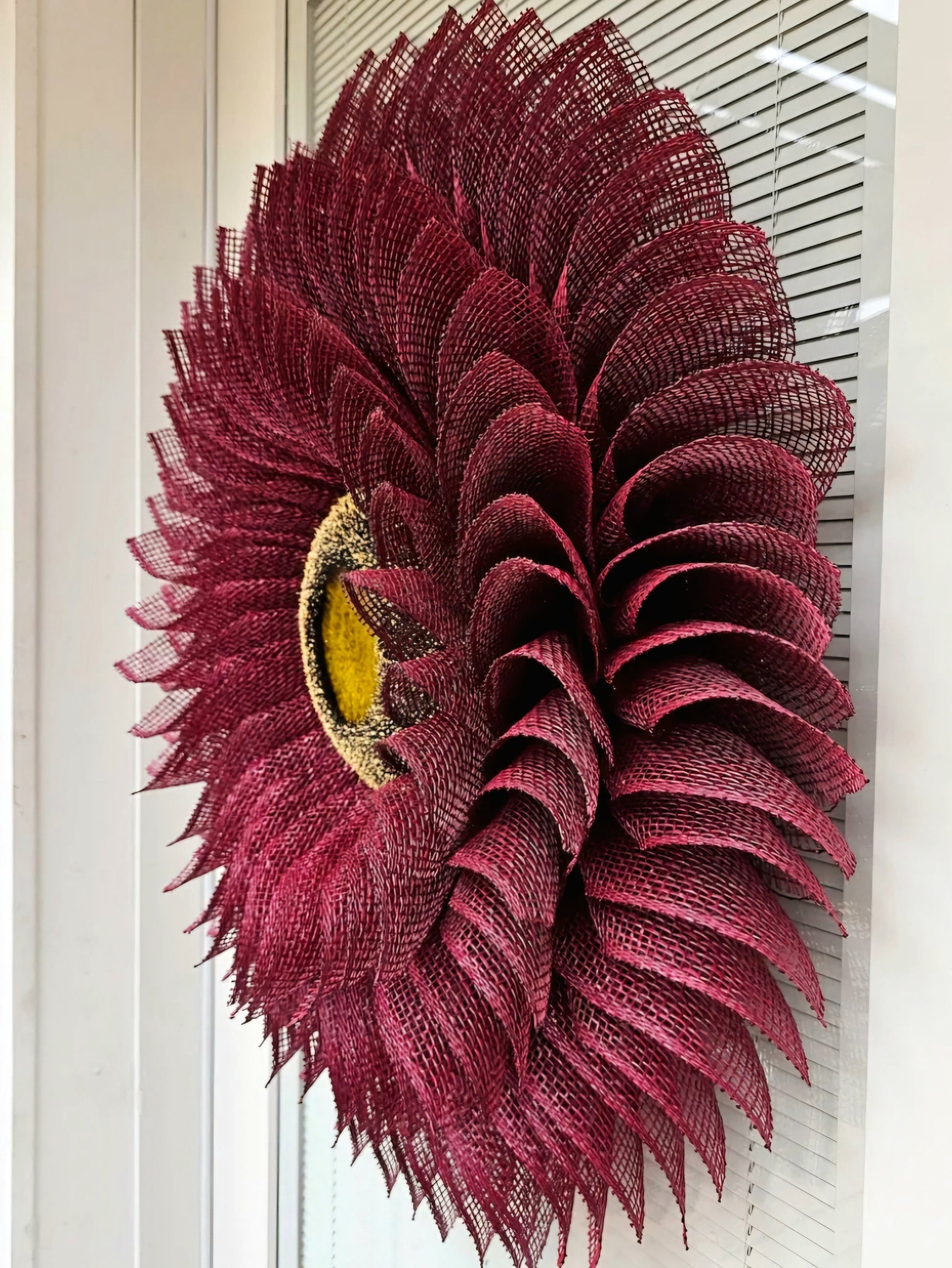 Decorate your home with our handcrafted indoor/outdoor burlap flower wreath. Perfect for your front door, porch decor, or as a stunning wall decoration. This wreath is available in assorted colors and sizes to suit your style.