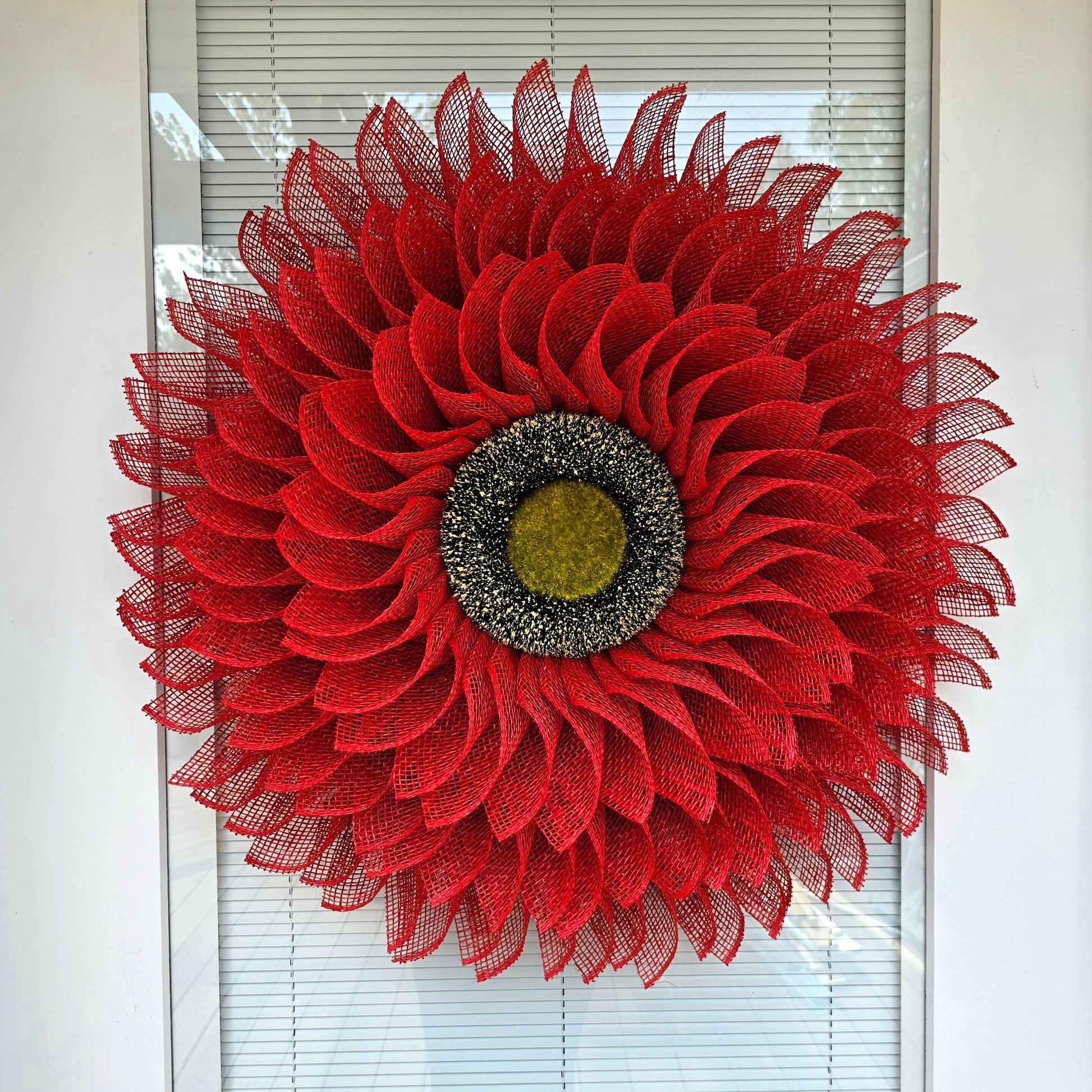 Decorate your home with our handcrafted indoor/outdoor burlap flower wreath. Perfect for your front door, porch, or as a stunning wall decoration. This wreath is available in assorted colors and sizes to suit your style.