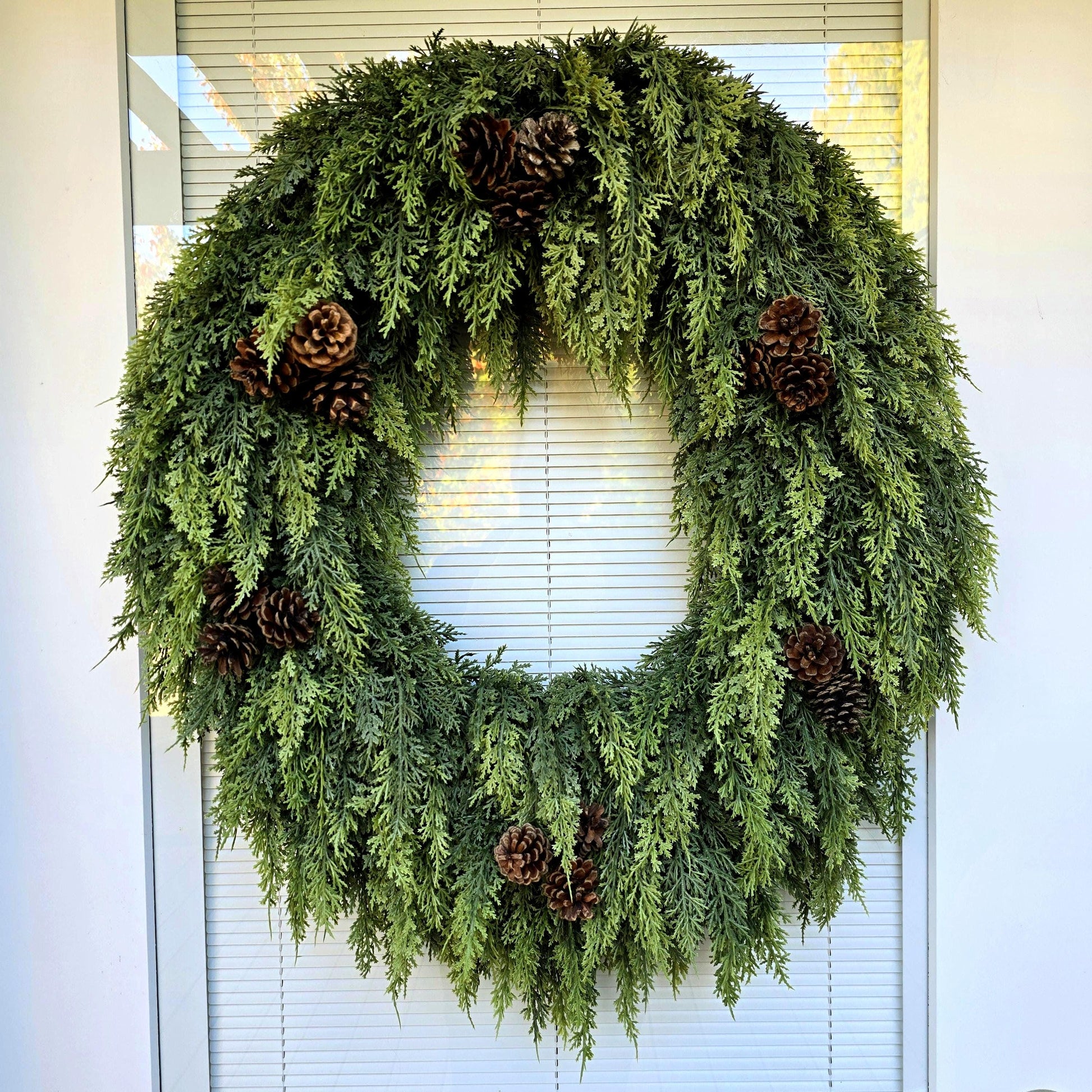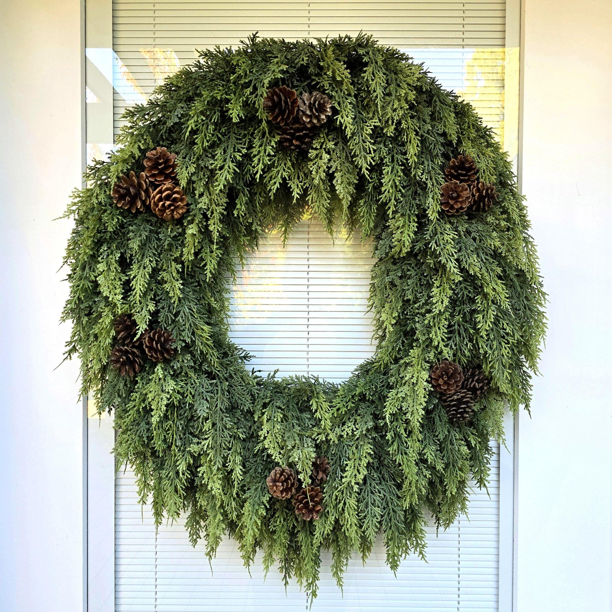 This meticulously handcrafted evergreen Christmas wreath brings festive charm to your front door this winter season. Built on a circular grapevine base and decorated with lush, real-touch cedar, natural pinecones, and cascading greenery, it offers a rich, full look to make any entrance stand out. Perfect for indoor or outdoor use, this classic wreath will bring warmth and holiday cheer for years to come.