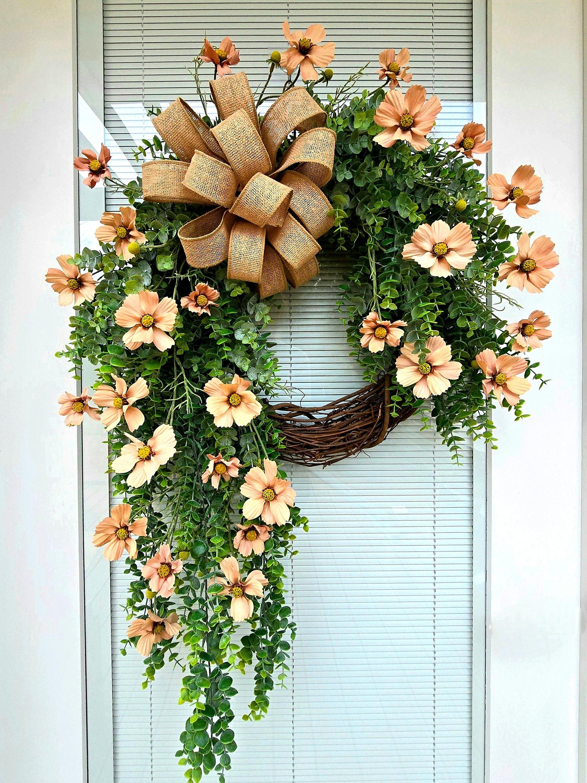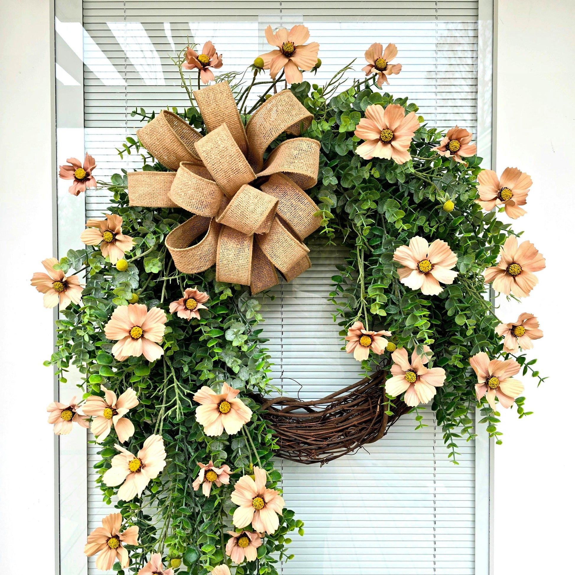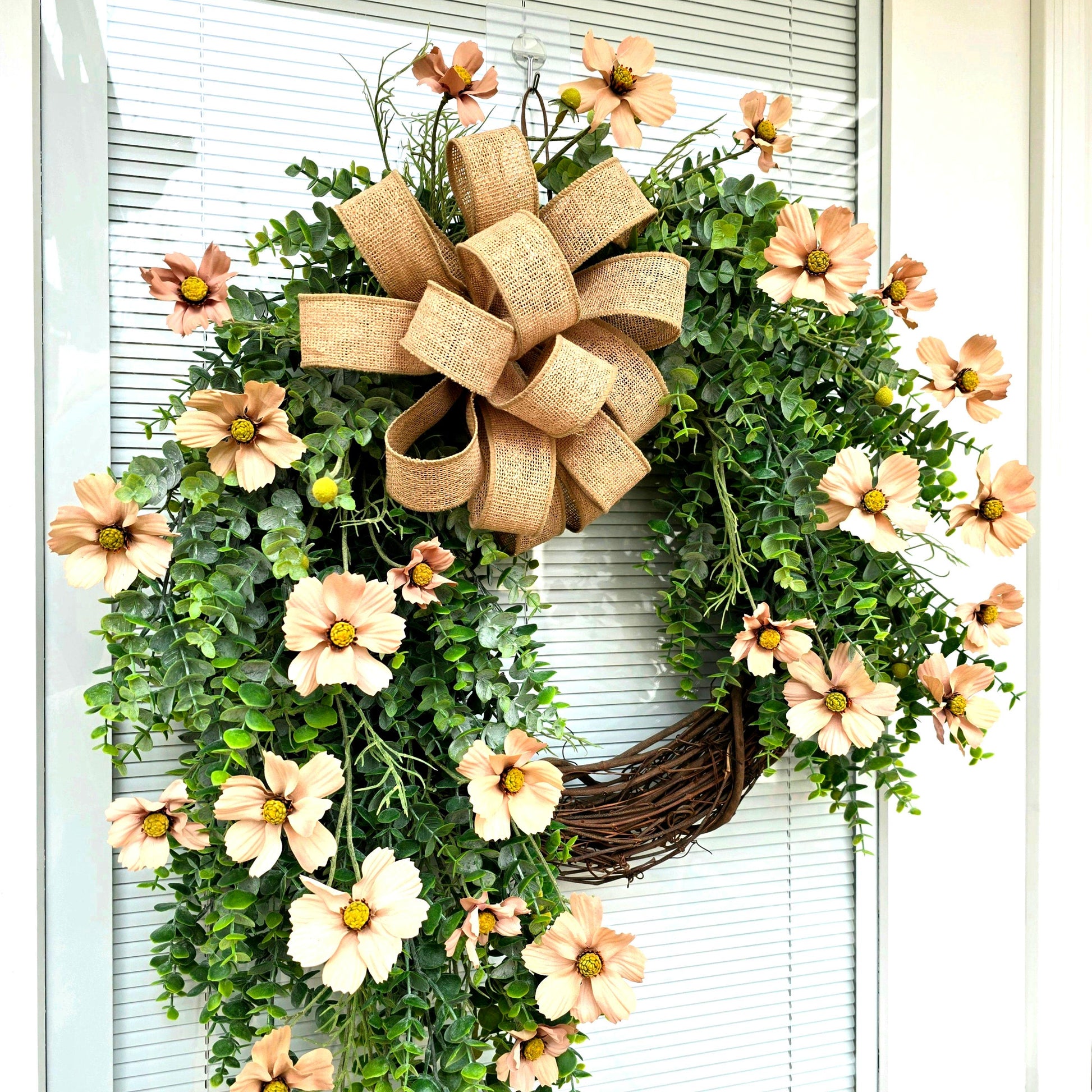 Indulge in luxury with this exquisite wreath crafted on a grapevine base with elegant eucalyptus and cosmo flowers, topped with a sophisticated burlap wired bow.