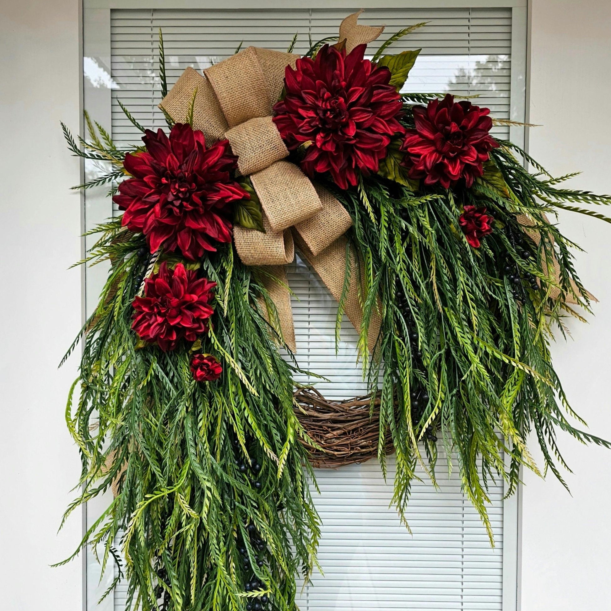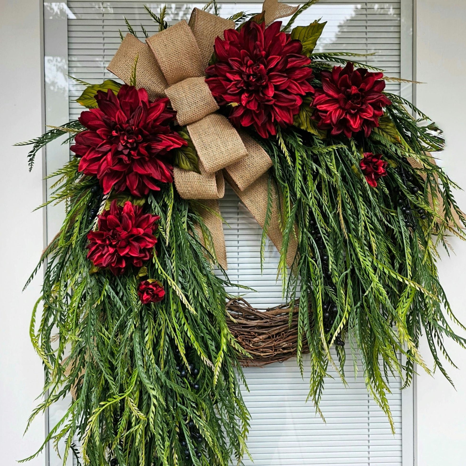 Make a statement with this stunning handcrafted wreath featuring vibrant, deep red florals and a charming burlap bow, perfect for adding a touch of rustic elegance to your home. This versatile wreath, set on a grapevine base, is ideal for year-round display, complementing seasonal decor for spring, summer, fall, and even the holiday season. Whether you're looking to enhance your front door, porch, or interior space, this wreath's timeless design is sure to impress.